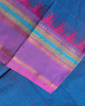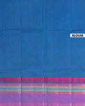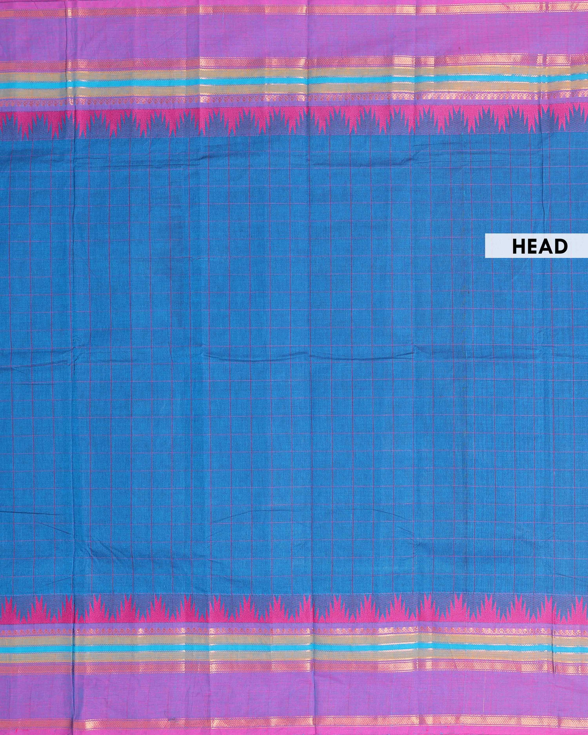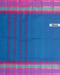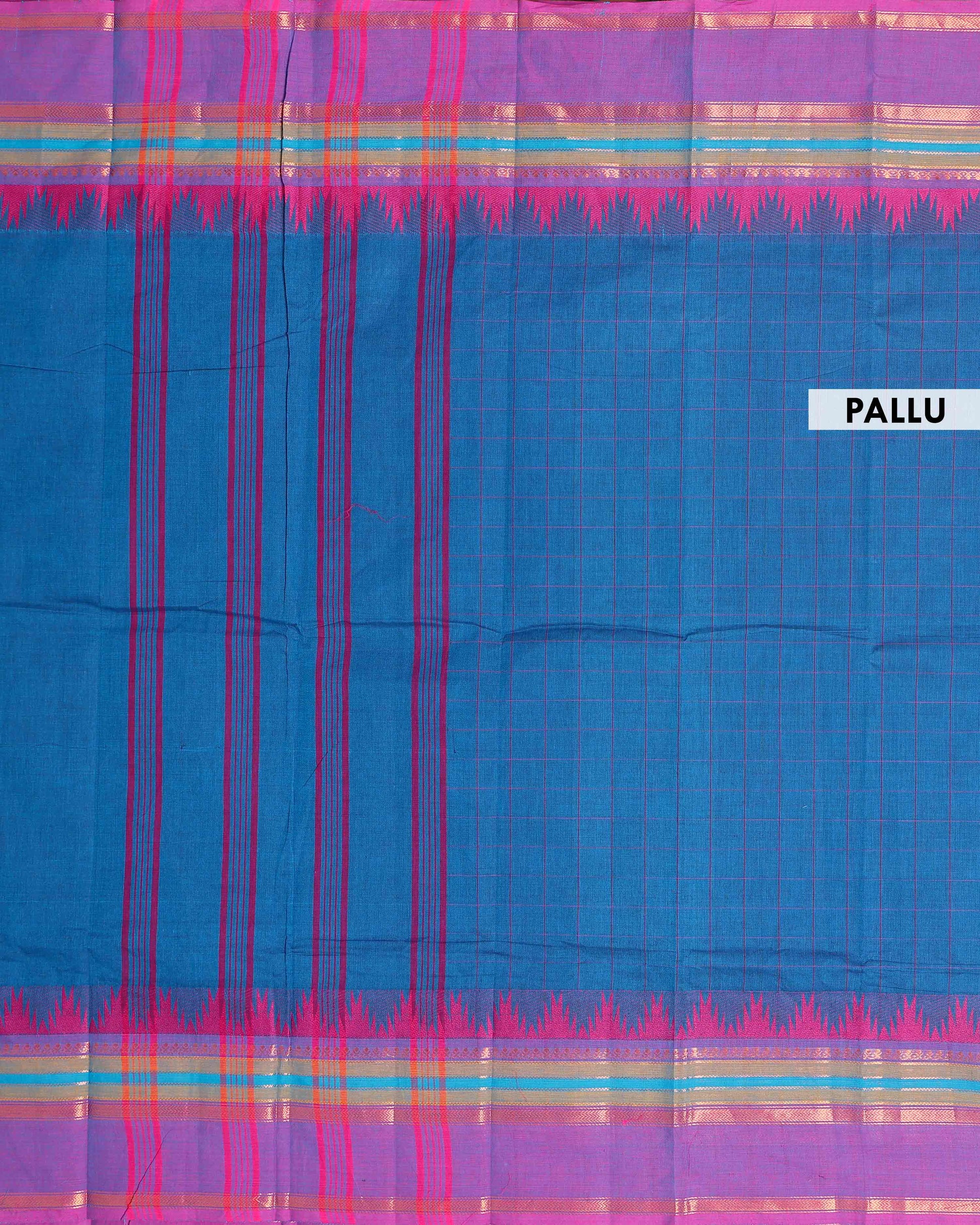 - This handloom Chettinad cotton saree a vibrant blue body with a subtle checkered pattern, offering a graceful drape and comfortable feel