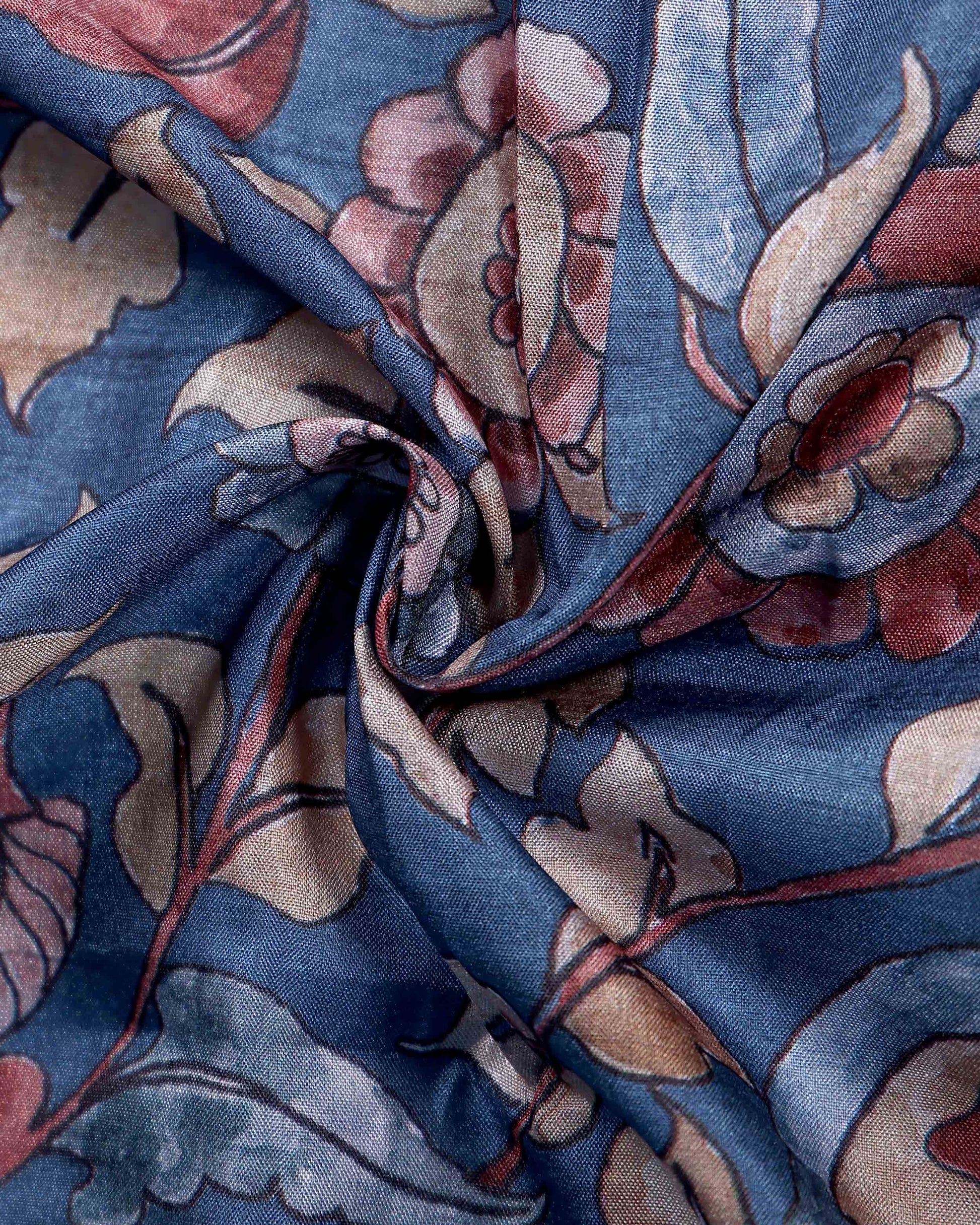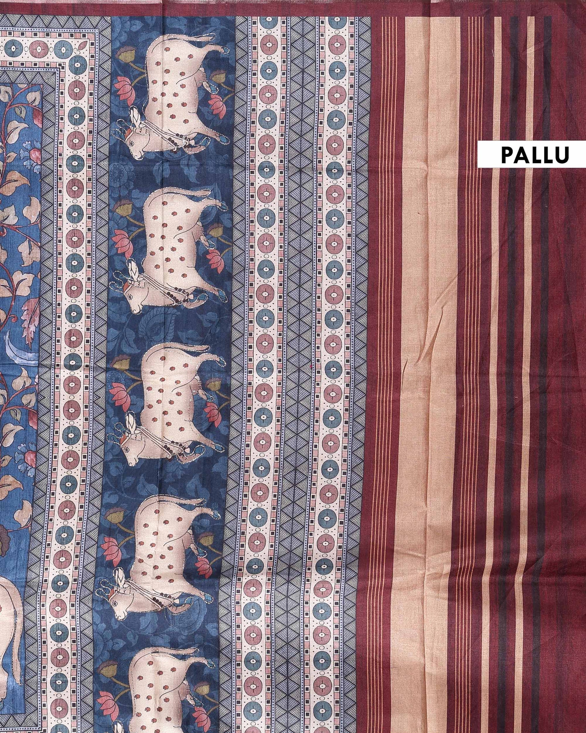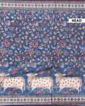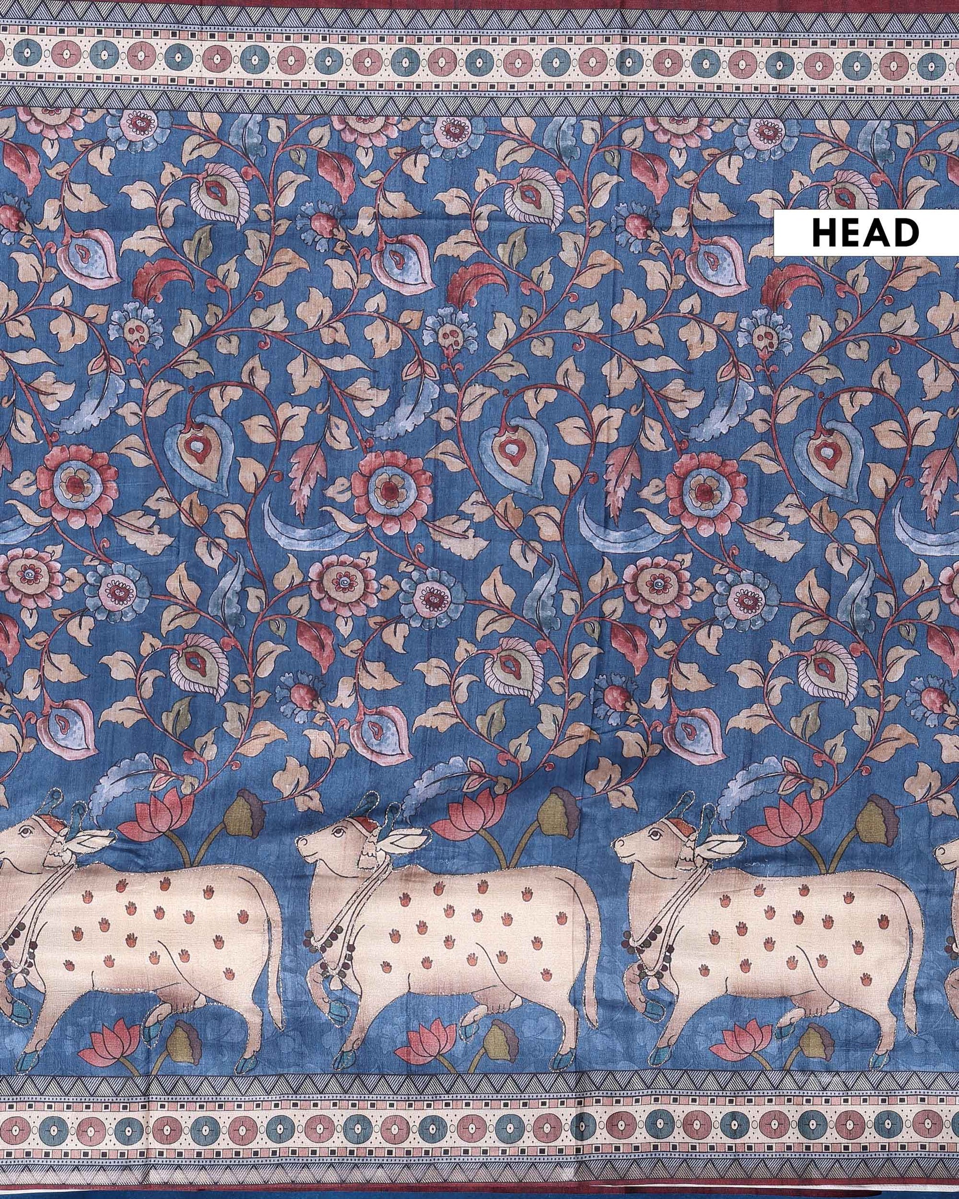 - This stunning blue Dola saree intricate kalamkari style floral prints and unique cow motifs on the border