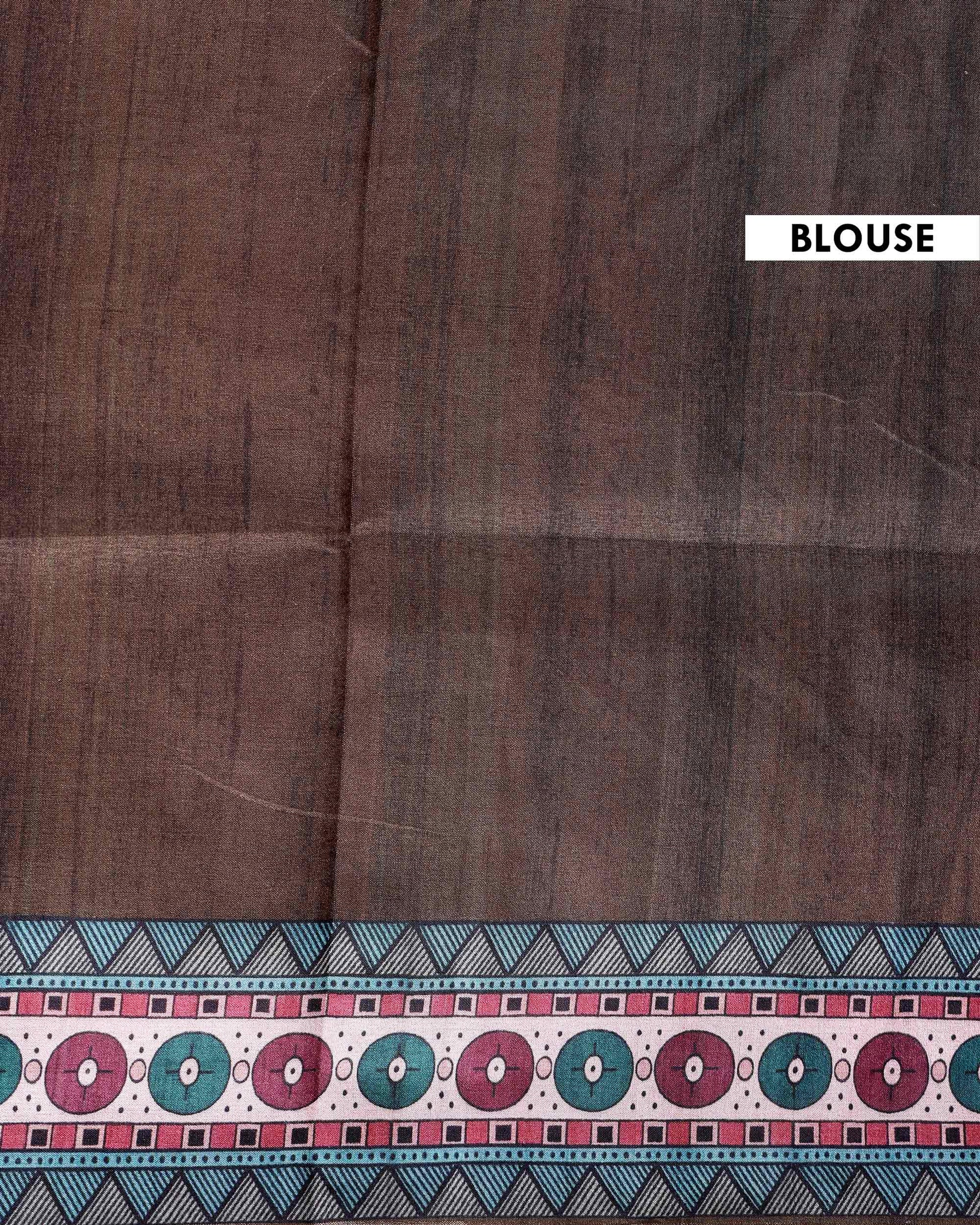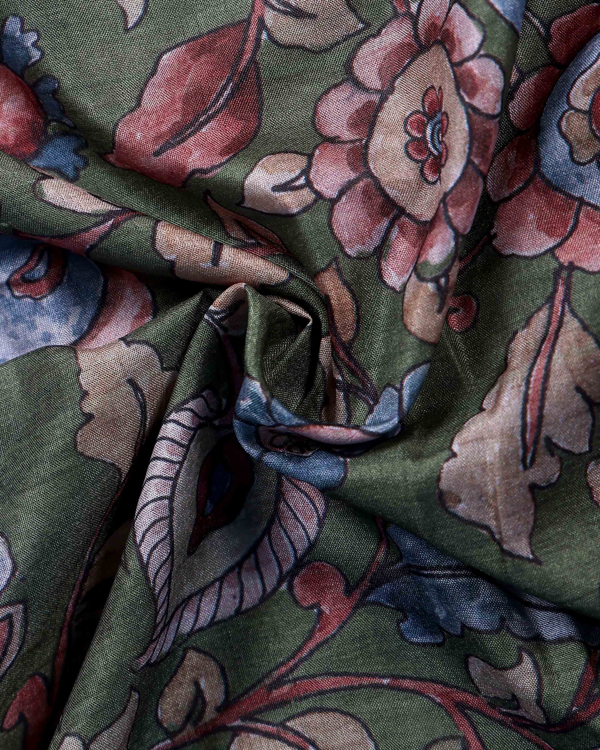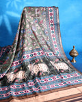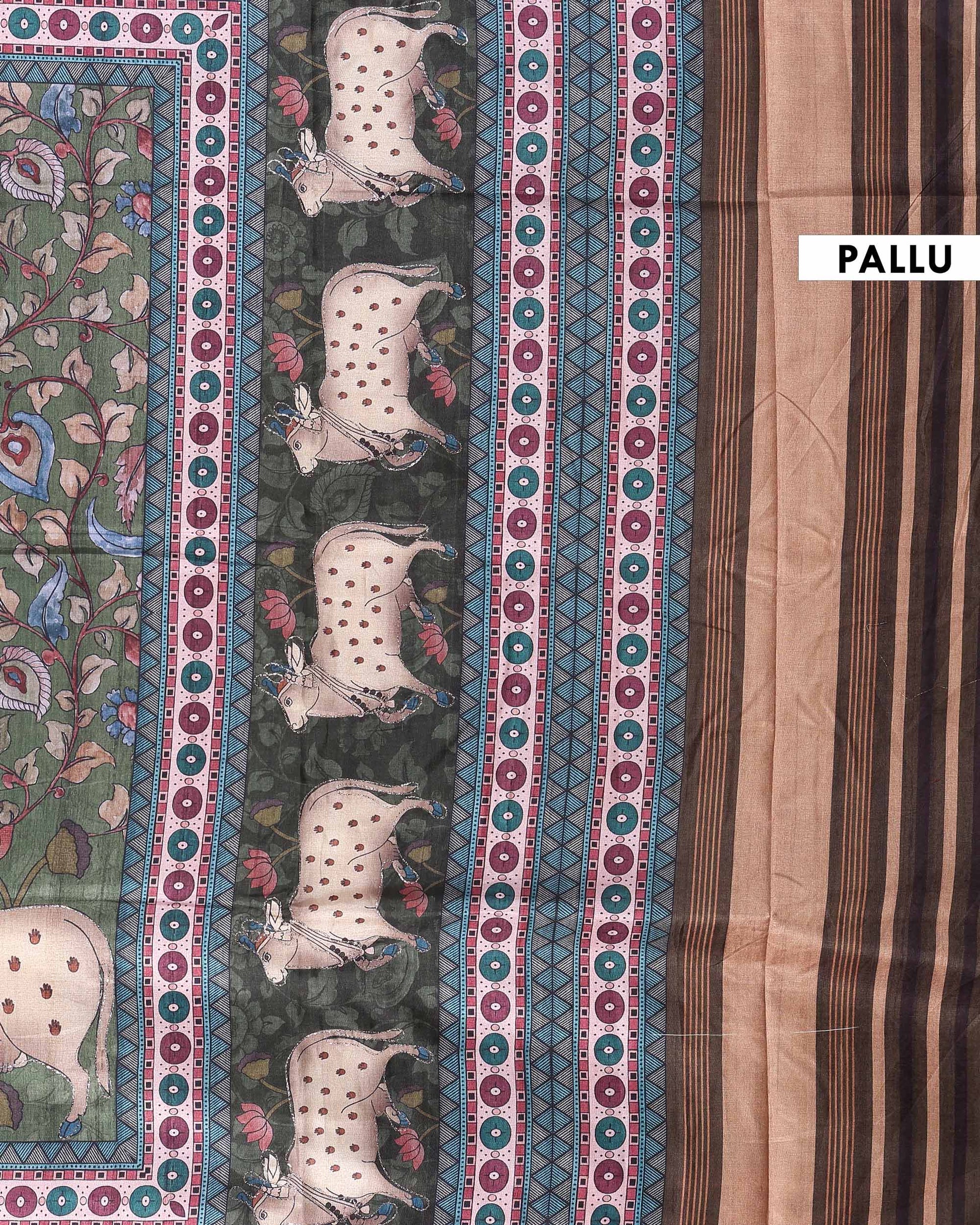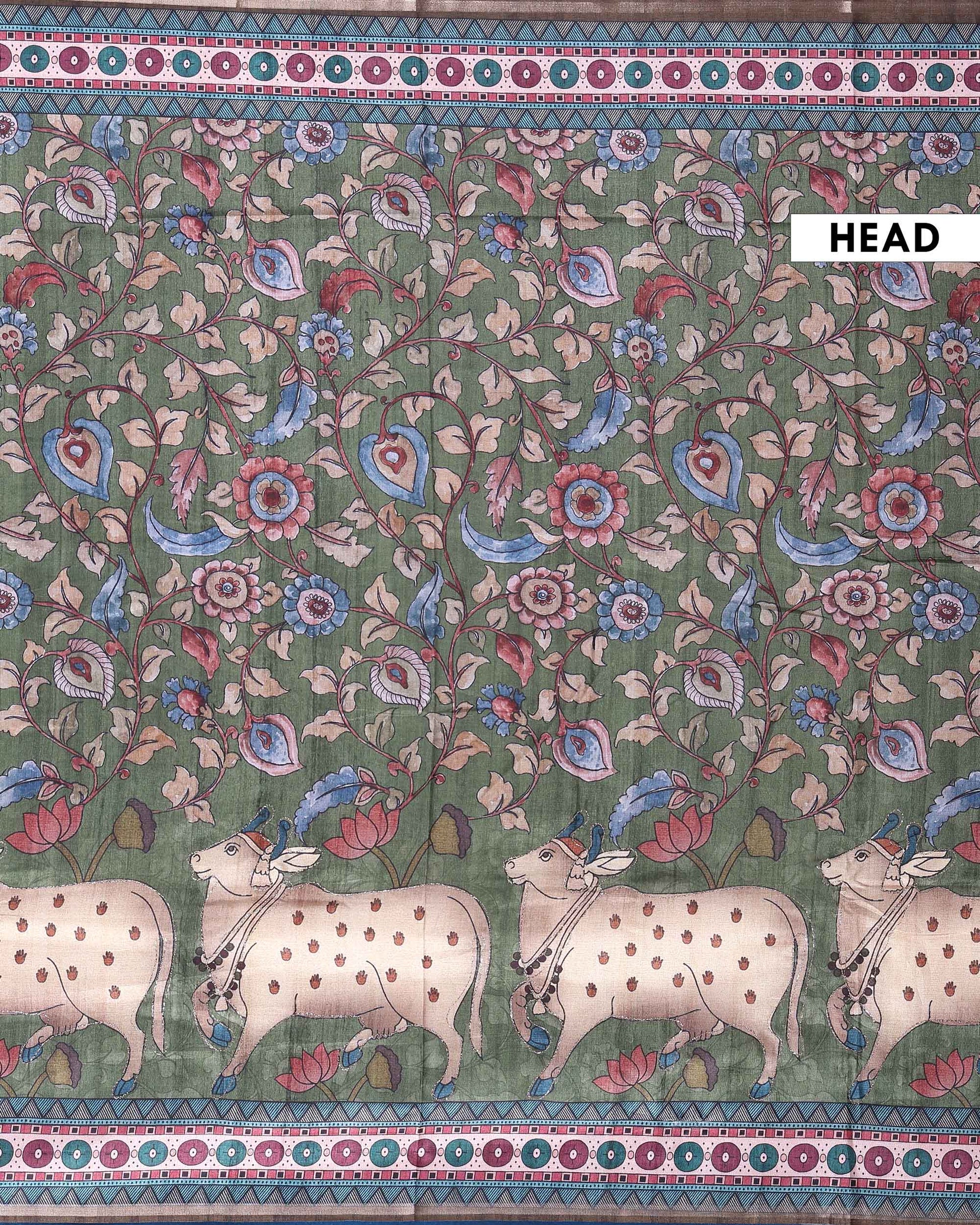 - This stunning Green Dola saree intricate kalamkari style floral prints and unique cow motifs on the border