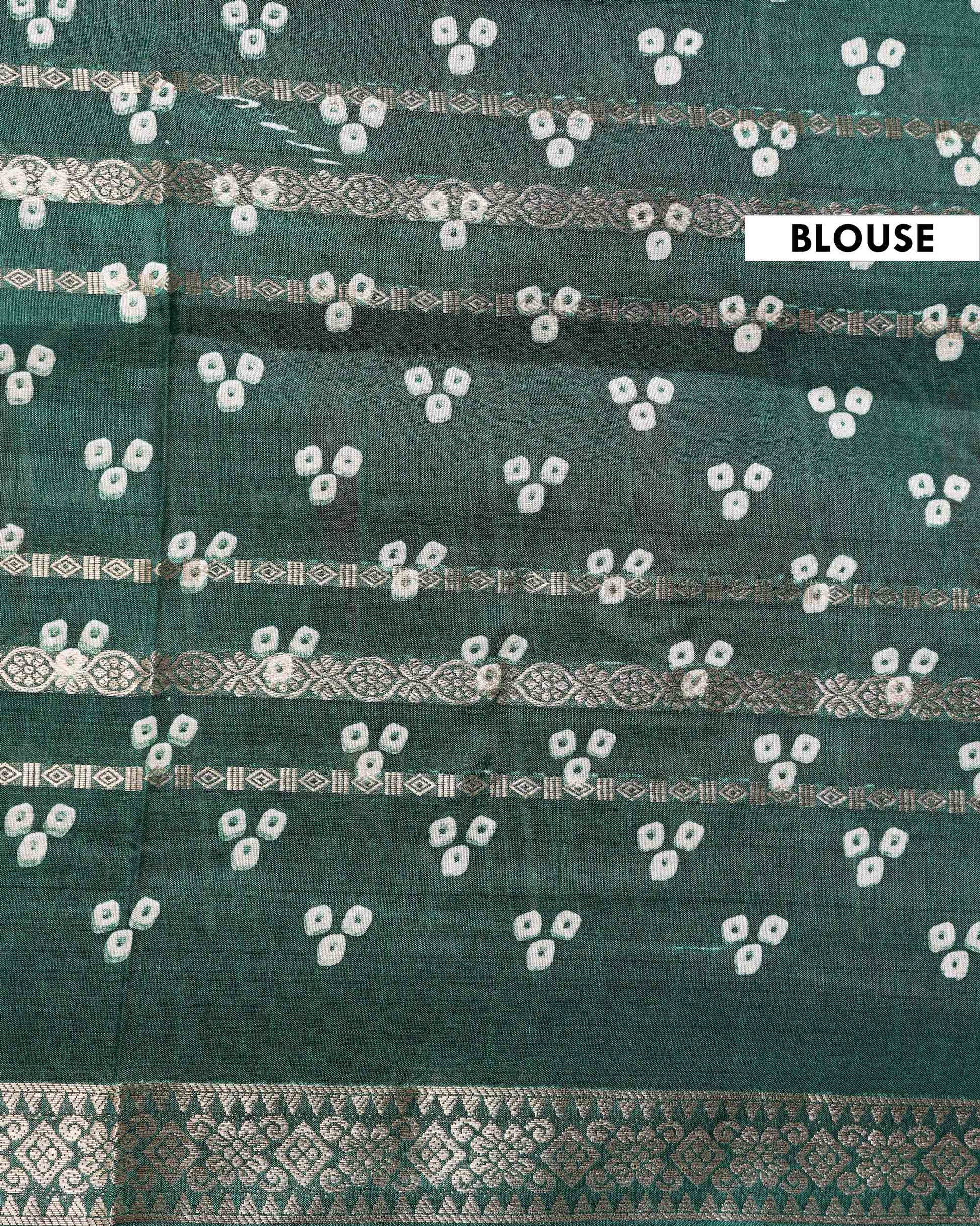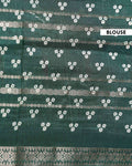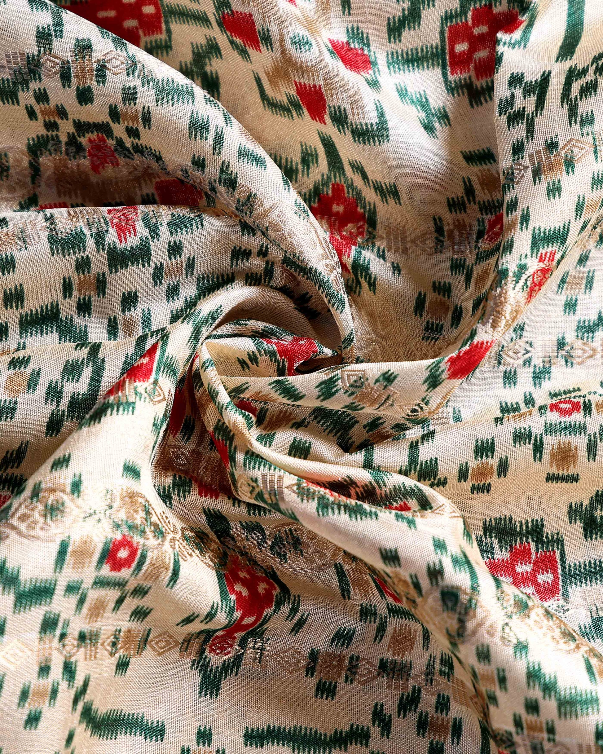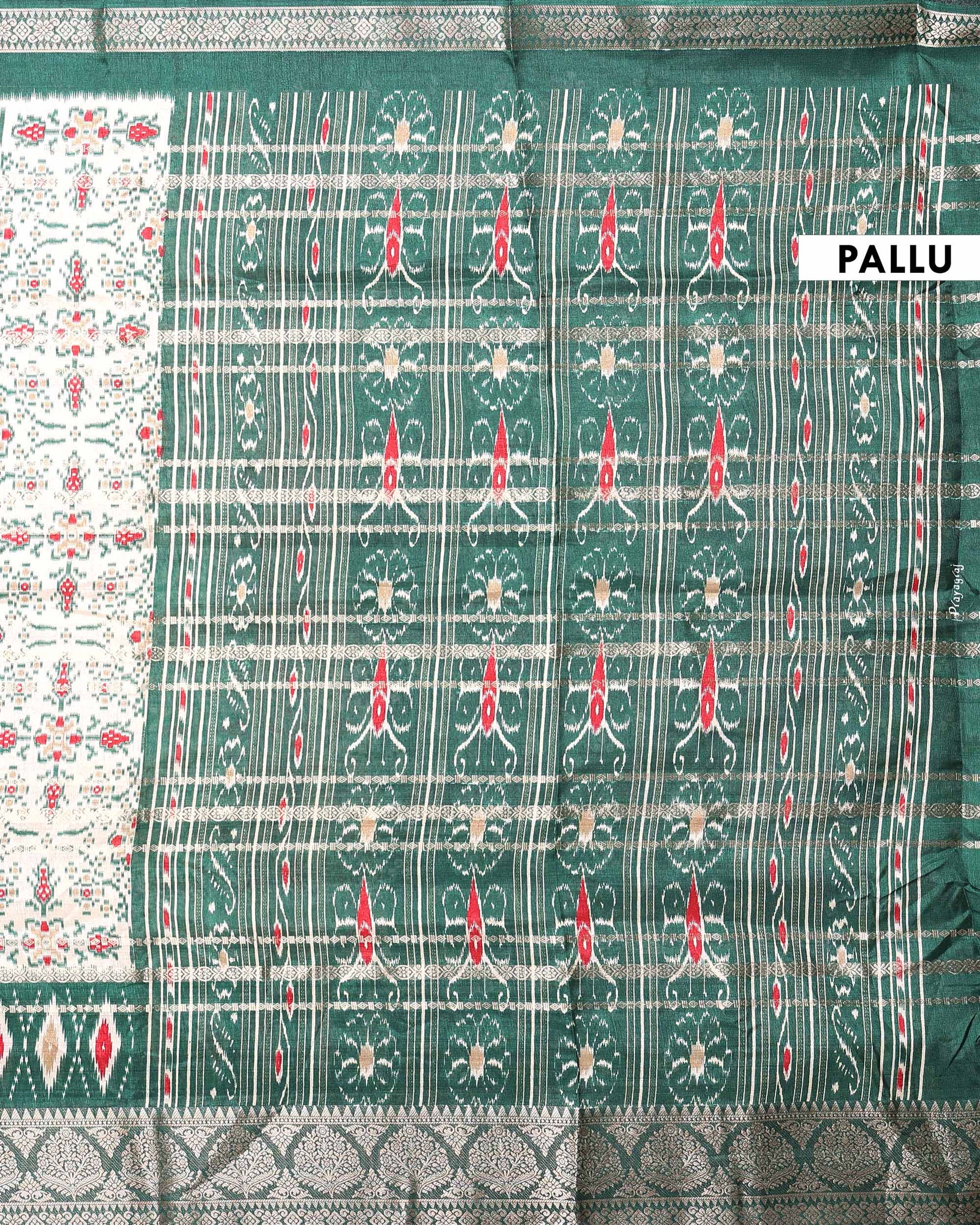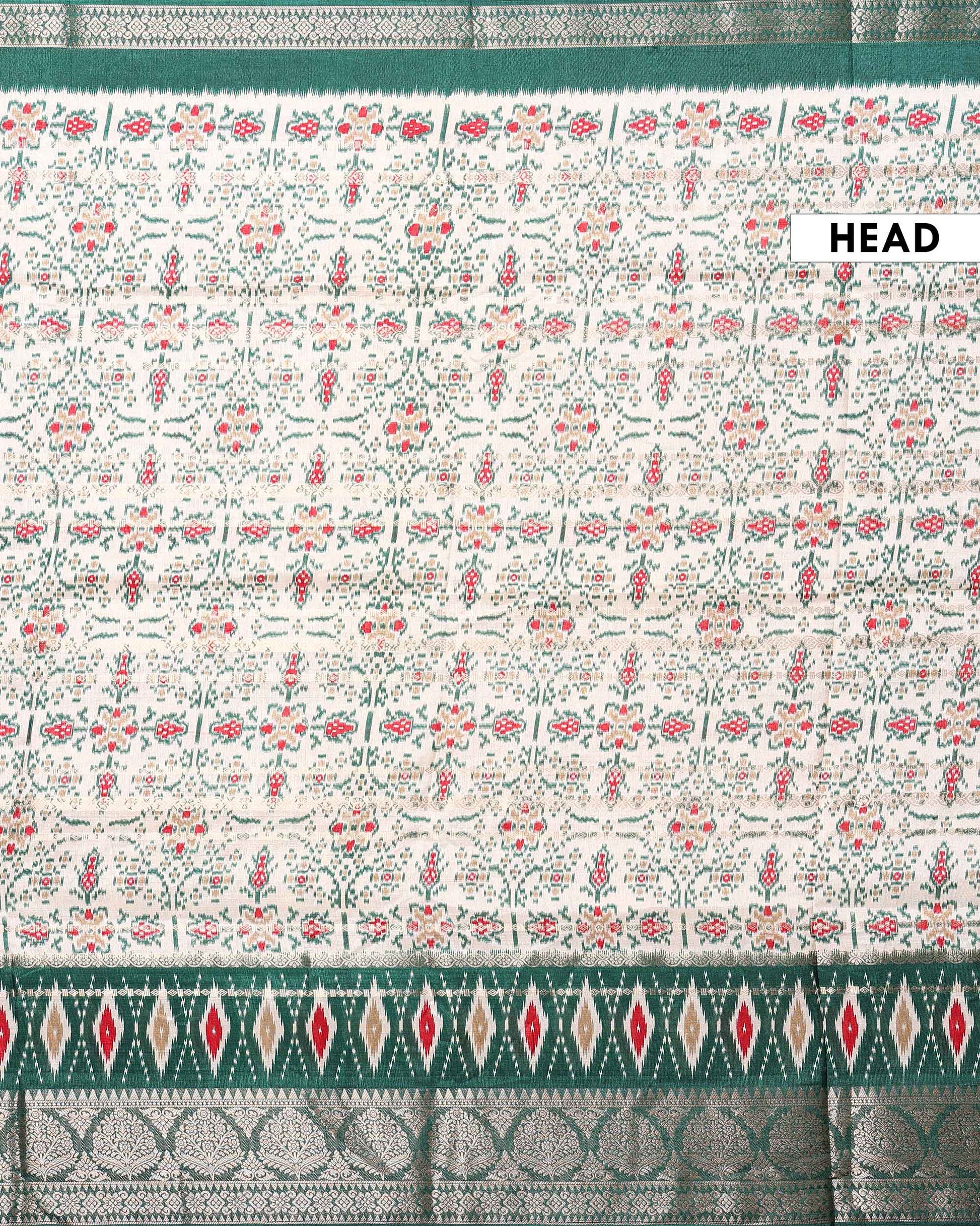 - This stunning Dola saree an elegant blend of off white and deep forest green adorned with intricate geometric and Pochampally inspired woven motifs and a rich zari border.