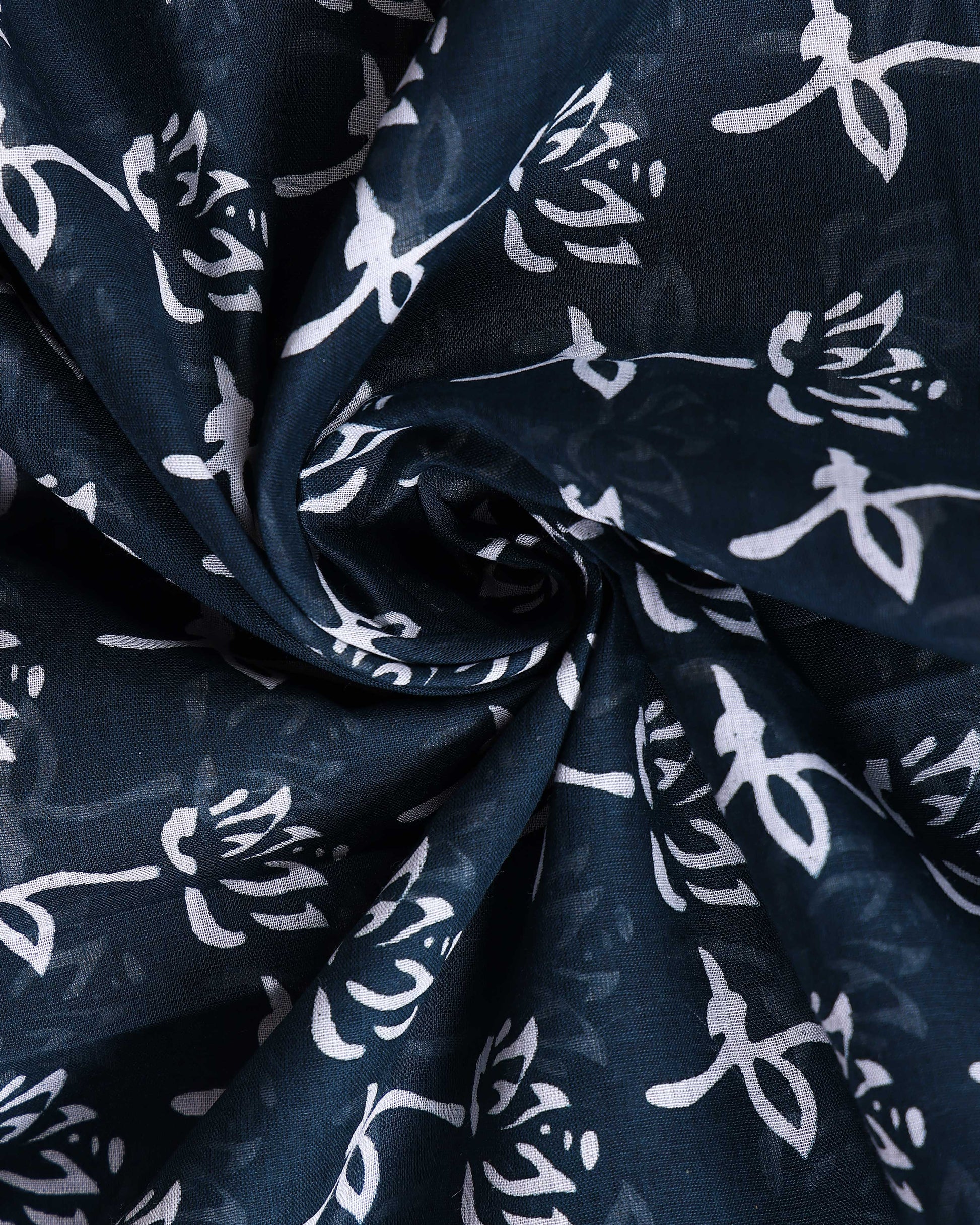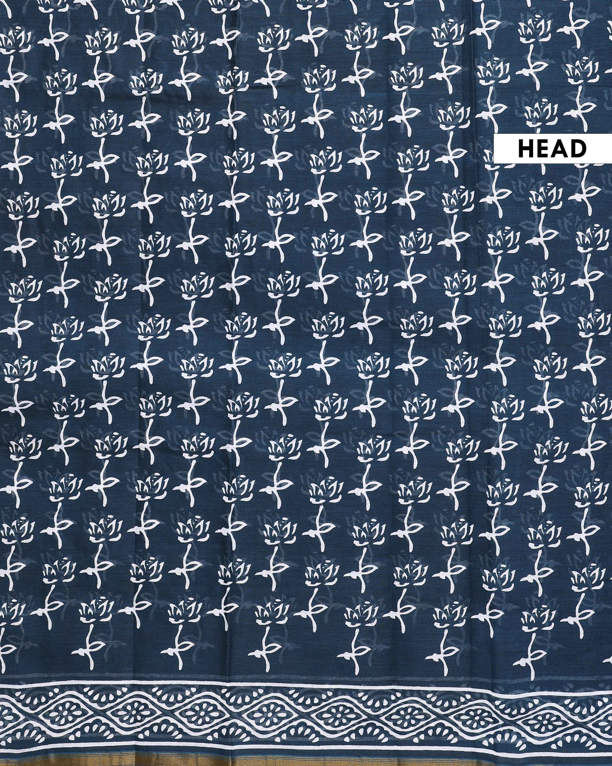 Traditional Hand Block Printed Mul Mul Semi Cotton Saree with Floral Motifs - Dark Teal