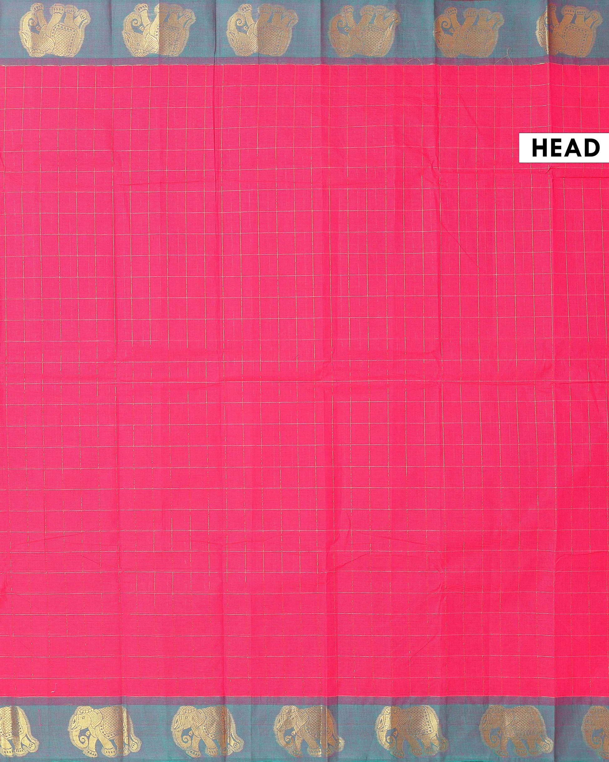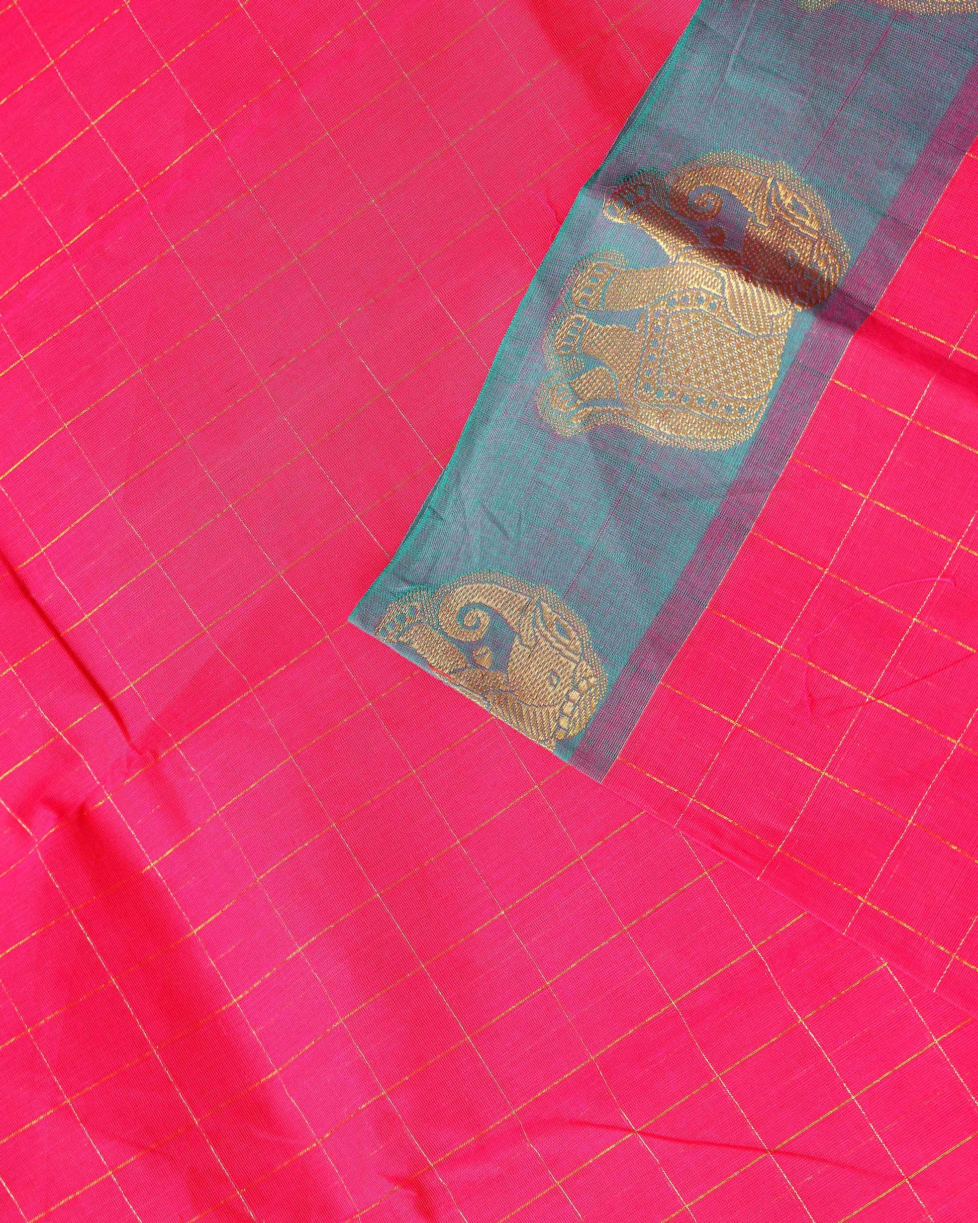- This Pink Chettinad cotton saree features a classic checked pattern and a striking gold border with traditional elephant motifs