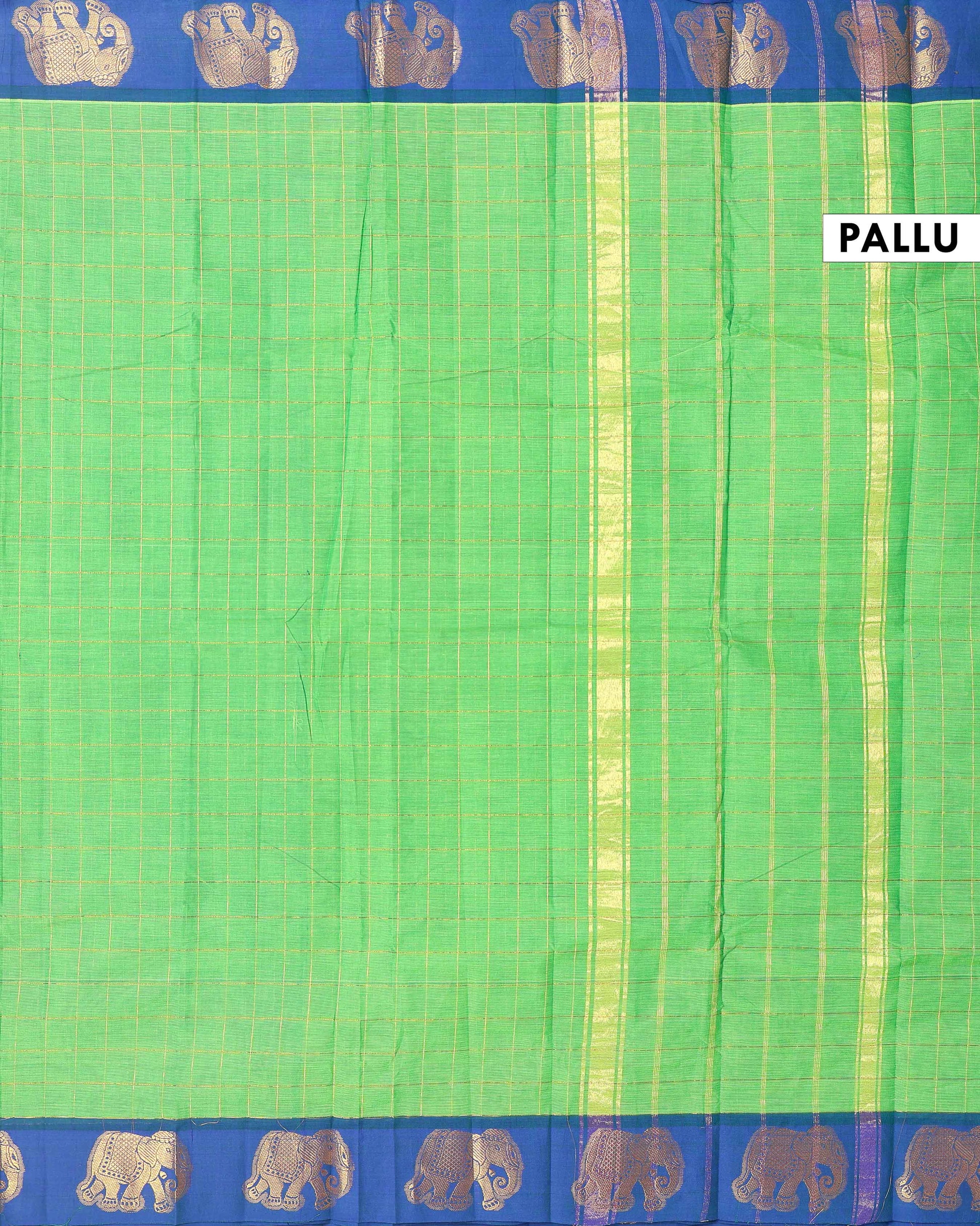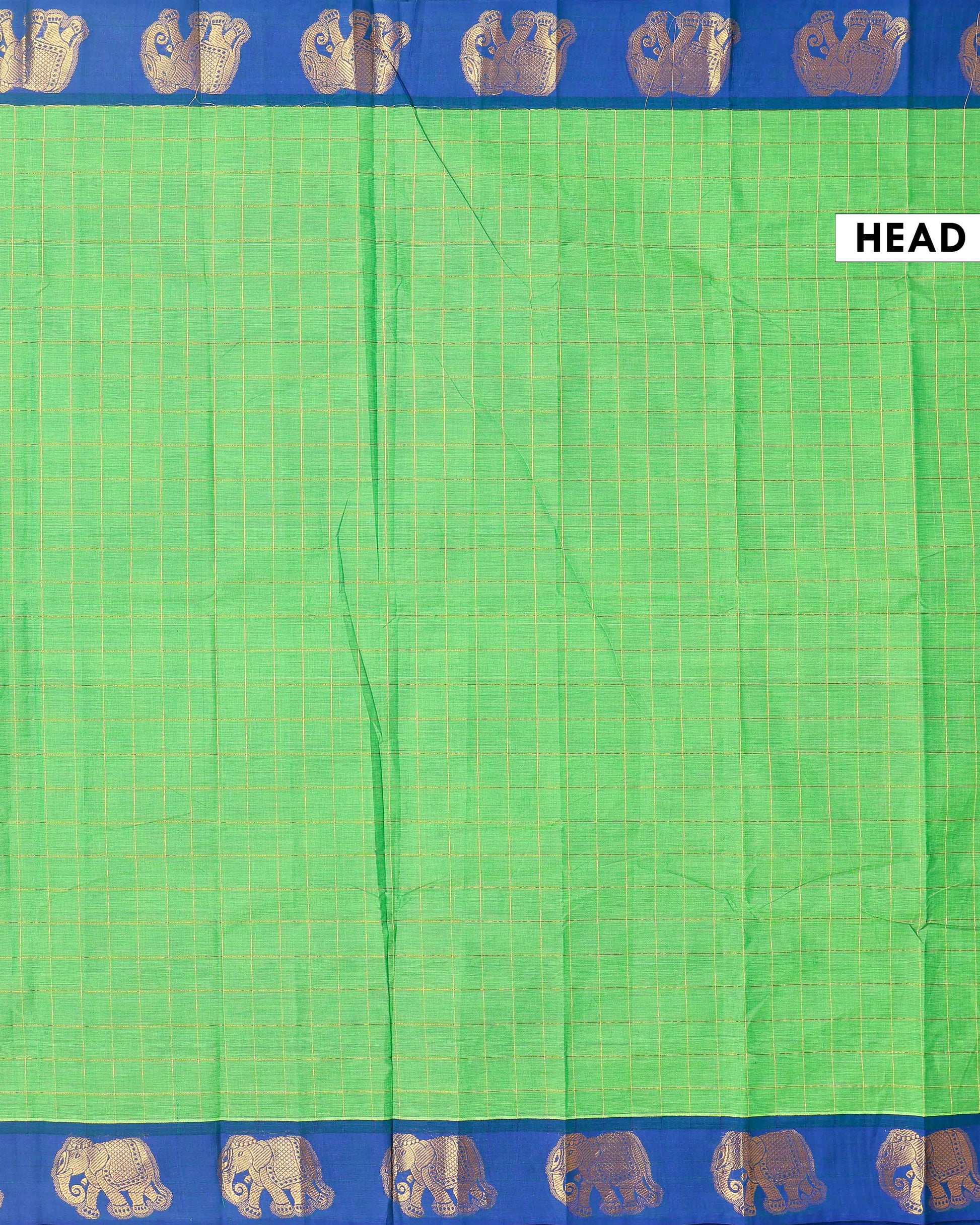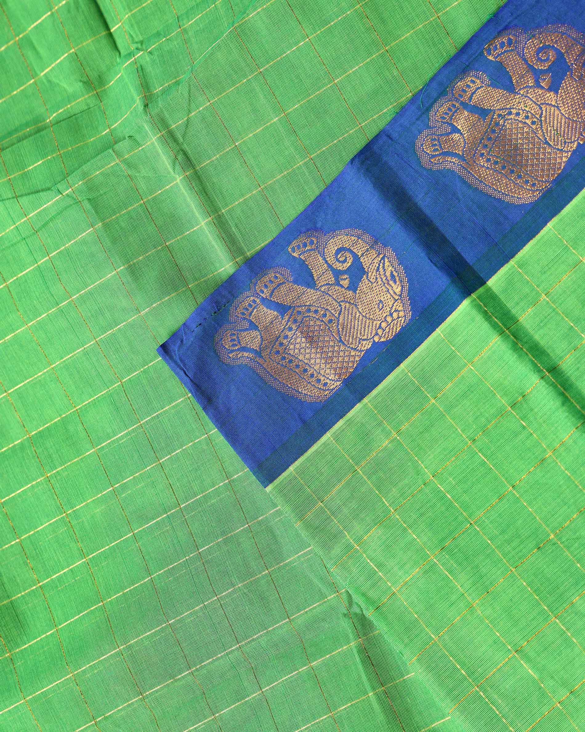 - This Green Chettinad cotton saree features a classic checked pattern and a striking gold border with traditional elephant motifs