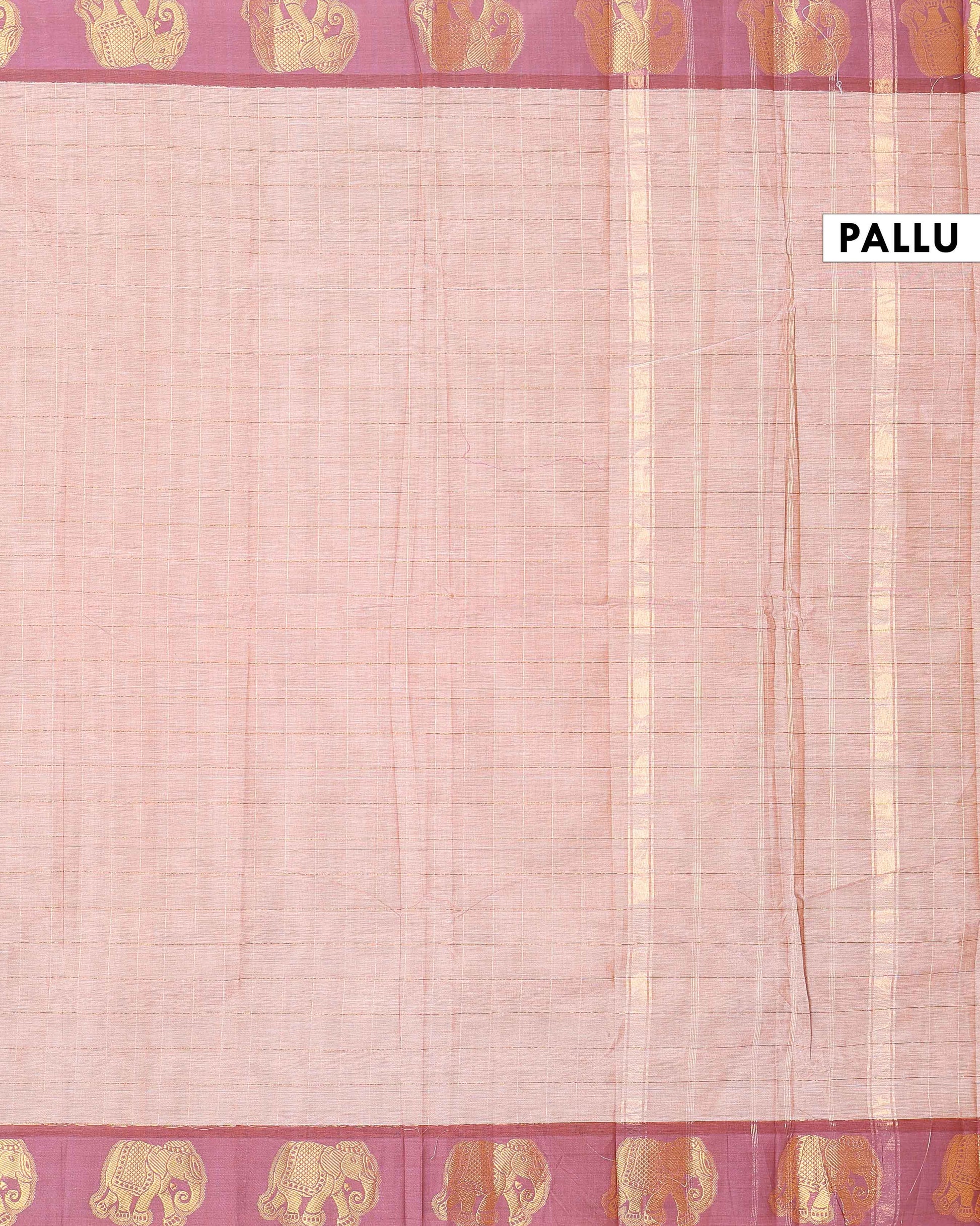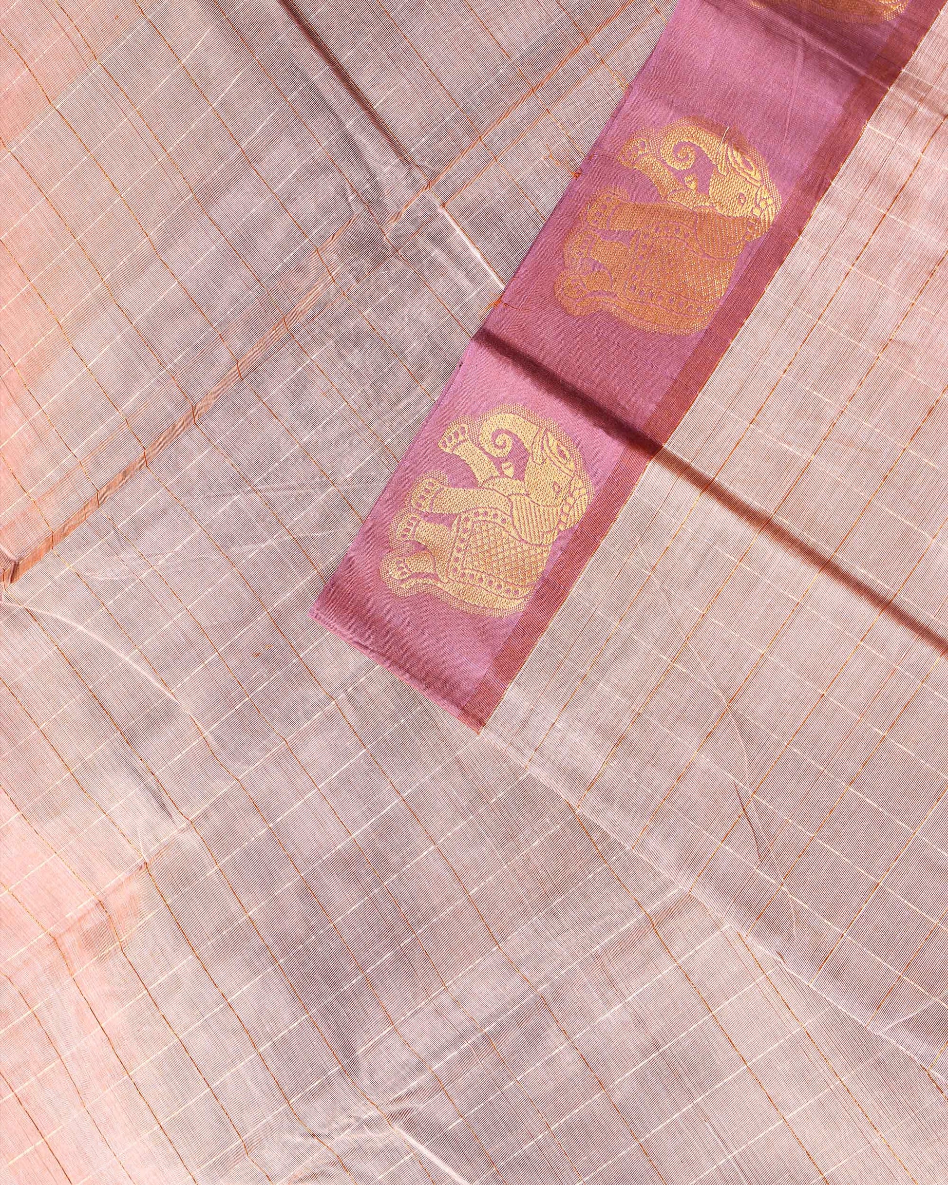 - This Sandal Chettinad cotton saree features a classic checked pattern and a striking gold border with traditional elephant motifs