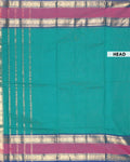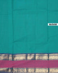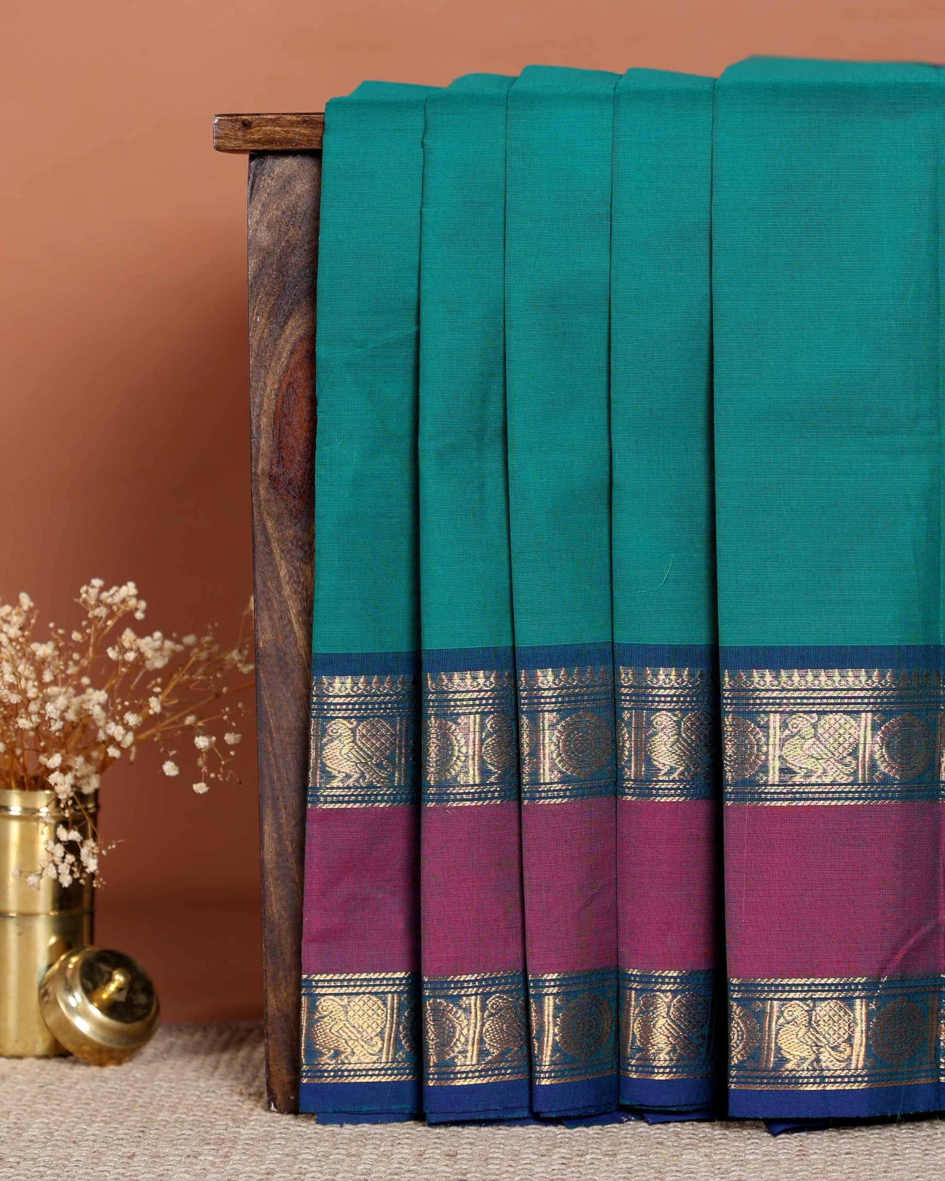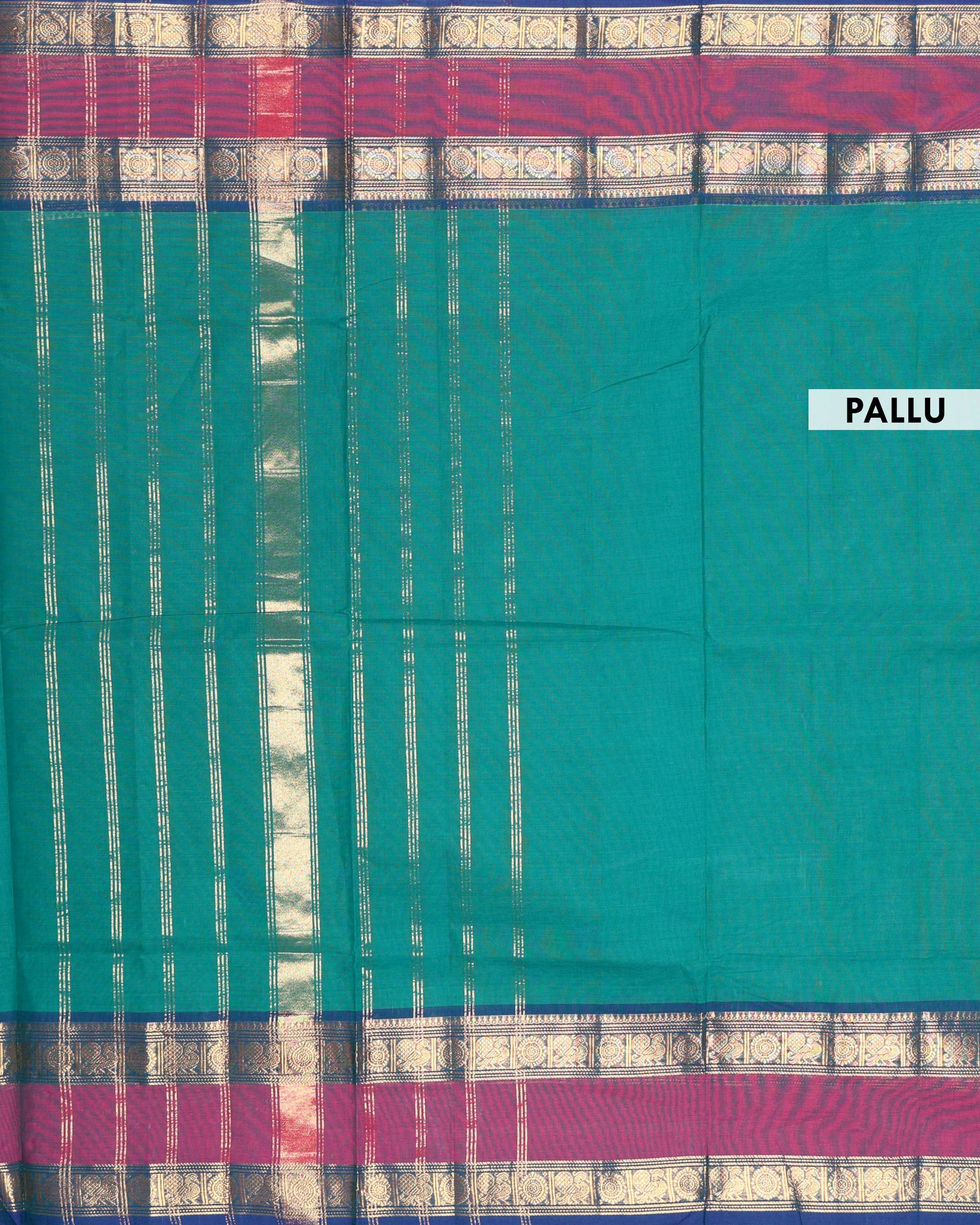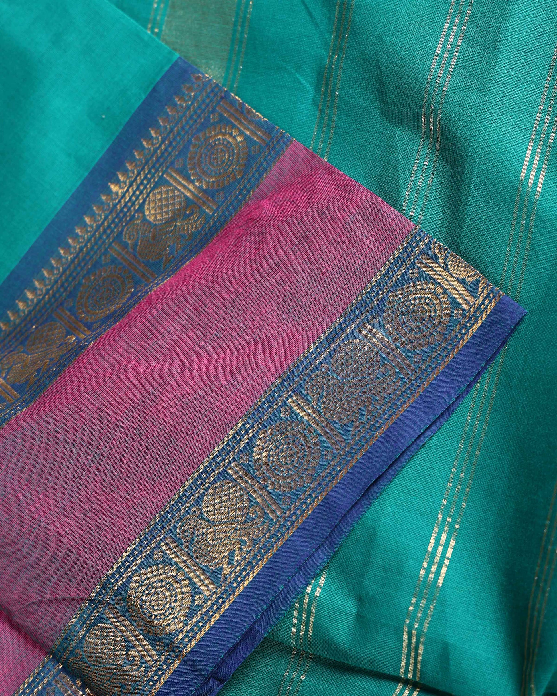 - Elegant handloom Chettinad cotton saree in a vibrant sea green a traditional striped body and rich contrast magenta border with intricate golden zari peacock and temple motifs.