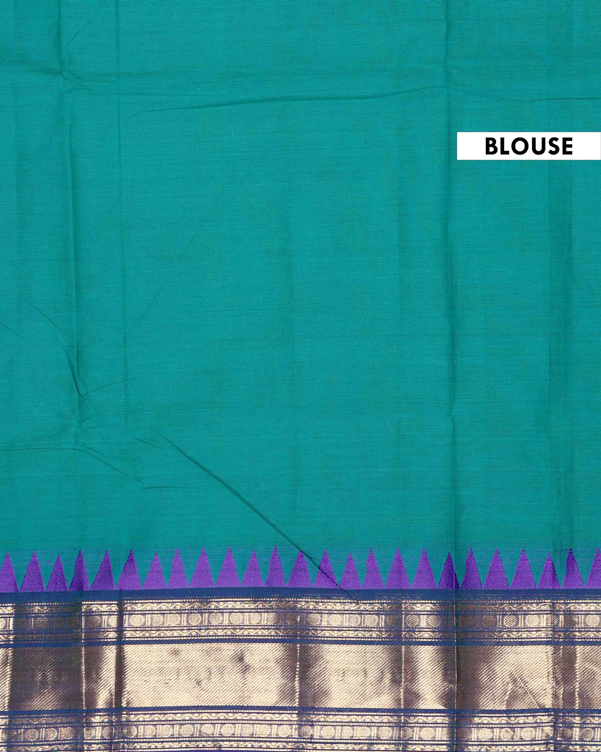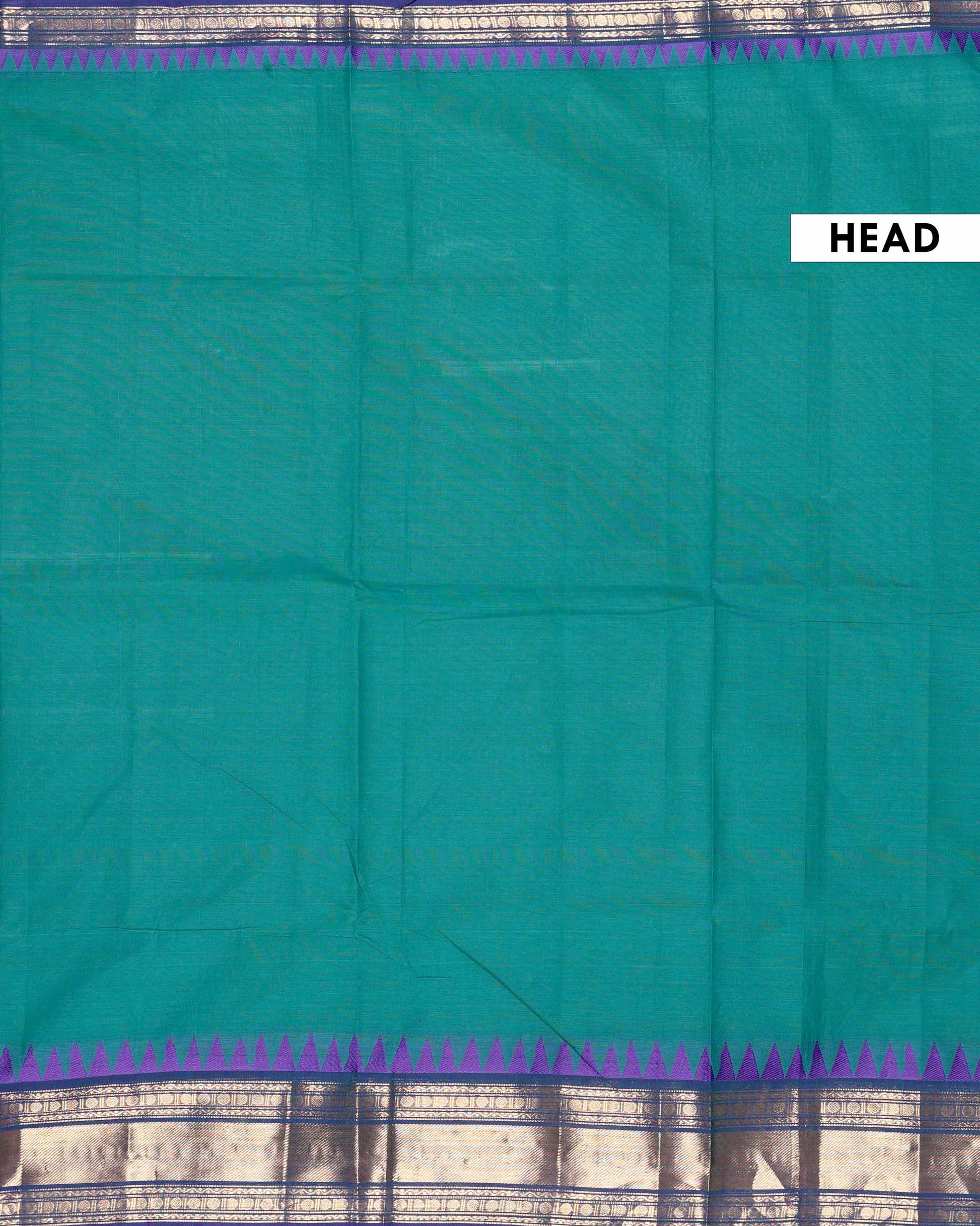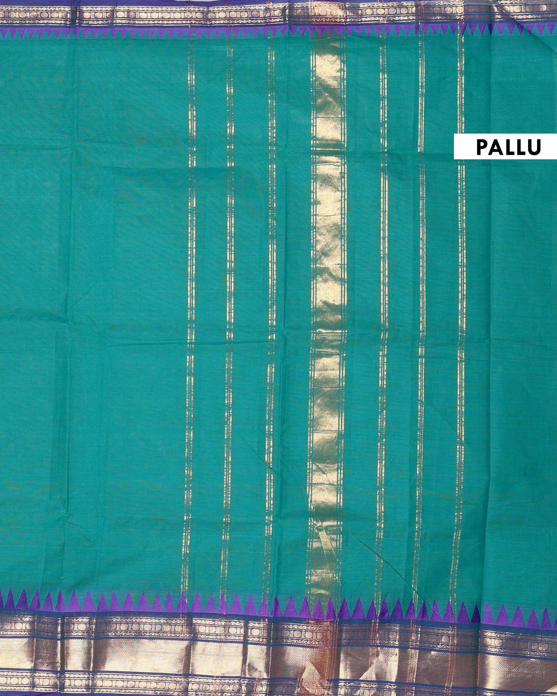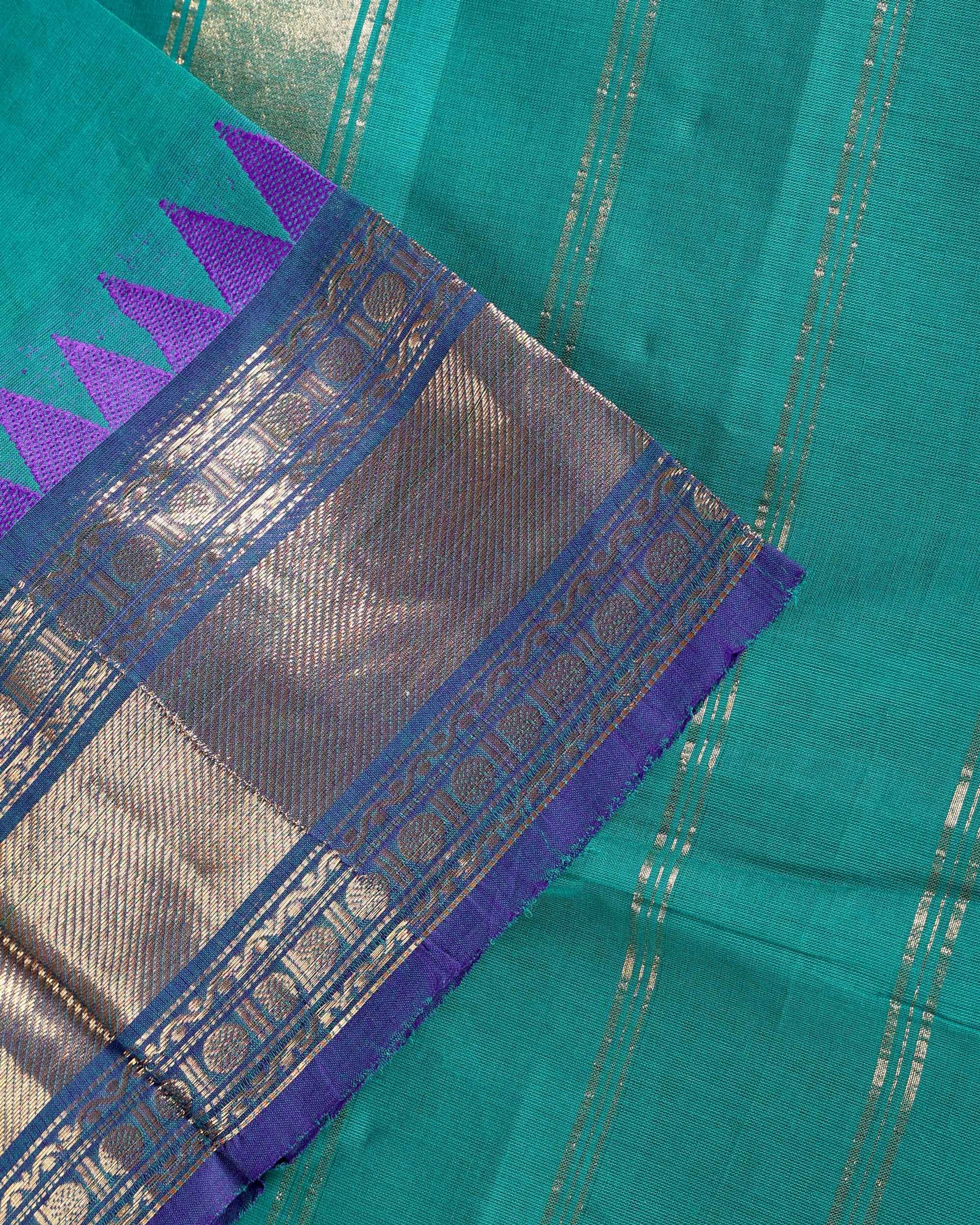 - This handwoven Chettinad cotton saree in a beautiful Green color a traditional striped body and a vibrant double contrast border with intricate temple motifs.