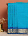Traditional Handloom Chettinad Cotton Saree with Intricate Zari Woven Border and Classic Geometric Pallu Design - Turquoise Blue