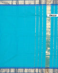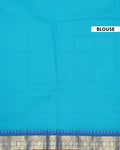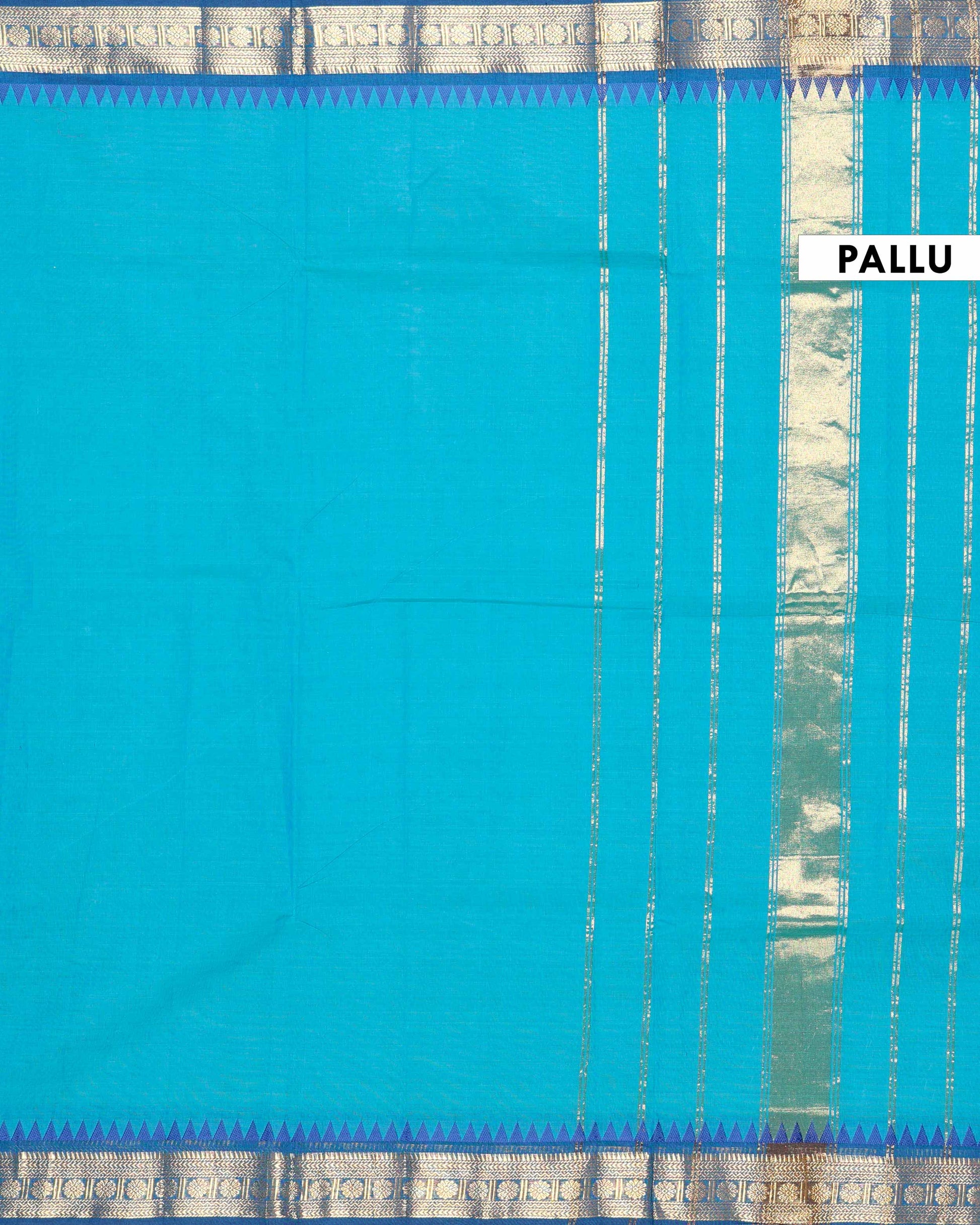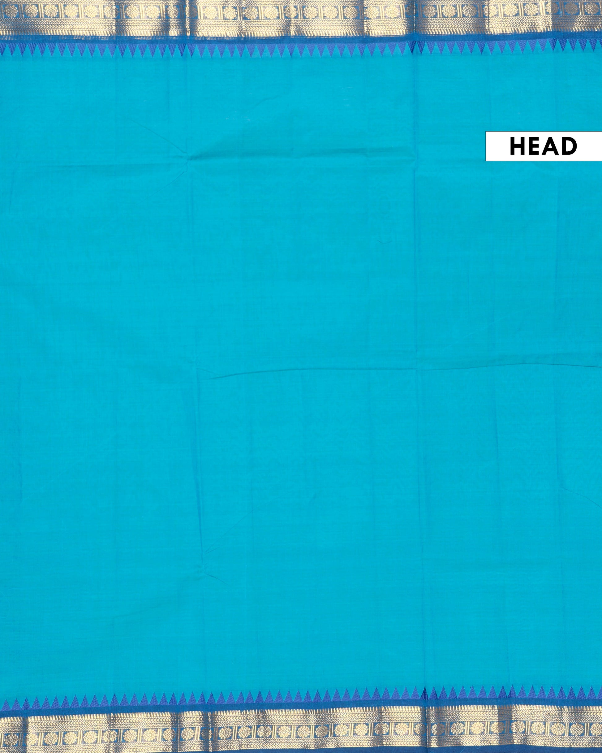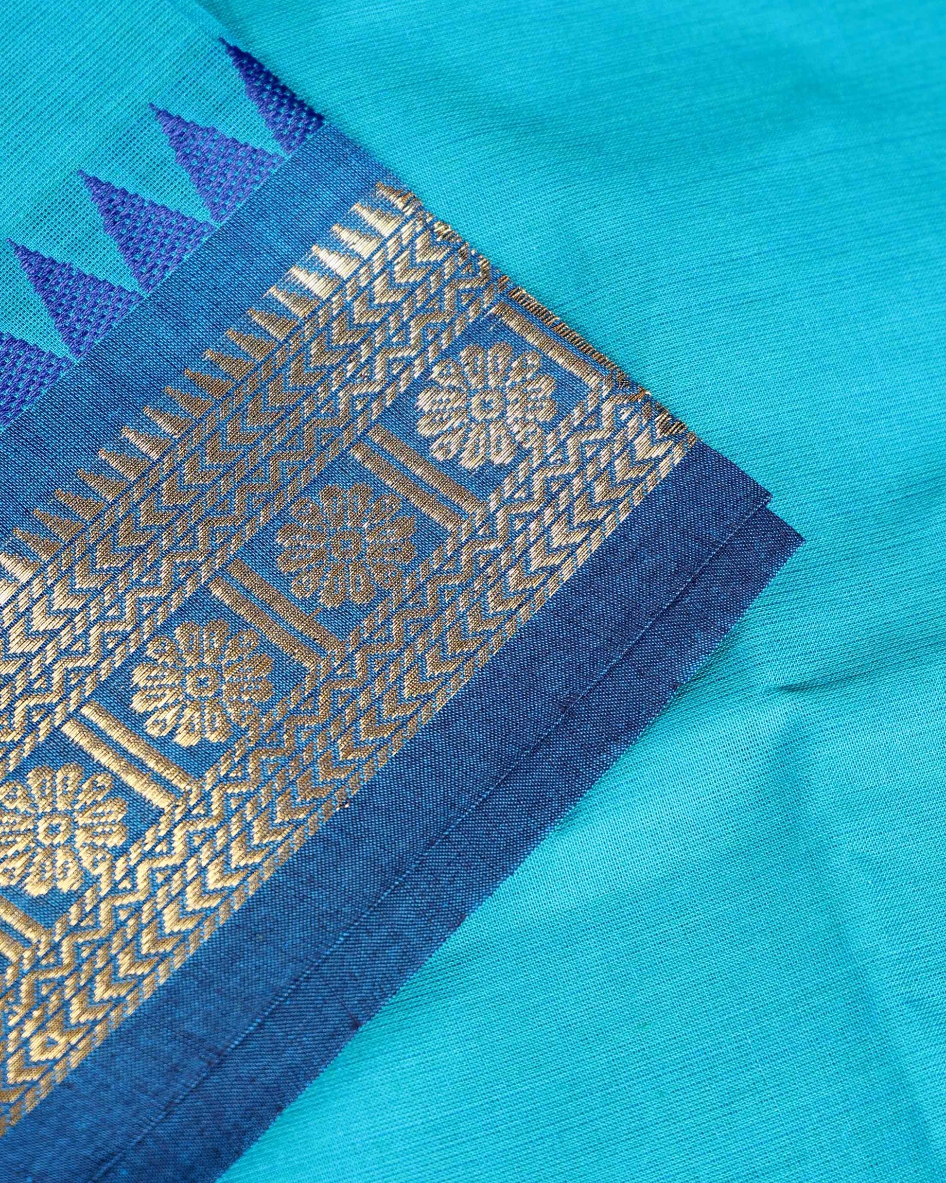 - This vibrant turquoise blue handloom Chettinad cotton saree a traditional gold zari border with intricate motifs and a contrasting blue serrated edge detail.