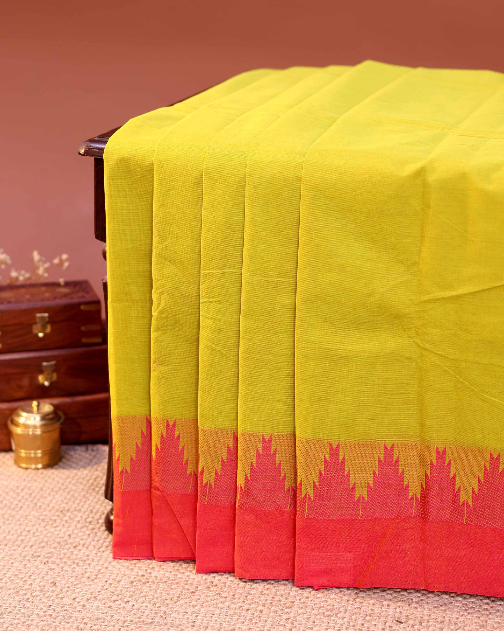 Traditional Handloom Chettinad Cotton Saree with Plain Body and Classic Temple Pattern Contrast Woven Border - Light Green