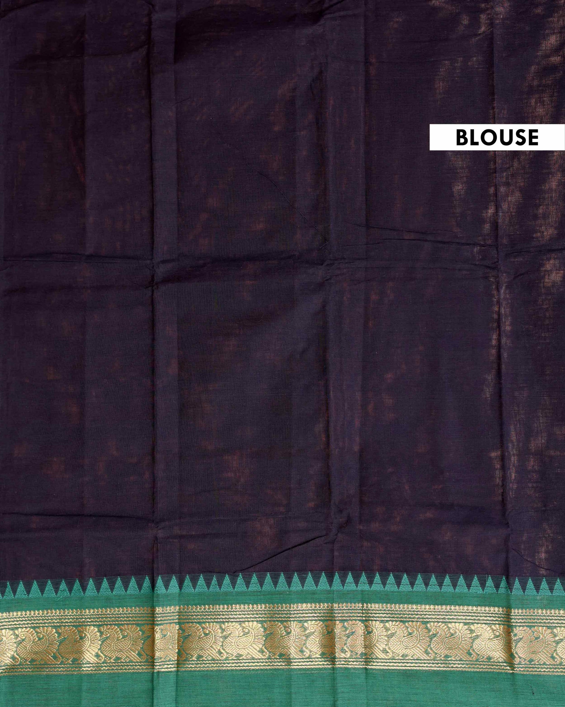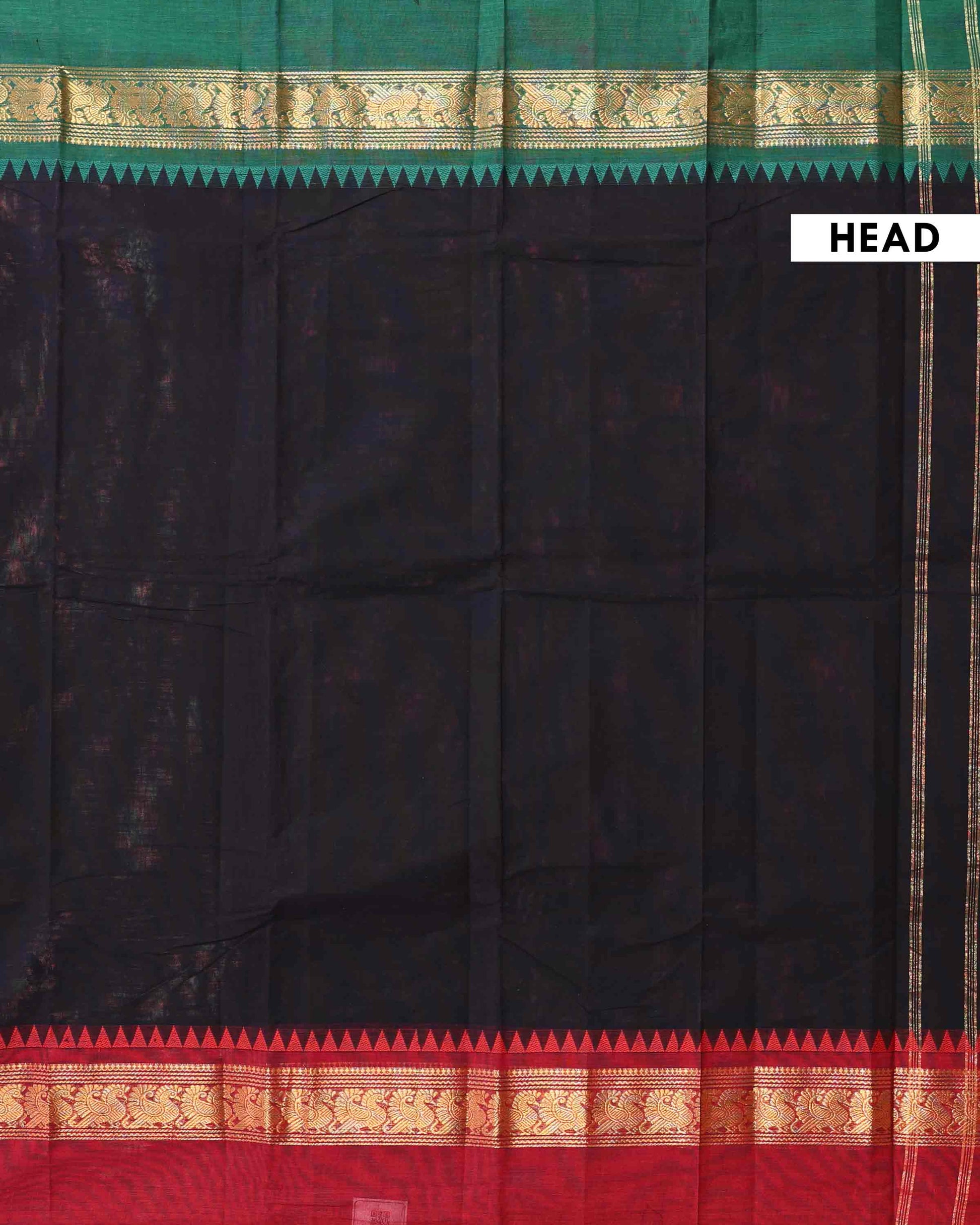 Traditional Handloom Chettinad Cotton Saree with Plain Body and Intricate Zari Woven Temple & Peacock Motif Border - Black