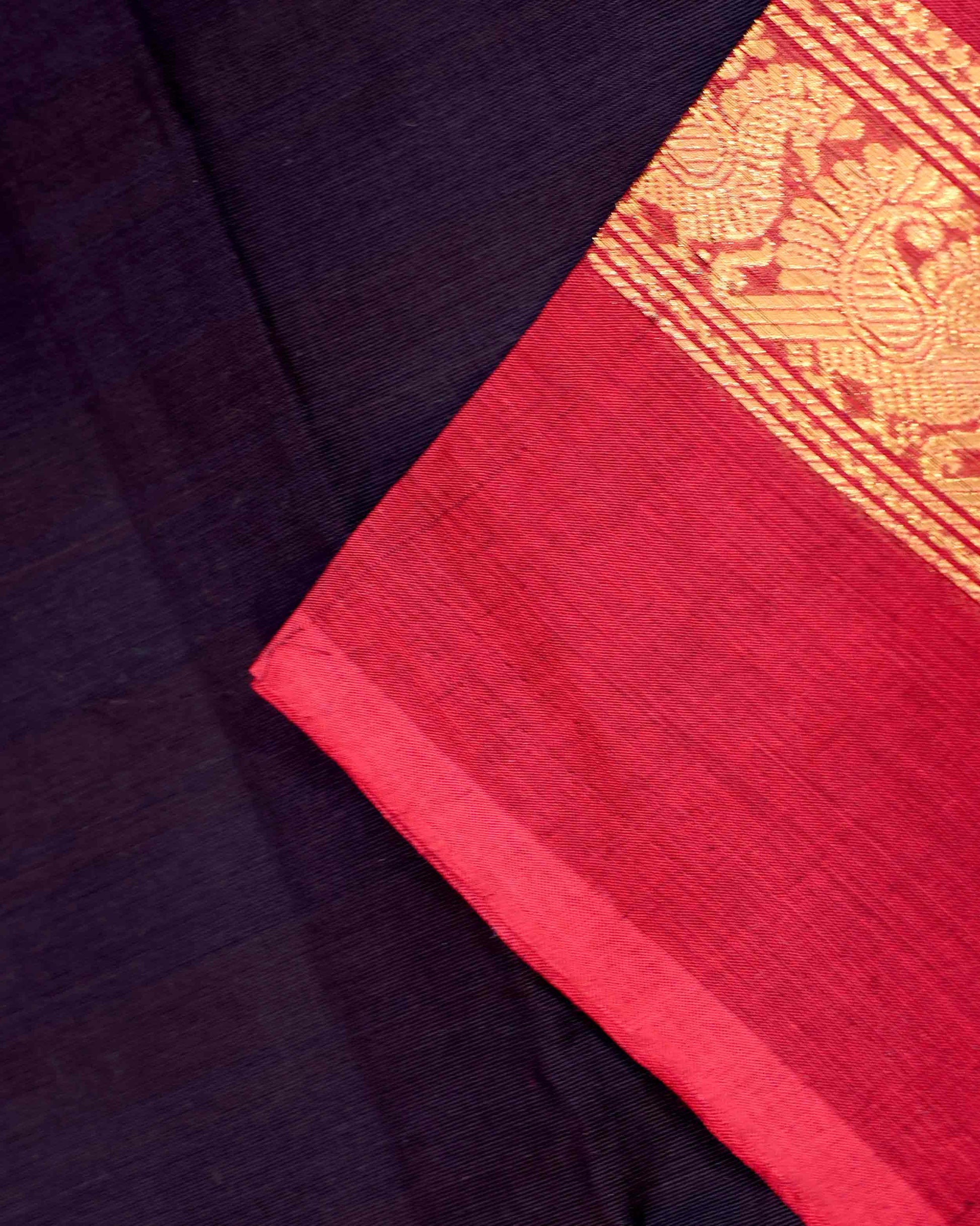 - Elevate your ethnic wardrobe with this stunning black Chettinad cotton saree a rich red and gold zari border
