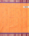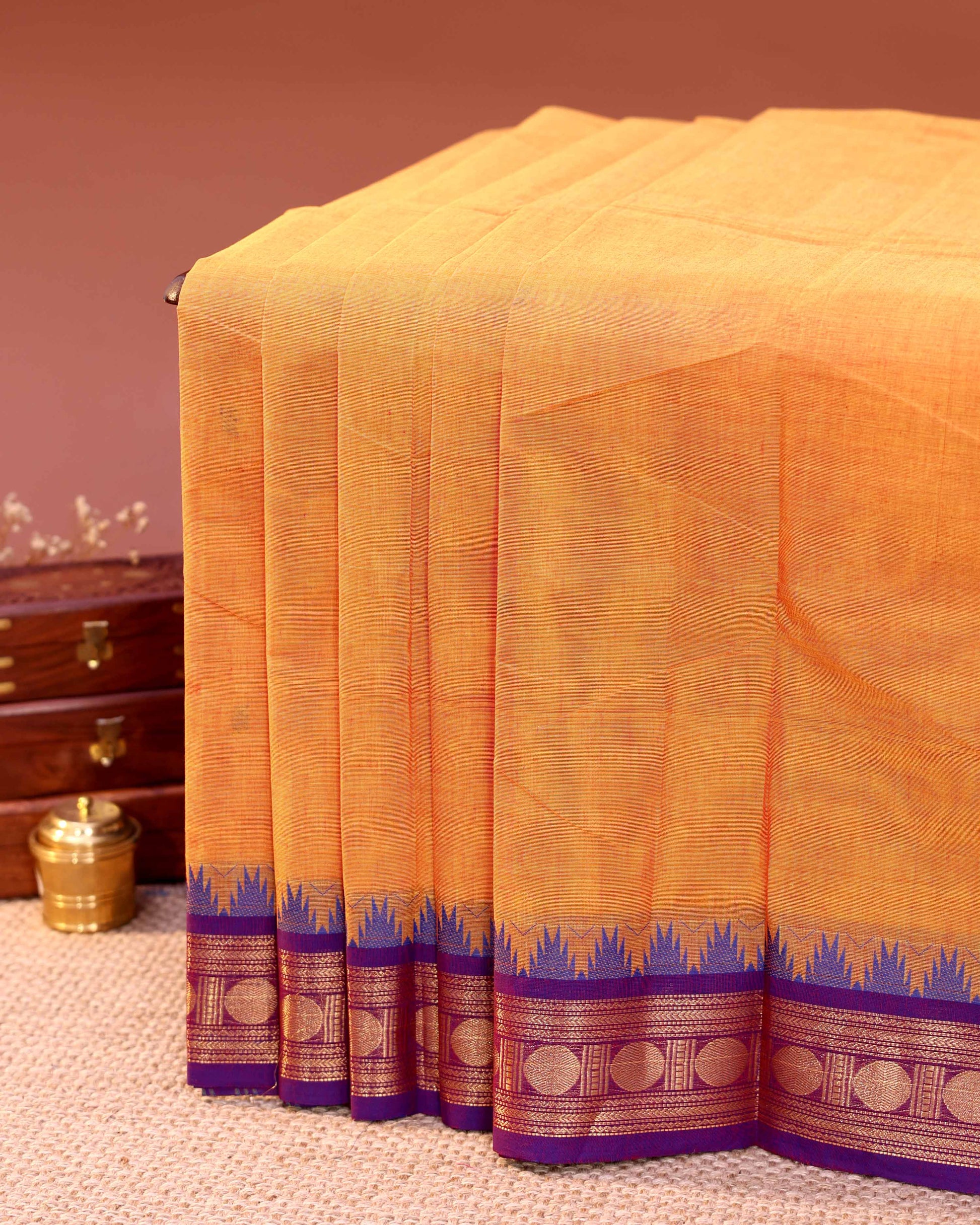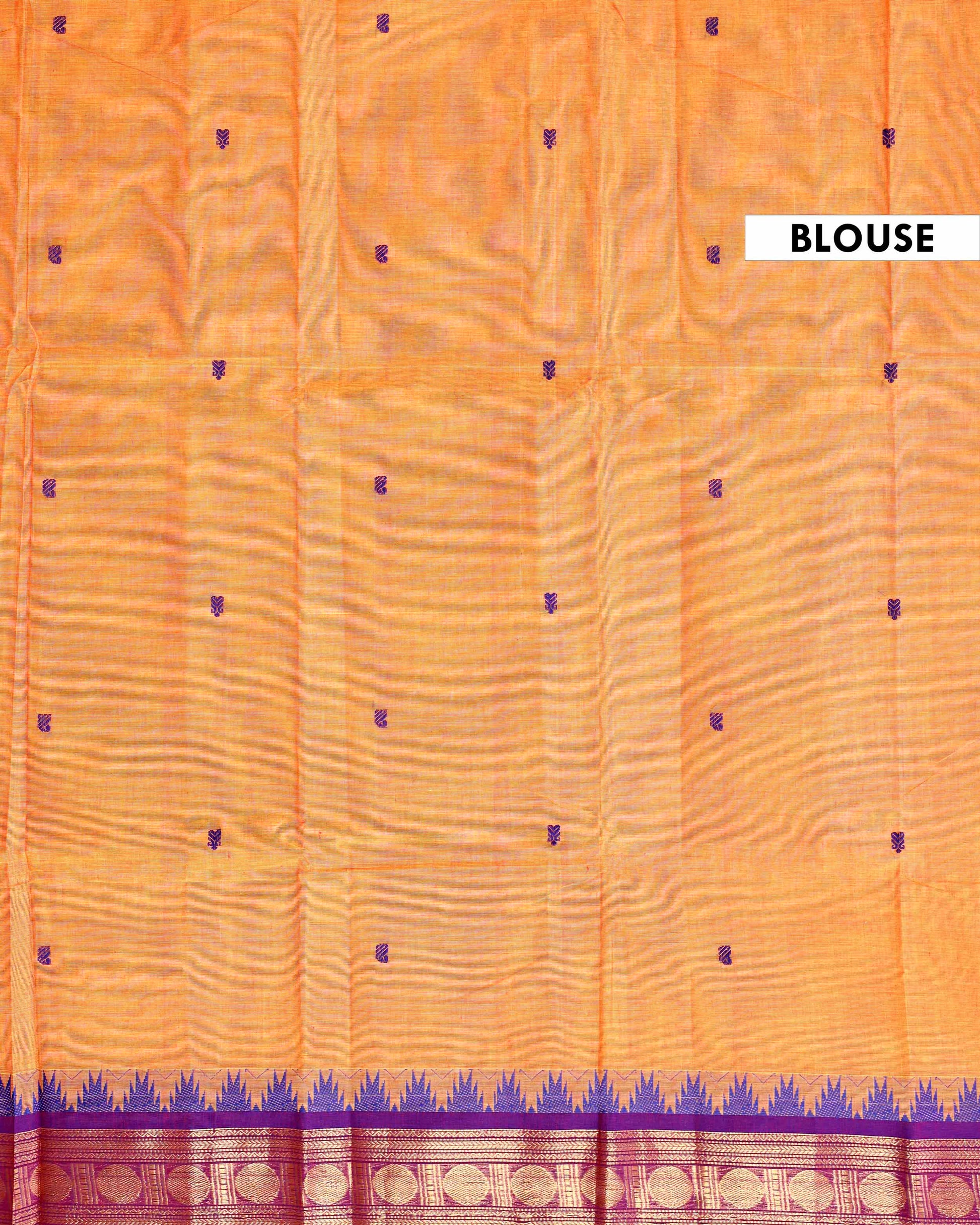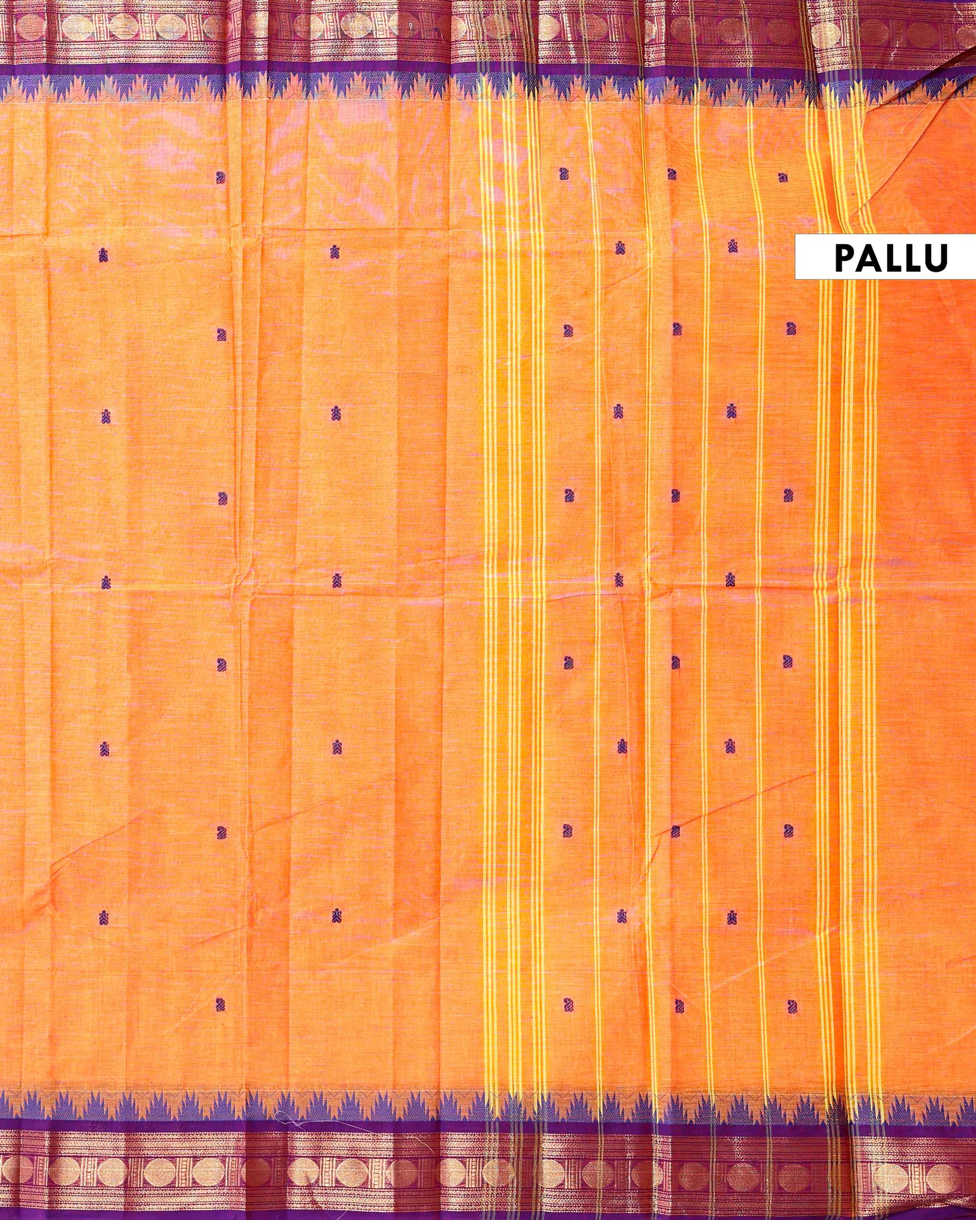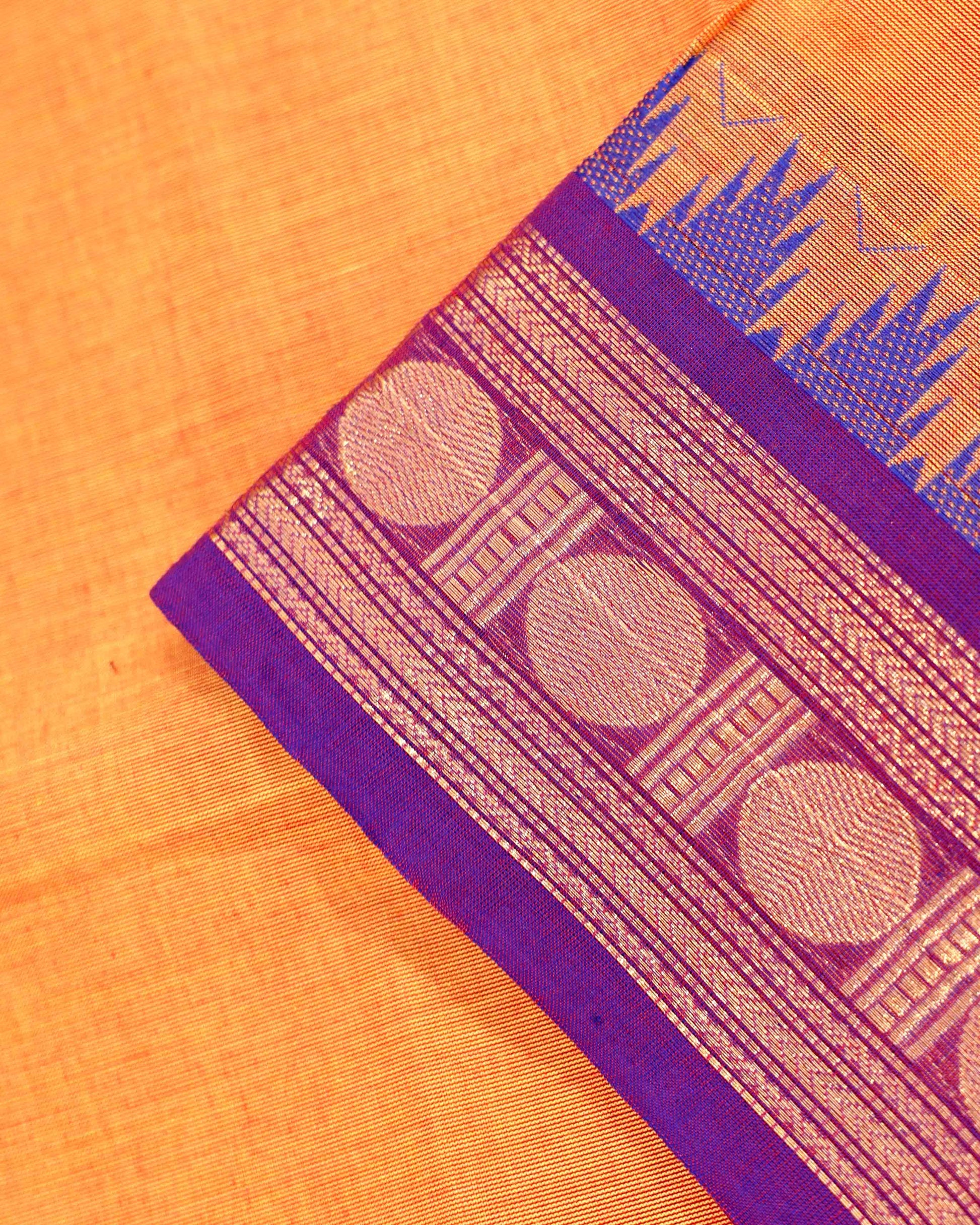 - Experience timeless elegance with this vibrant orange Chettinad cotton saree a traditional purple temple border