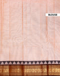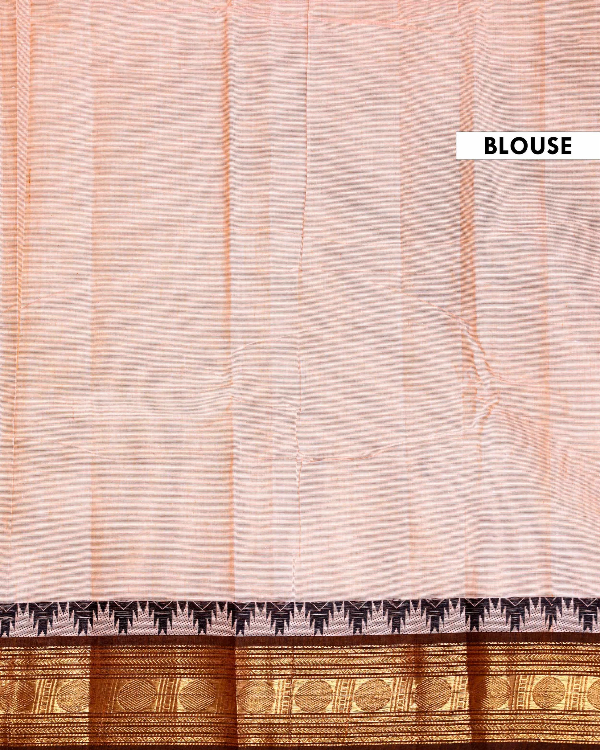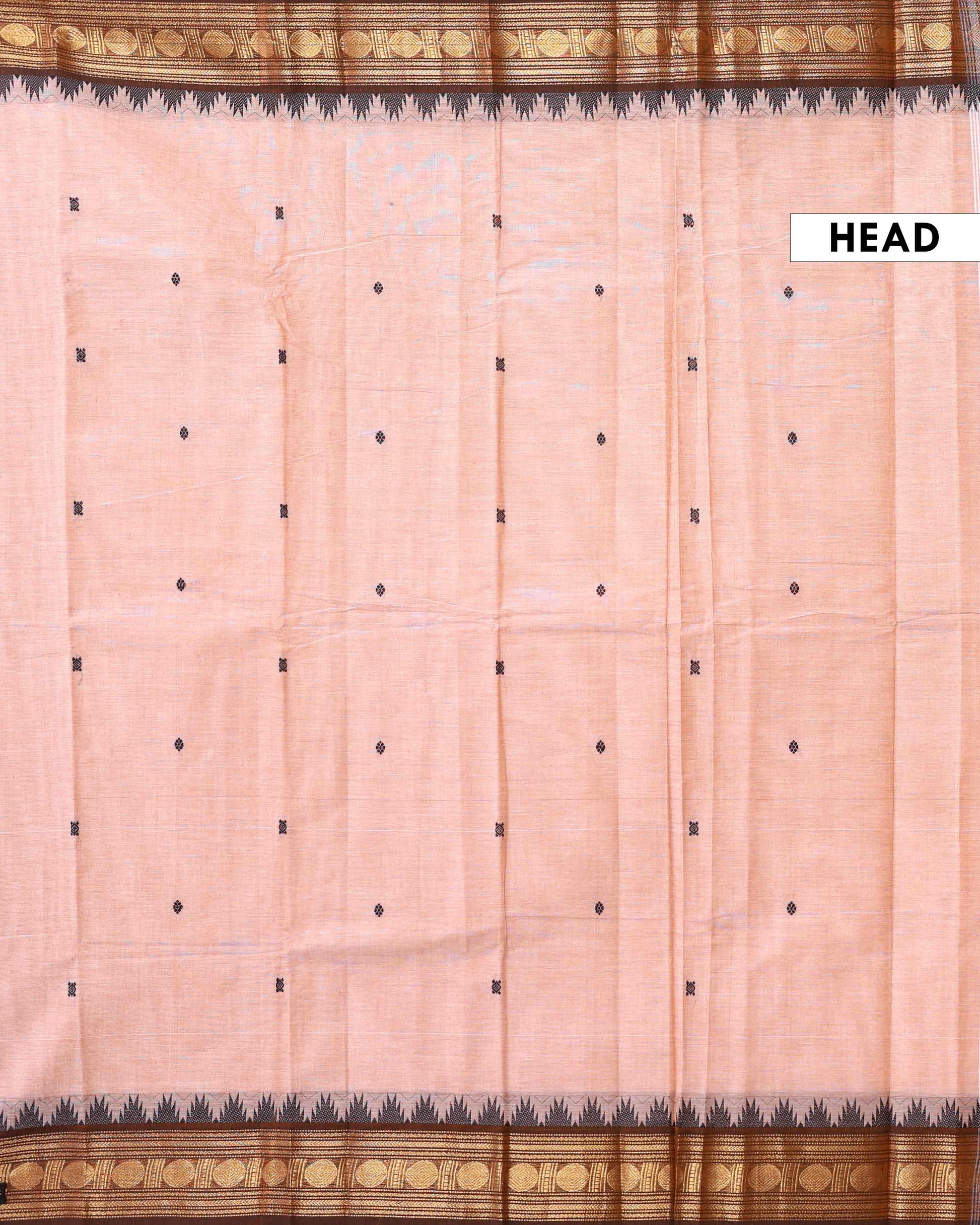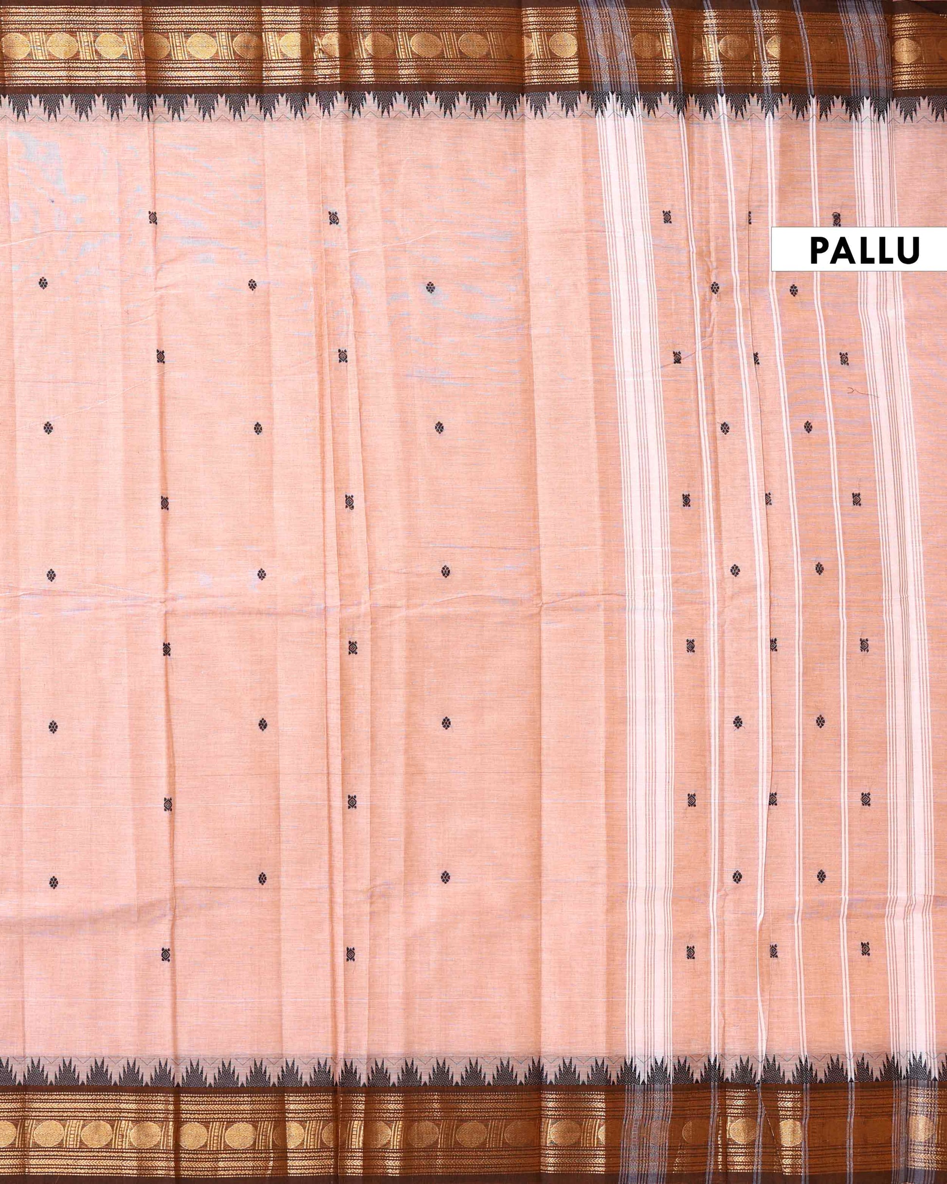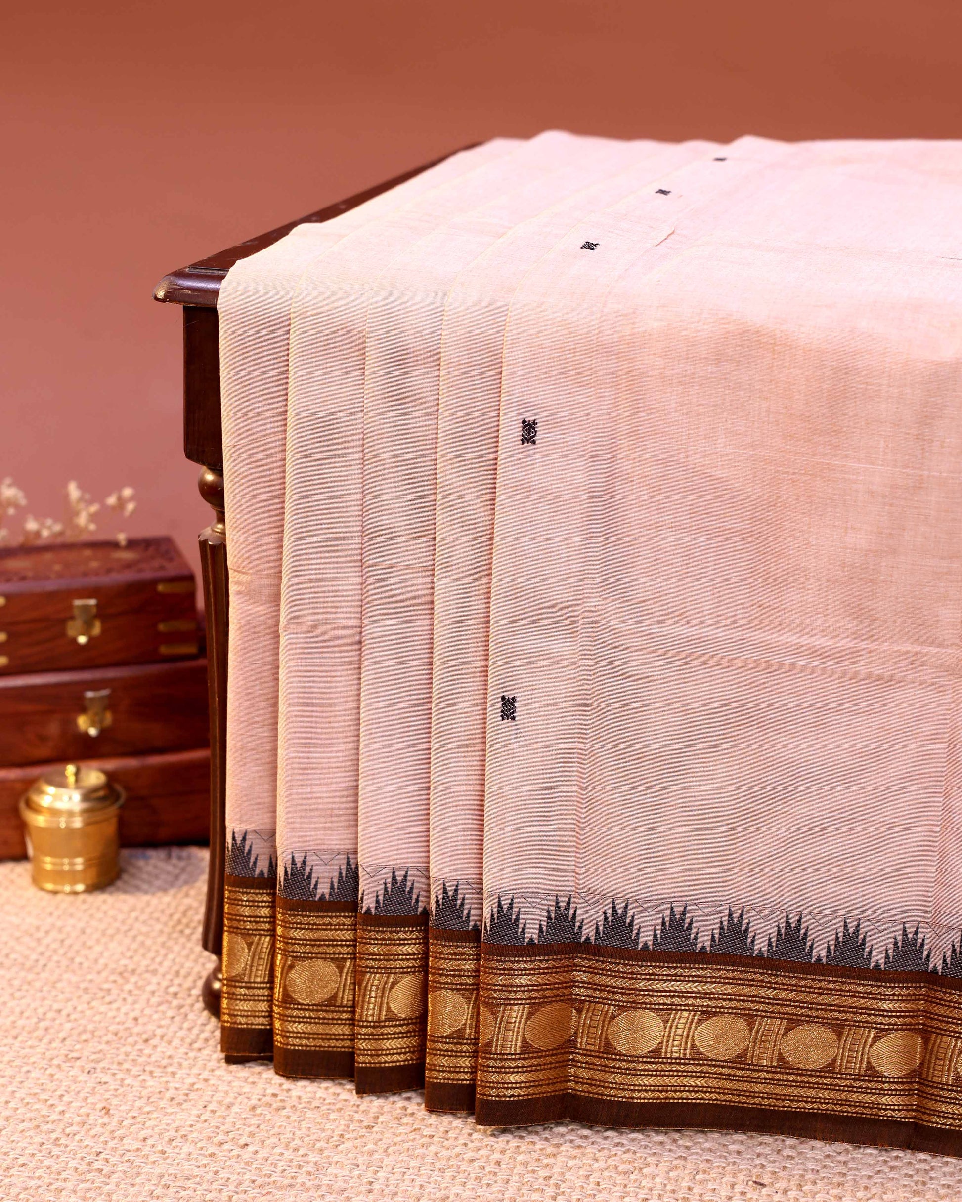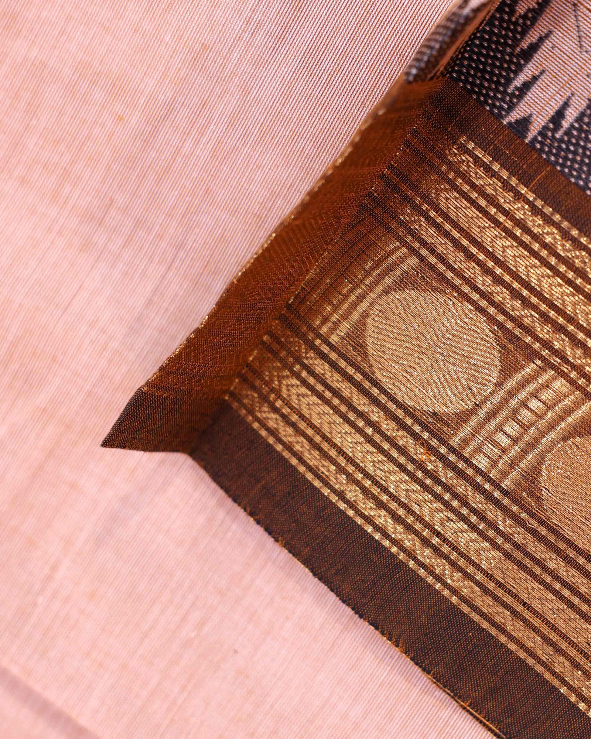 Traditional Handloom Chettinad Cotton Saree with Plain Body and Zari Woven Temple & Coin Motif Border - Sandal
