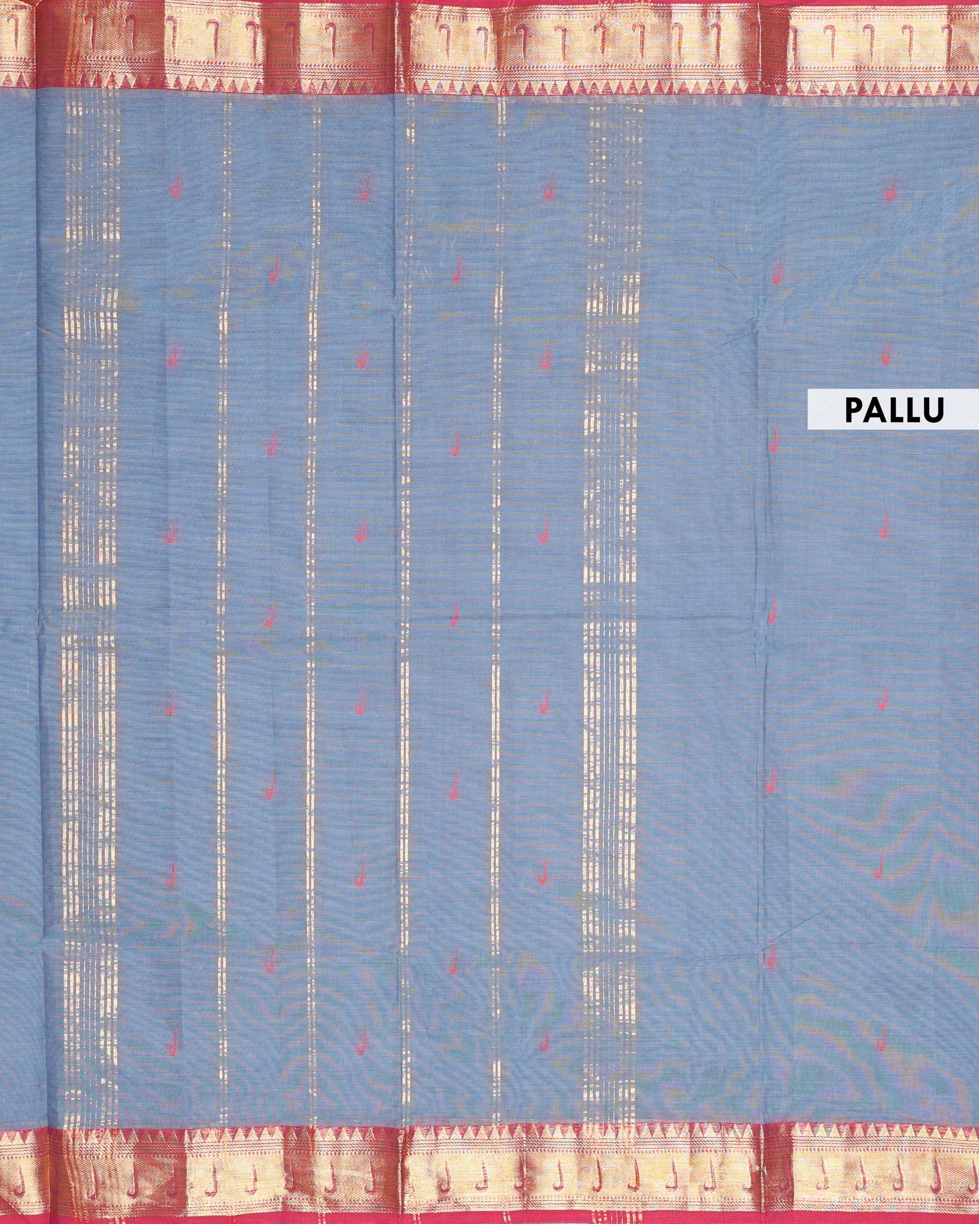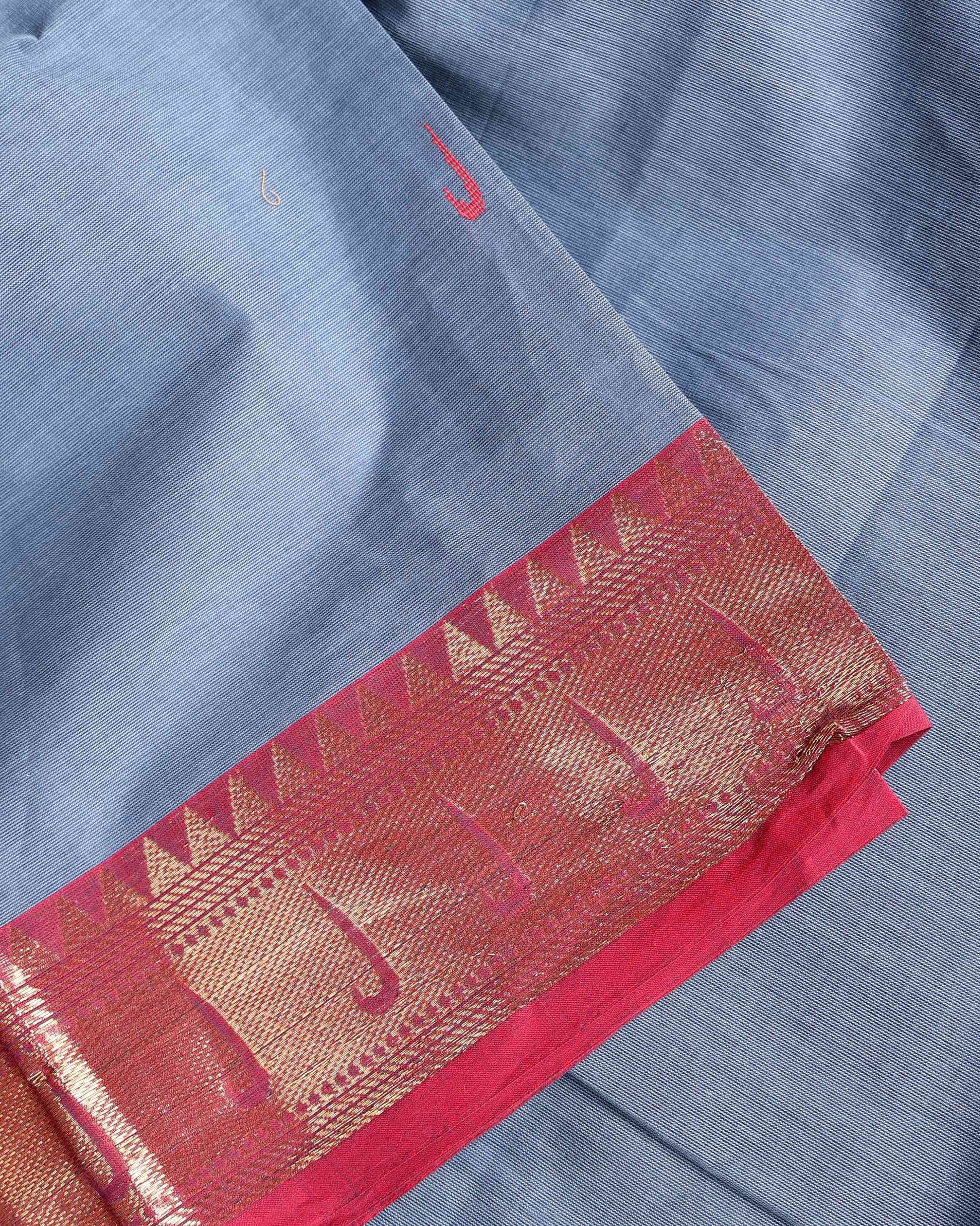 - Experience classic elegance with this traditional blue Chettinad handloom cotton saree a timeless striped pattern and a rich, contrasting maroon zari border.