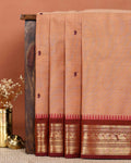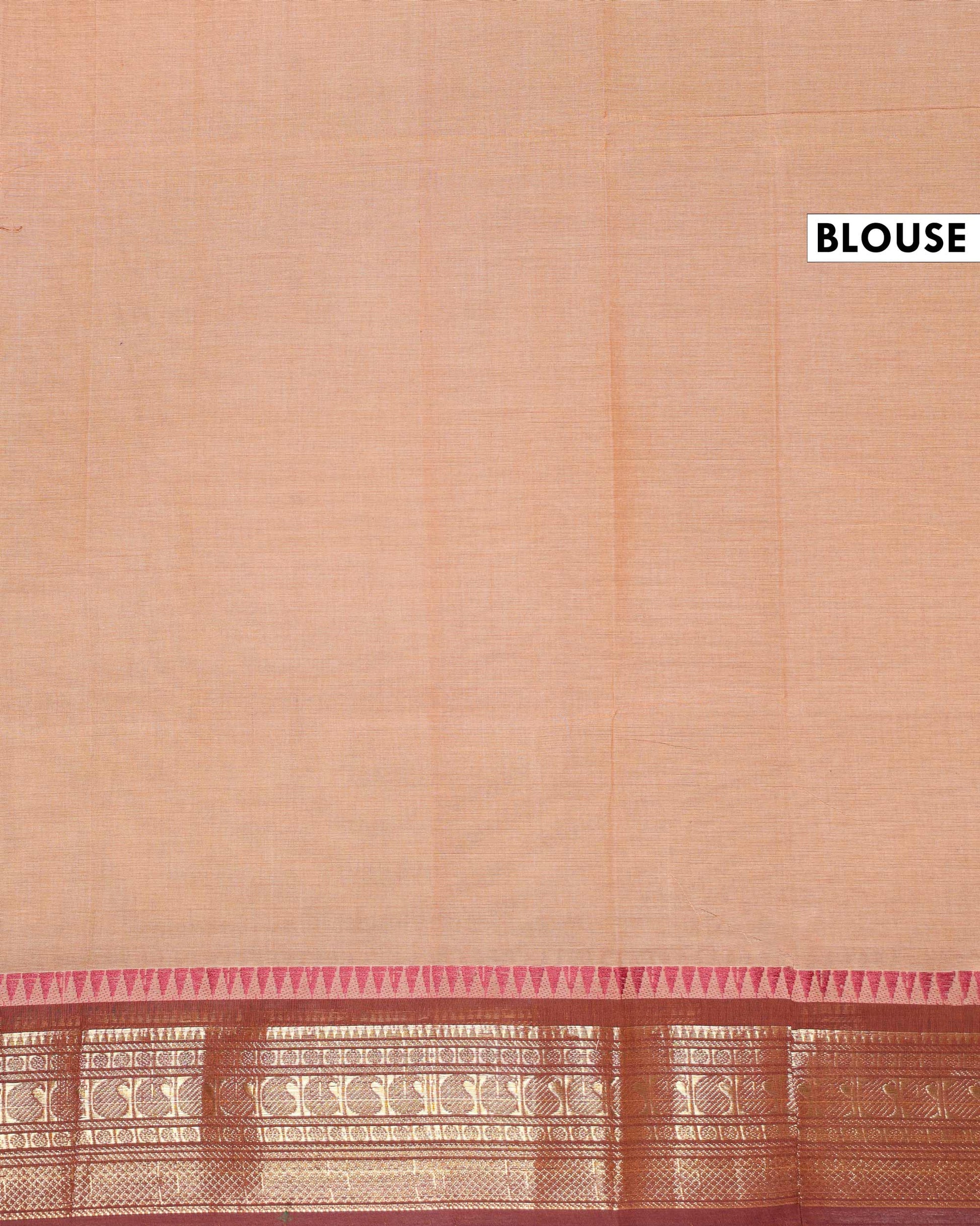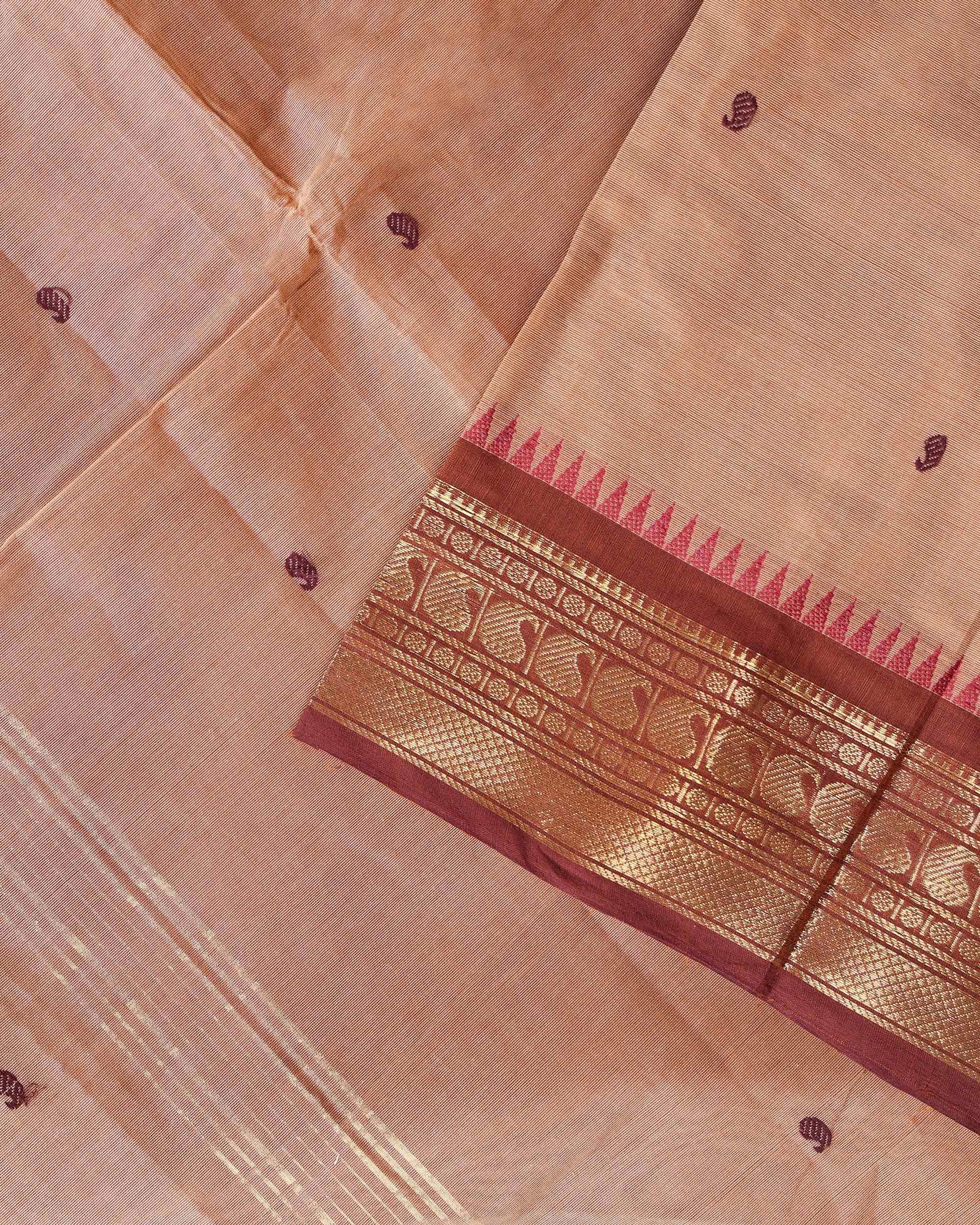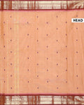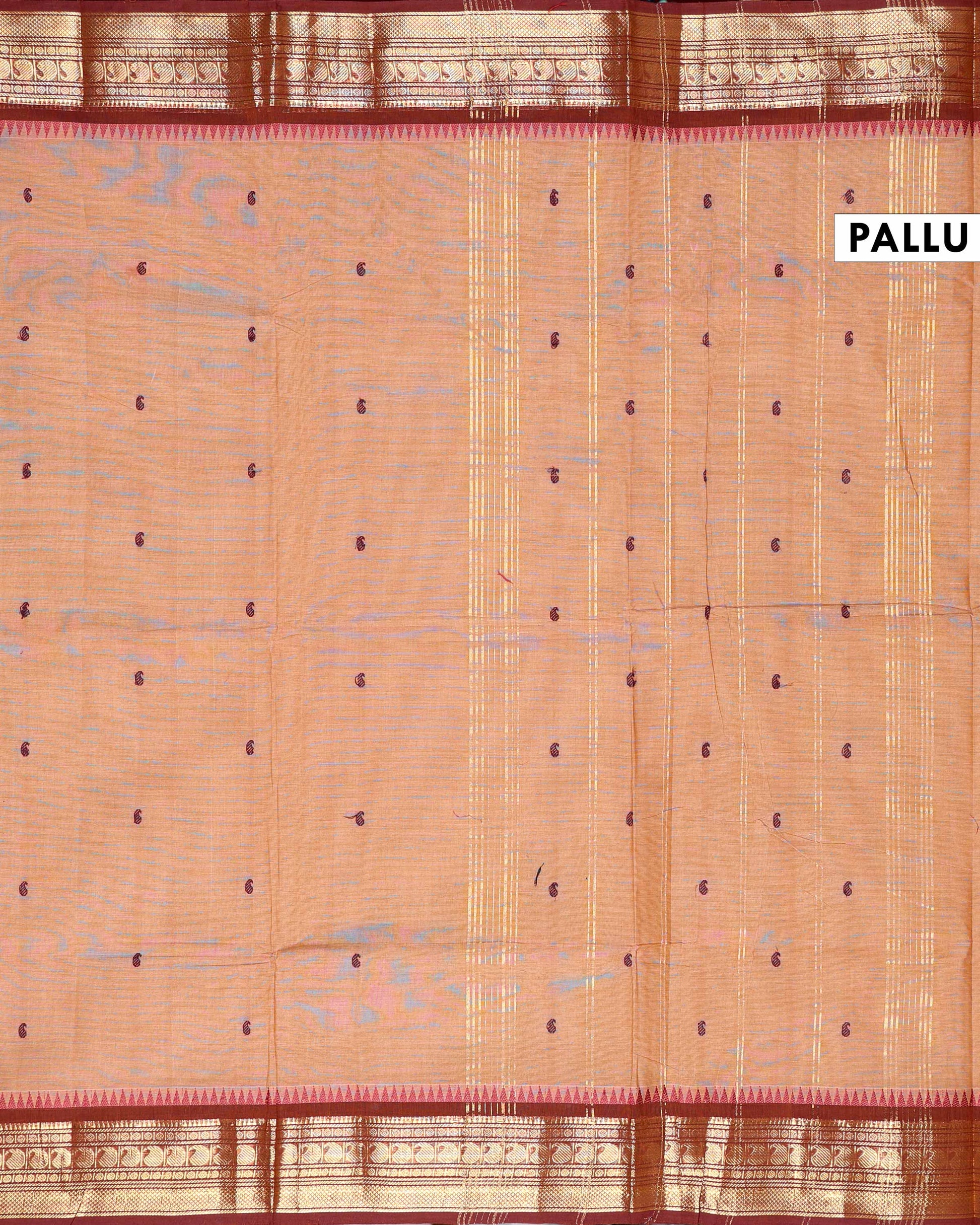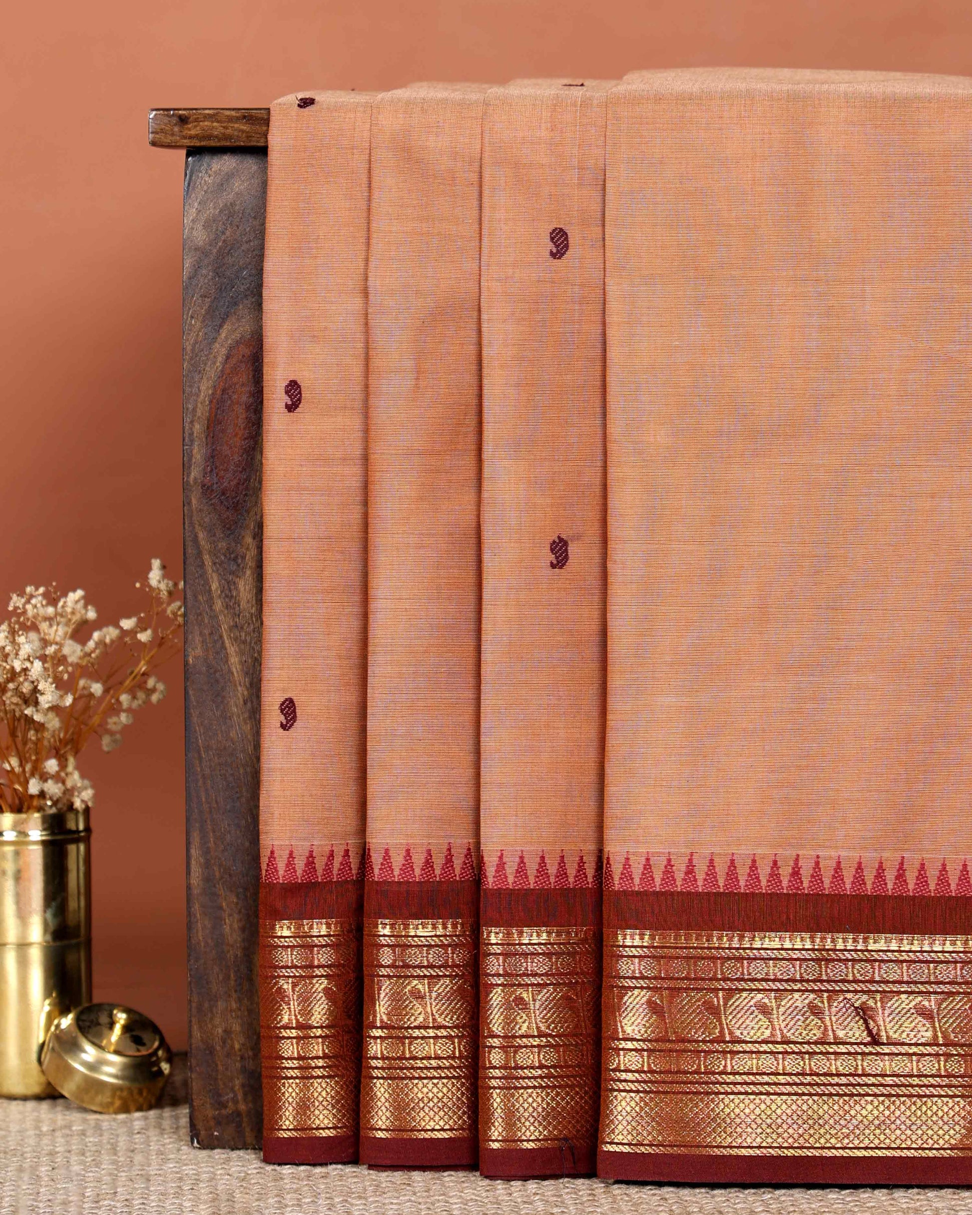 - Handwoven Peach Pure Chettinad Cotton Saree with Maroon and Gold Zari Border. This traditional handloom saree offers a soft, breathable drape, perfect for office wear or casual festive occasions.
