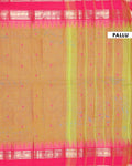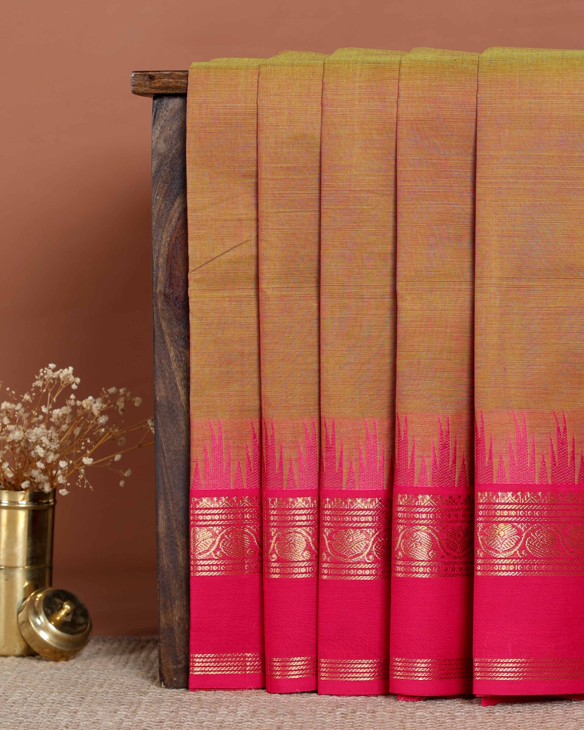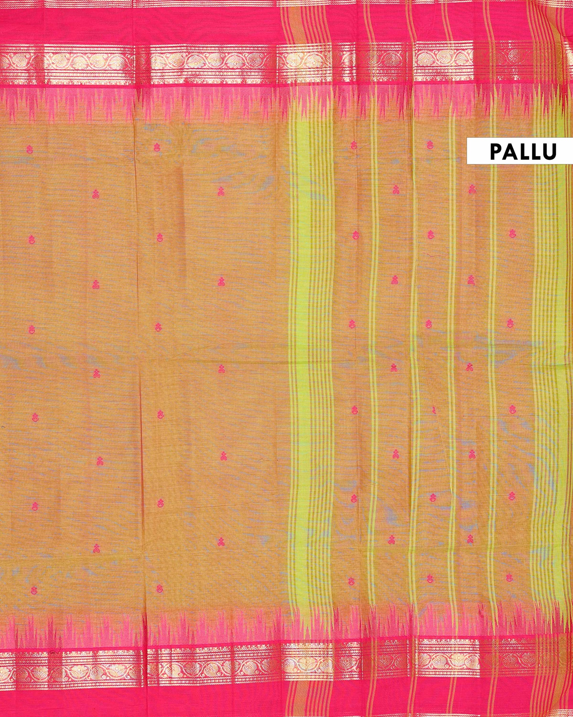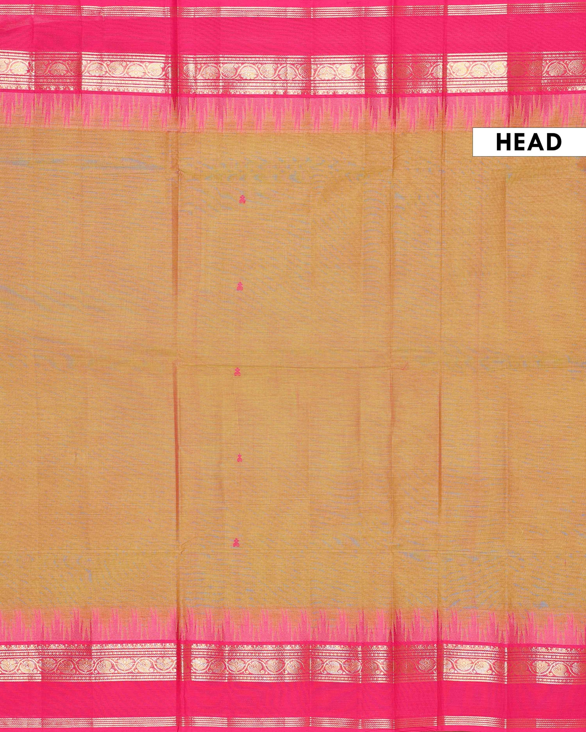 - Step into tradition with this soft, breathable Chettinad cotton saree a beautiful brown and a vibrant hot pink zari border, perfect for everyday grace or festive charm.