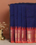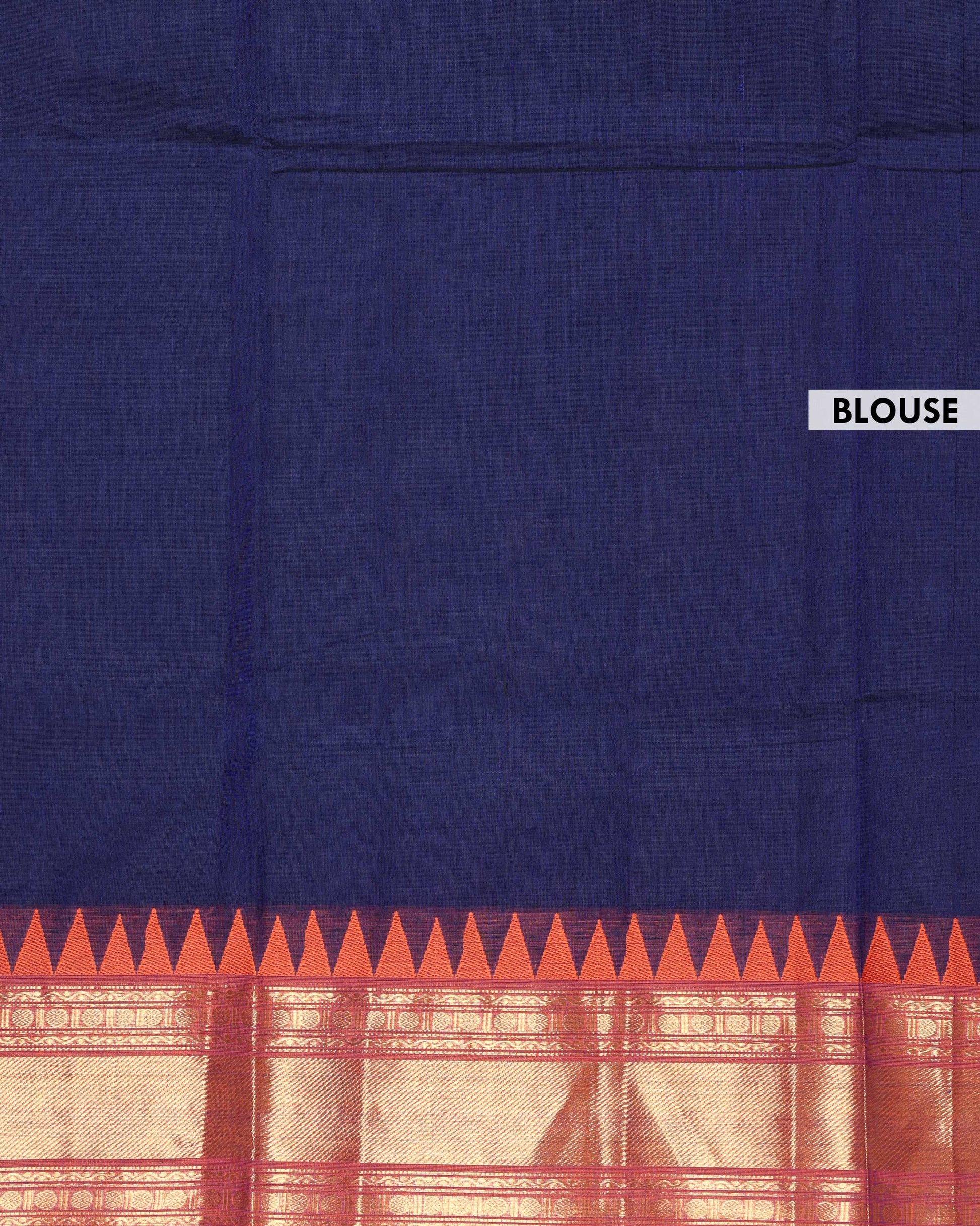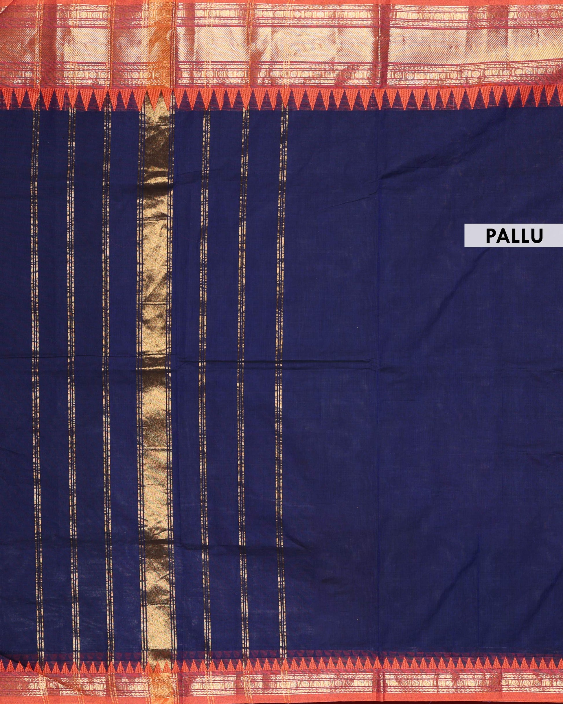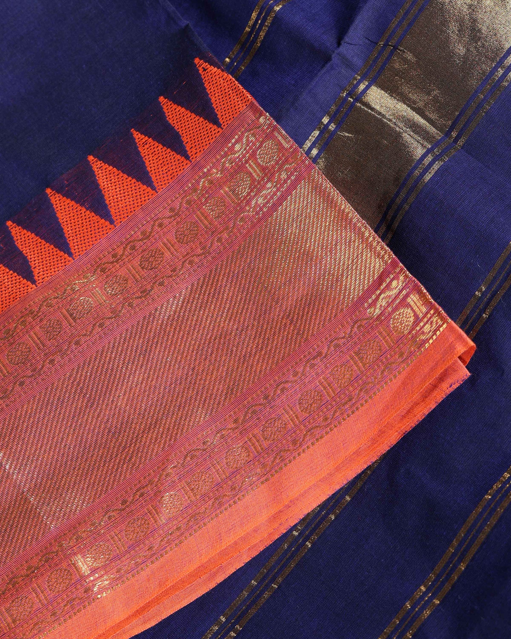 Traditional Handloom Chettinad Cotton Saree with Woven Temple Border and Intricate Zari Detailing - Dark Blue