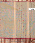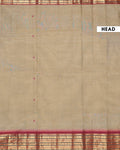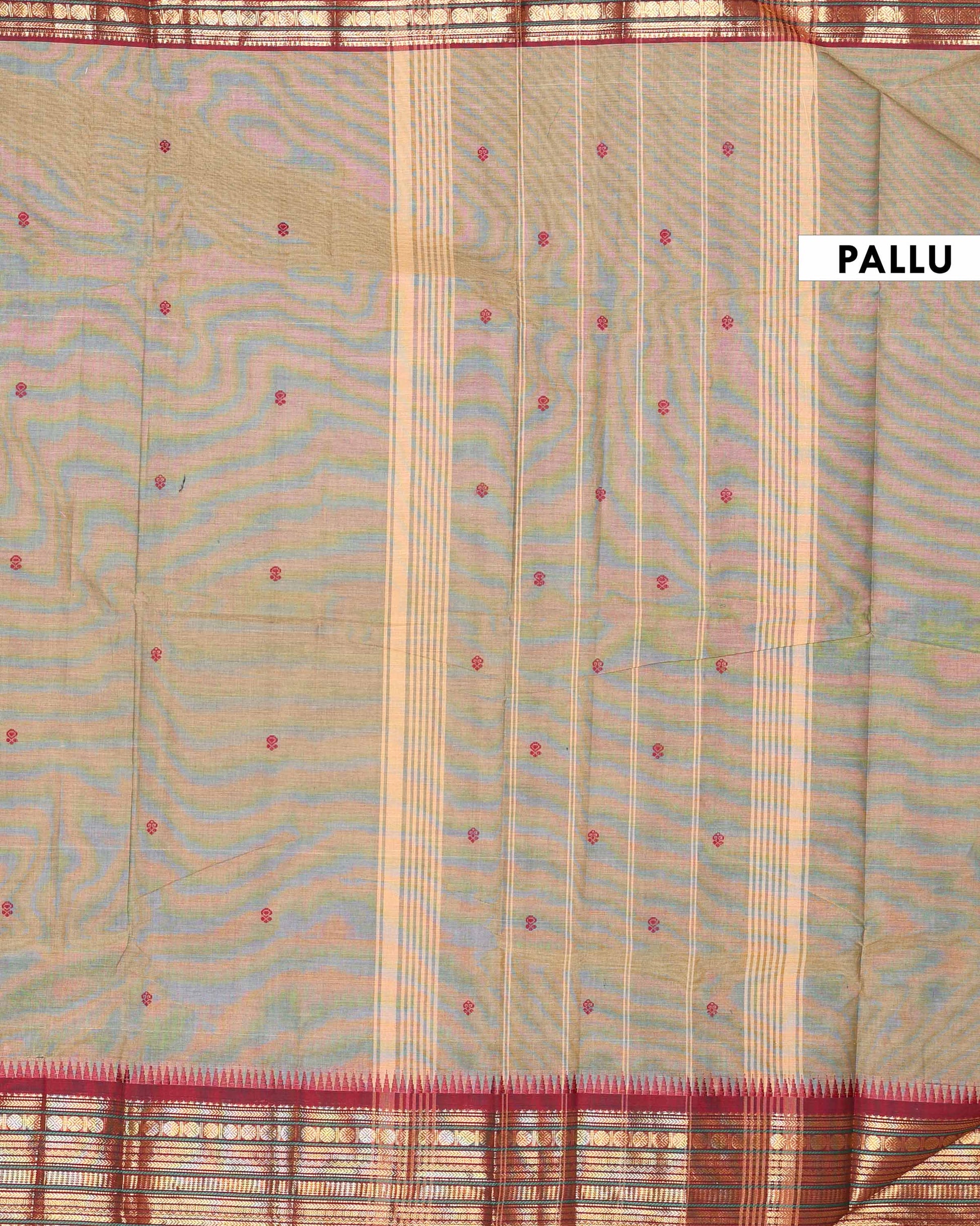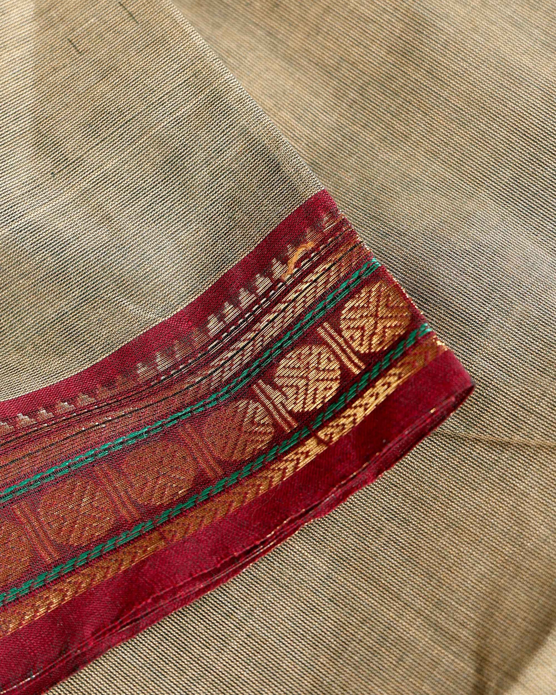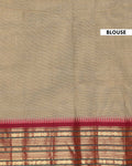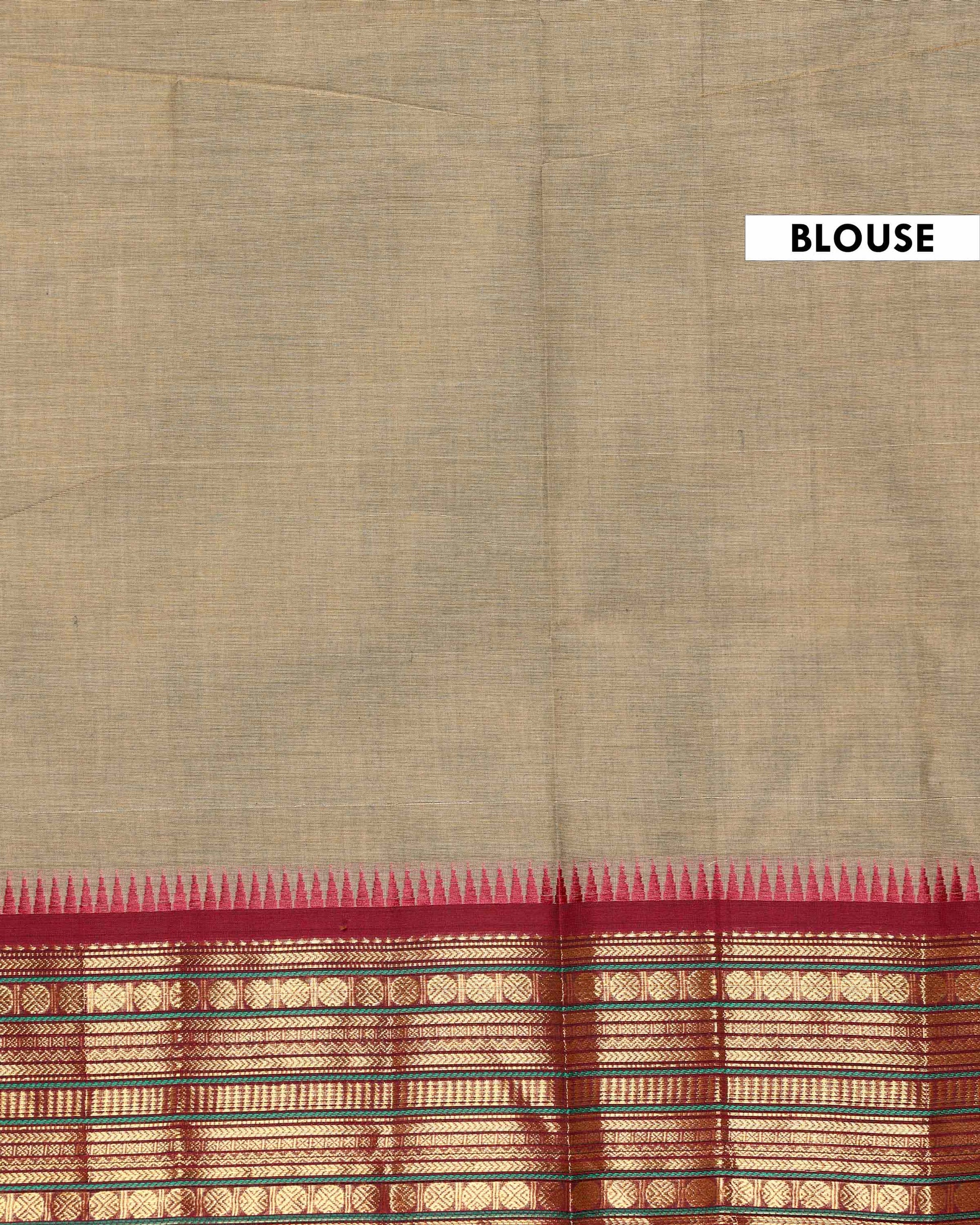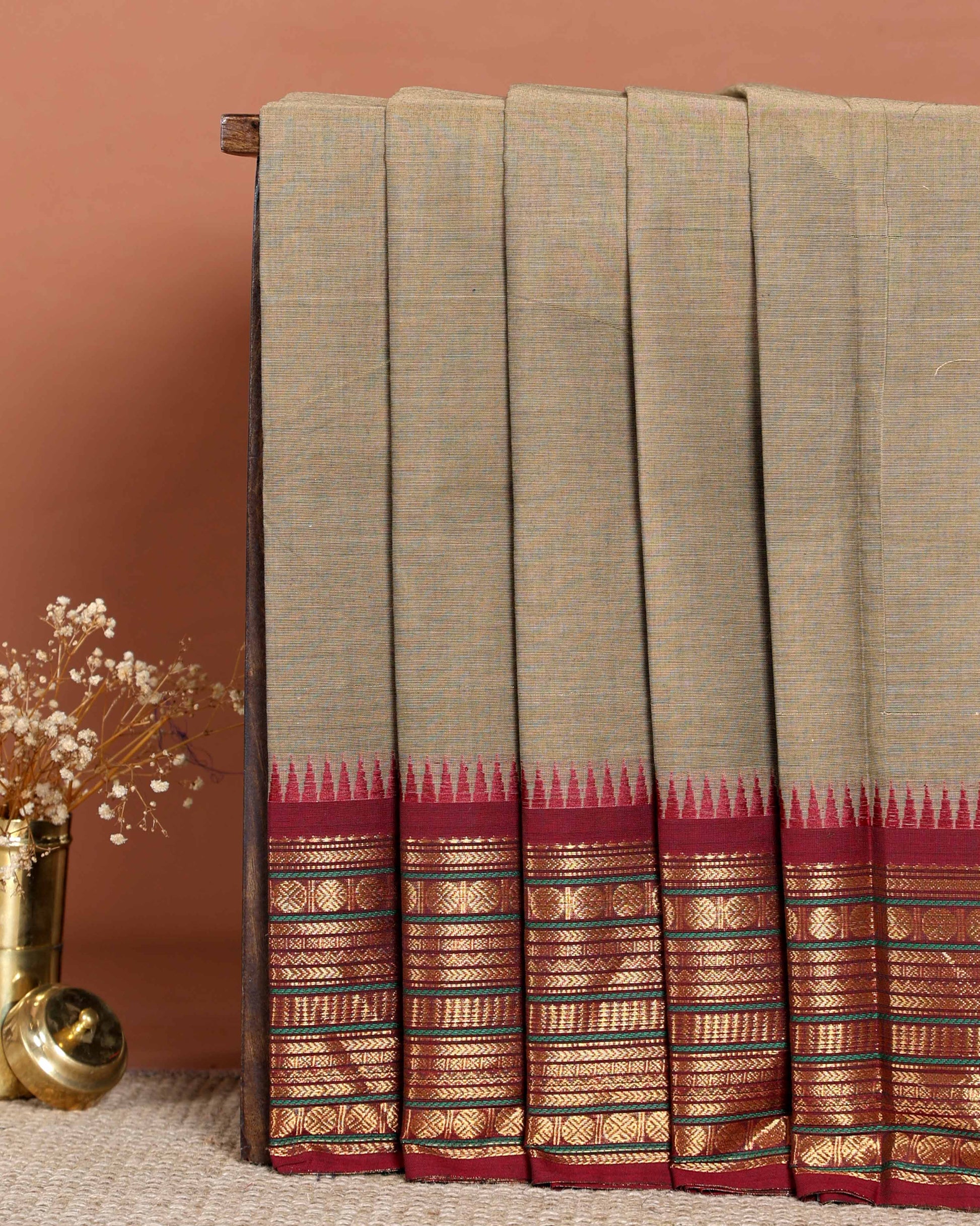 - This traditional Chettinad cotton saree a light brown striped body and a contrast rich red temple border with golden zari details.