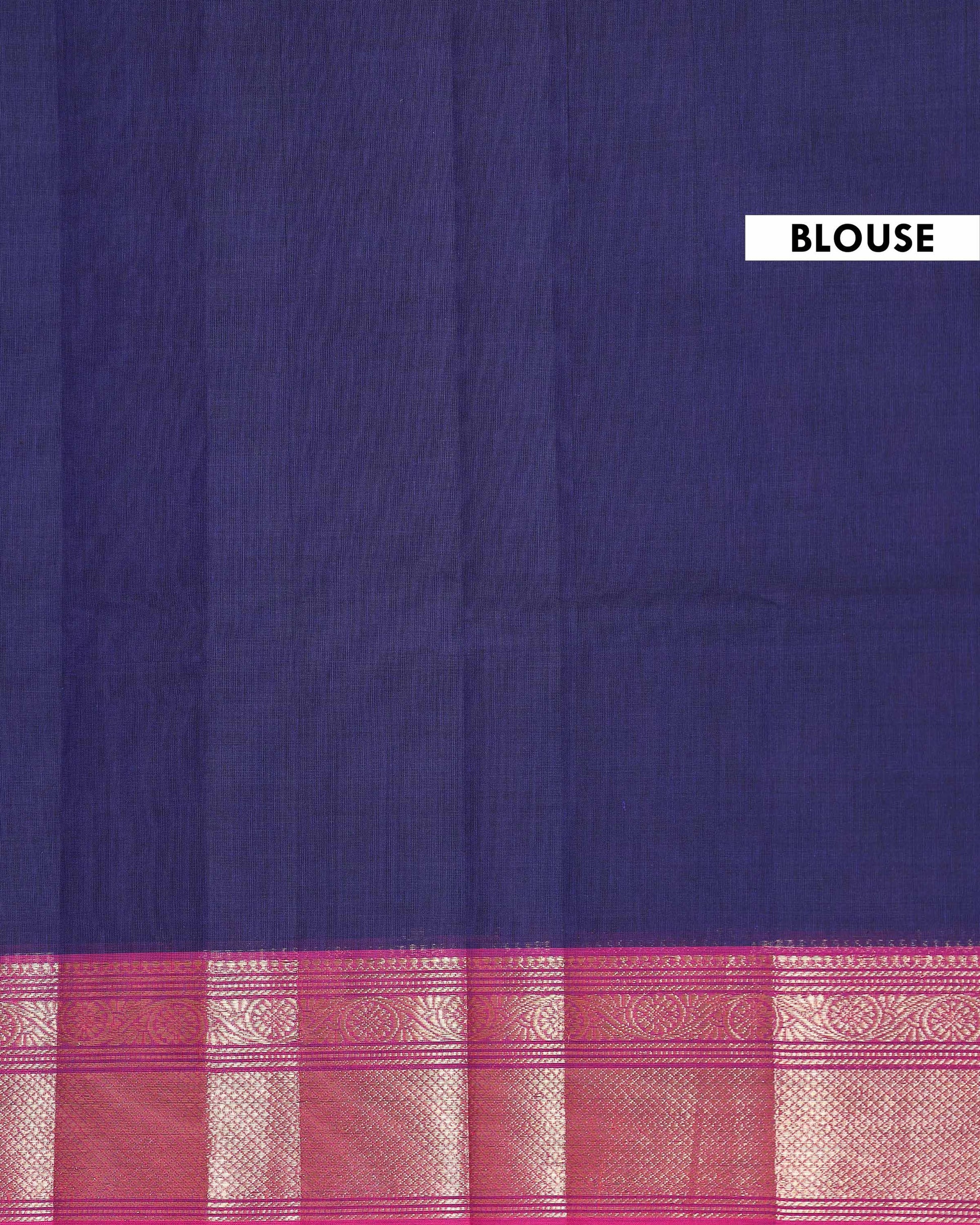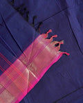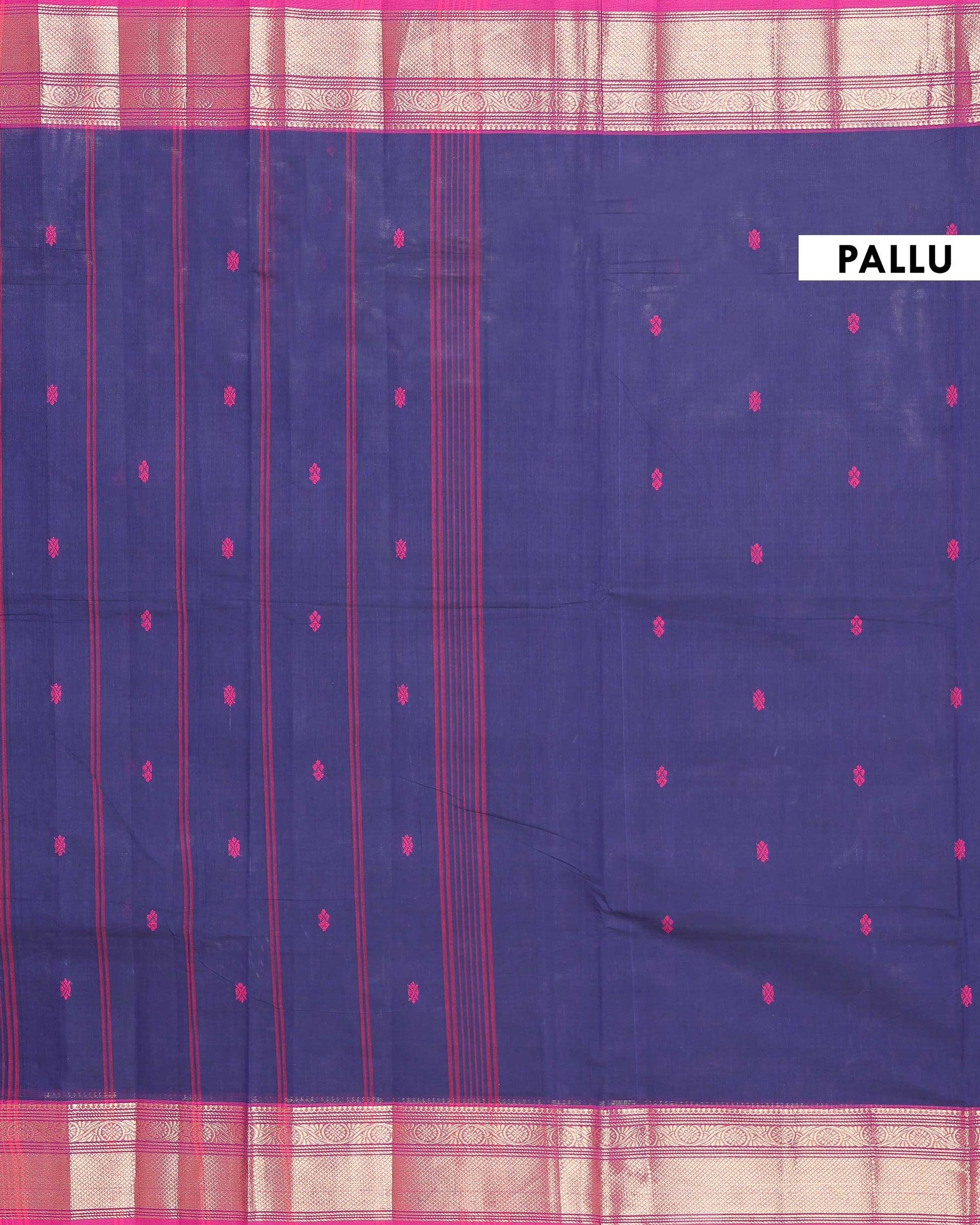 - This traditional handloom Chettinad cotton saree a vibrant Dark Blue body with fine horizontal stripes and a rich, contrasting Pink and gold zari border.