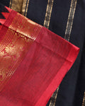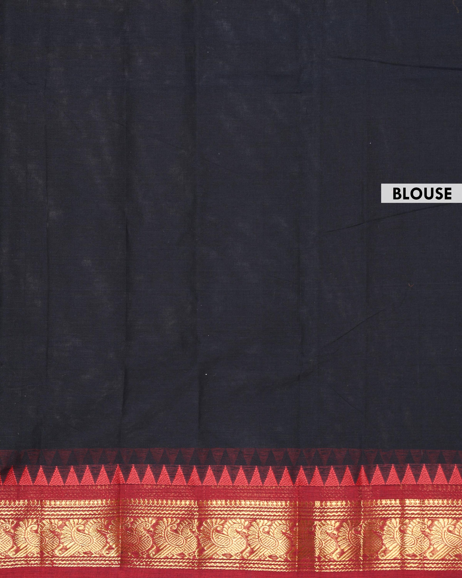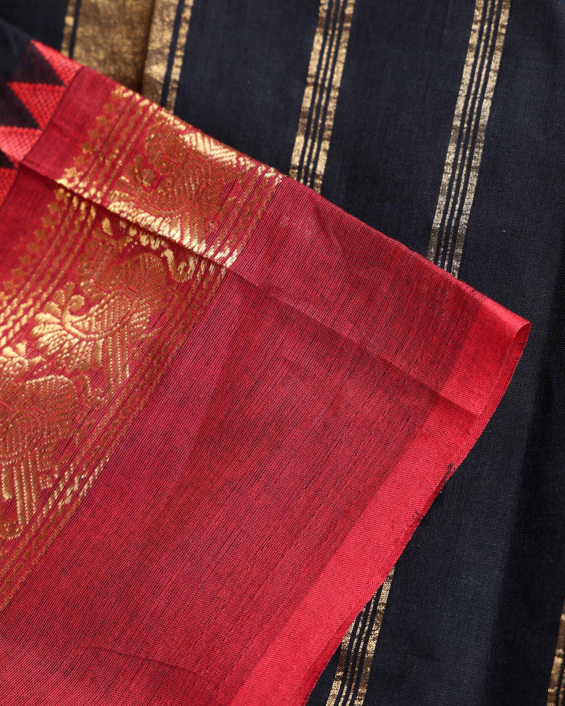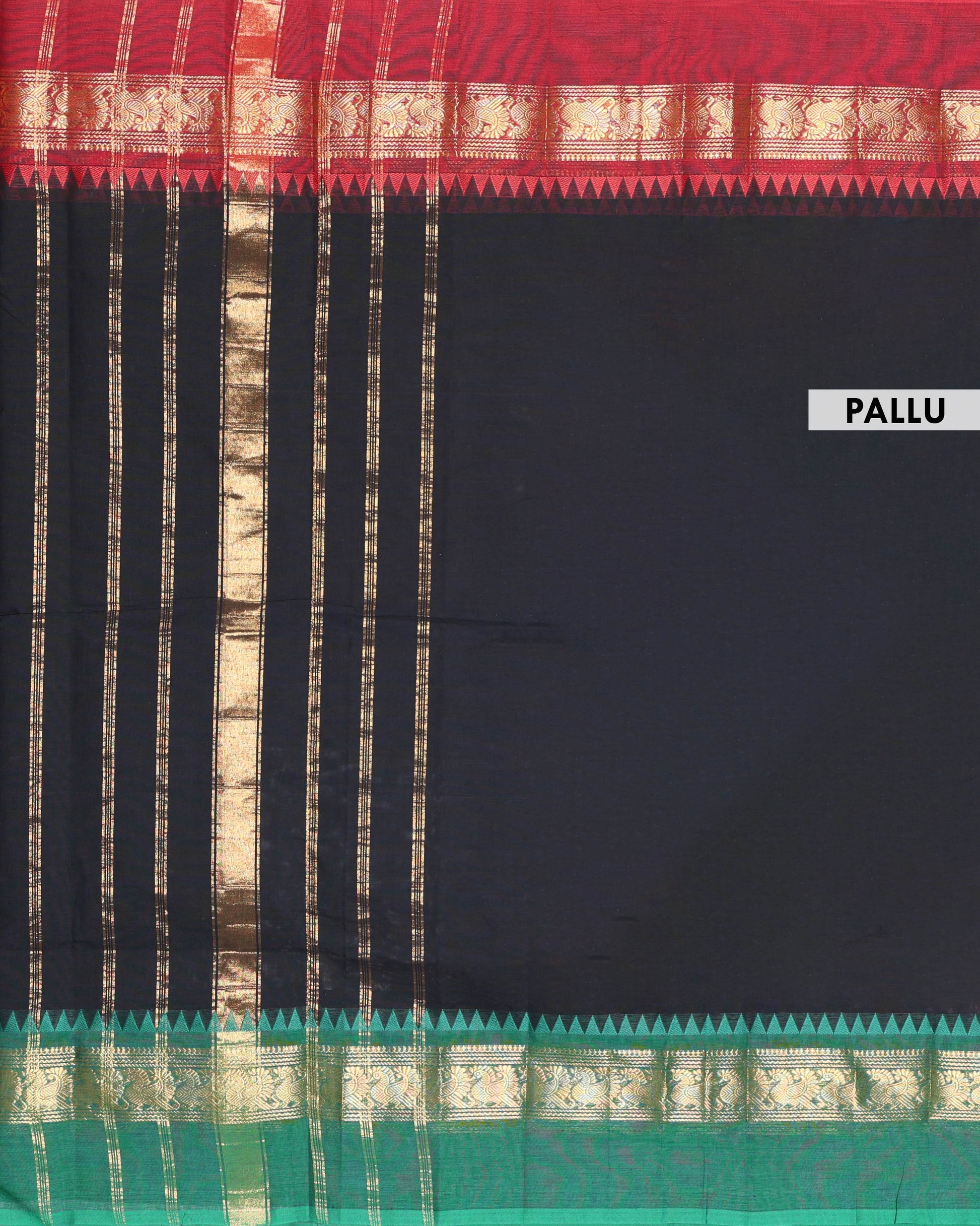 - This stunning black Chettinad Cotton Saree a rich traditional red and gold zari border