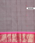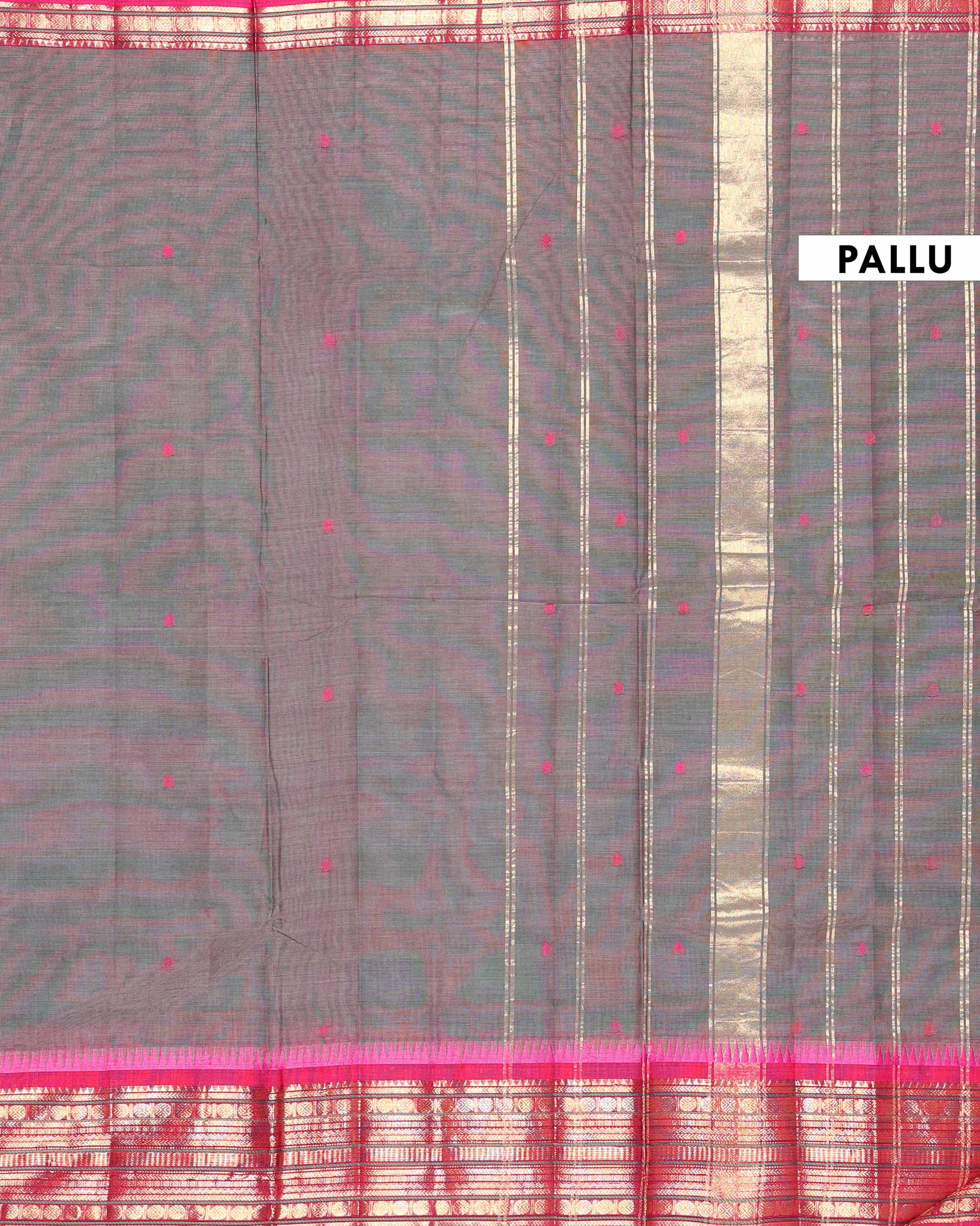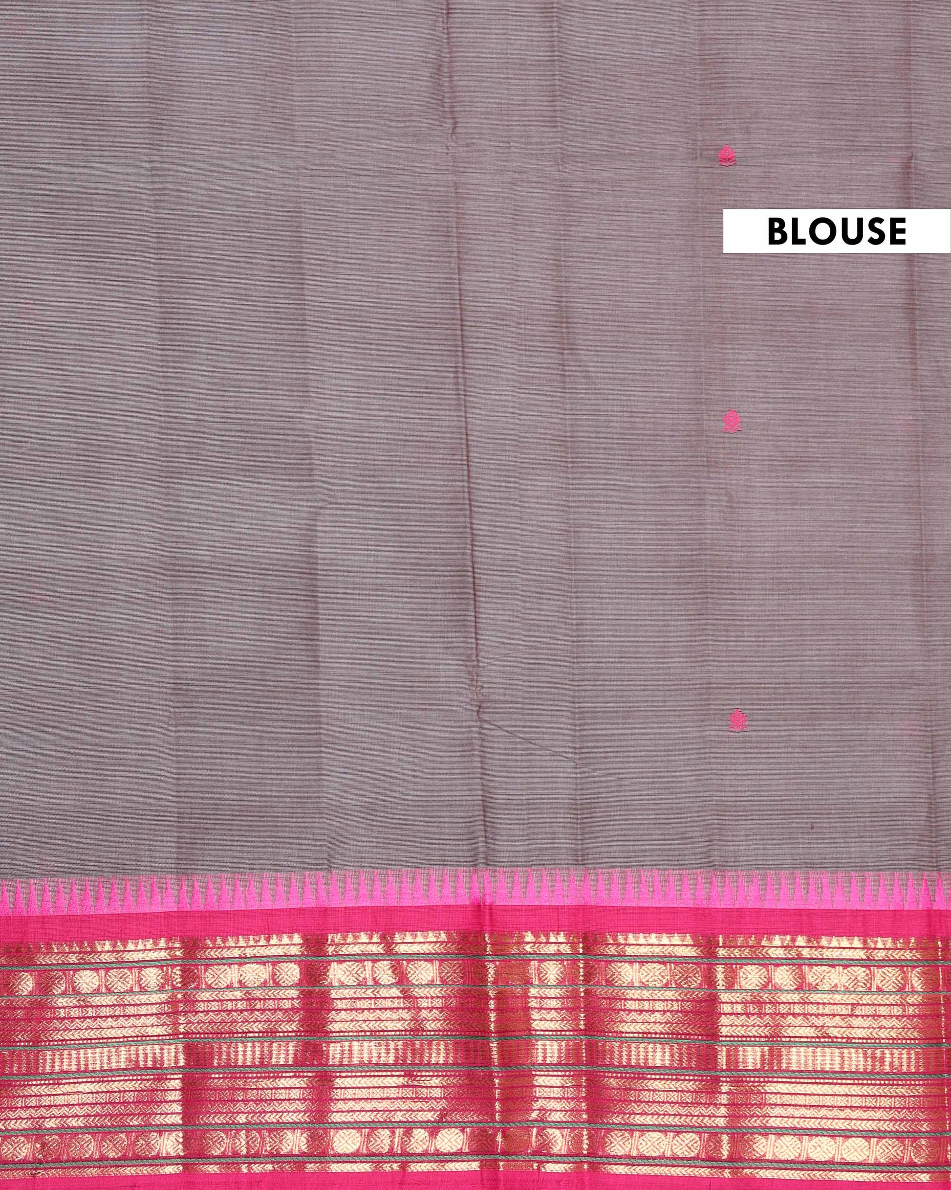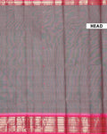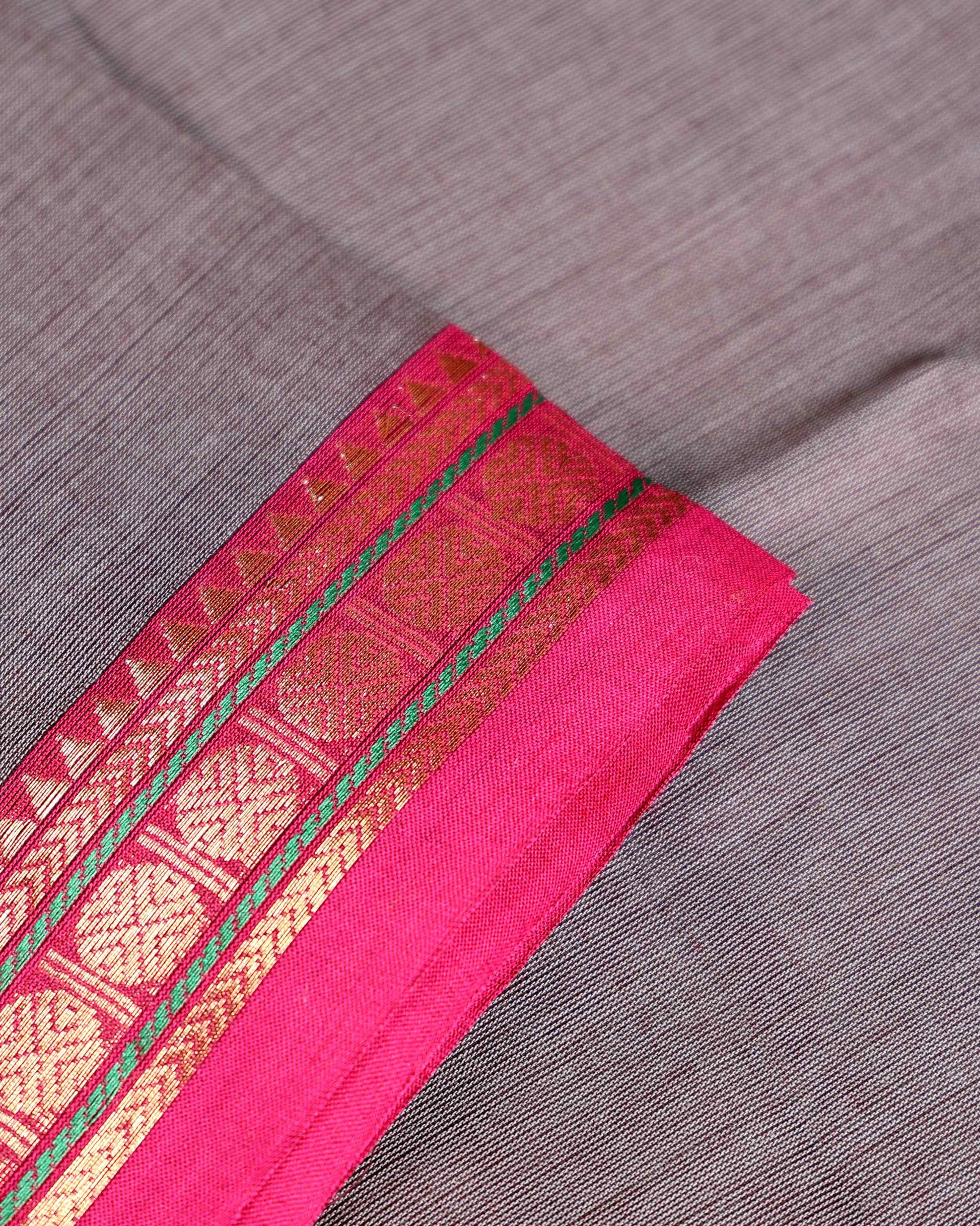 - Discover this authentic Chettinad cotton saree a sophisticated Dark grey striped body and a vibrant magenta border with intricate gold zari work, blending classic craftsmanship with modern elegance.