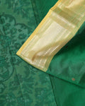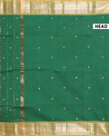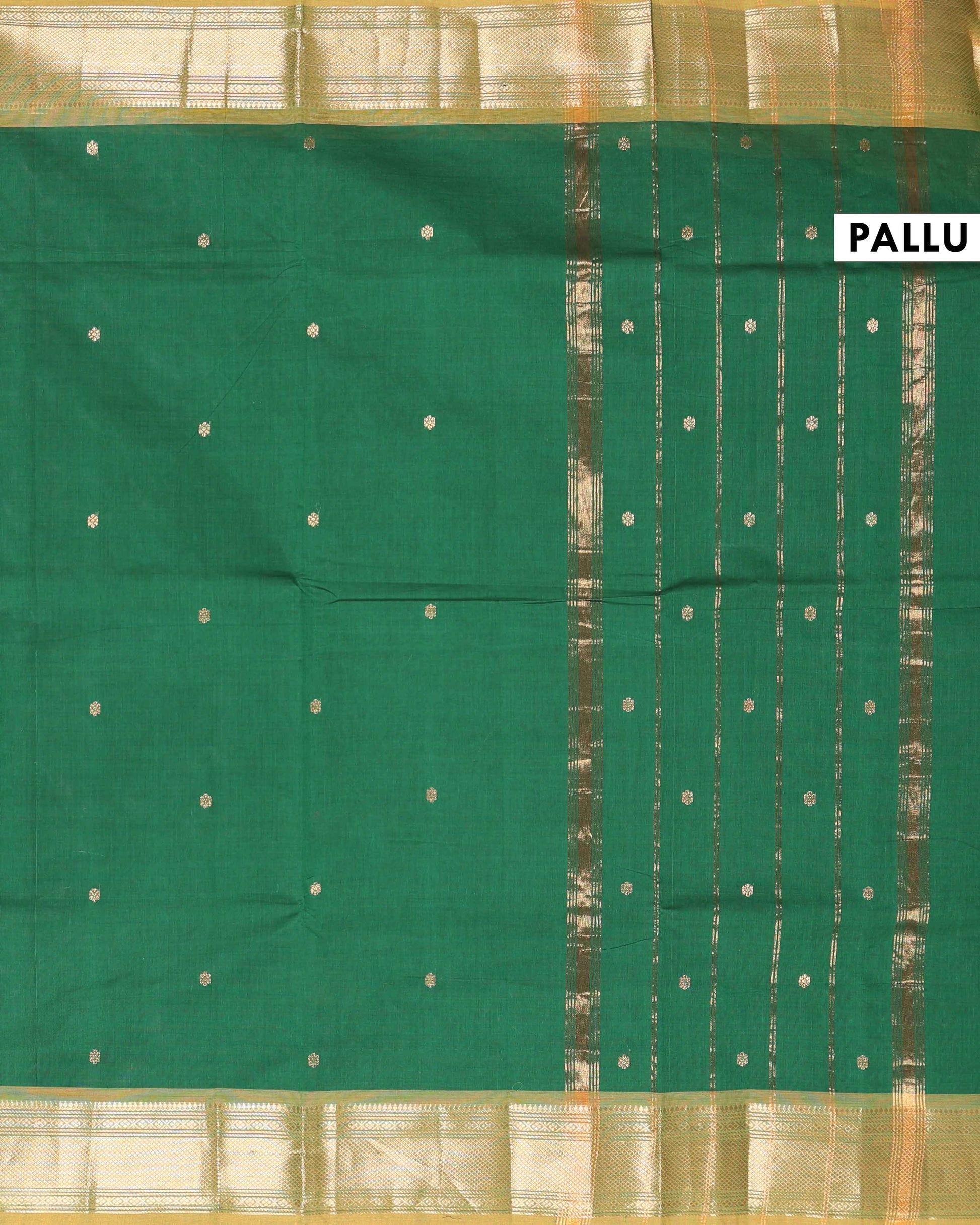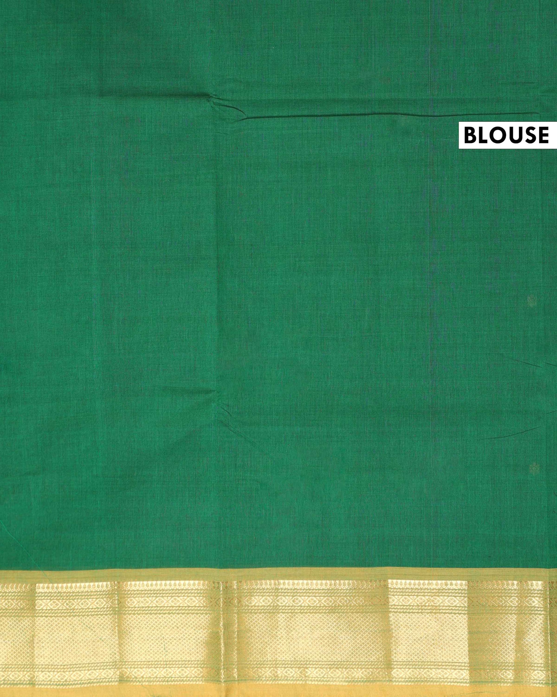- Drape yourself in the timeless elegance of this handloom Chettinad cotton saree a rich green hue and classic gold border.