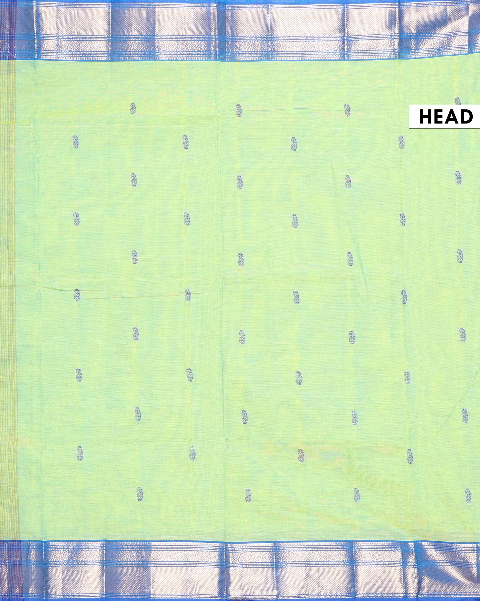 Traditional Handloom Chettinad Cotton Saree with Zari Woven Temple Border and Subtle Butta Motifs - Green