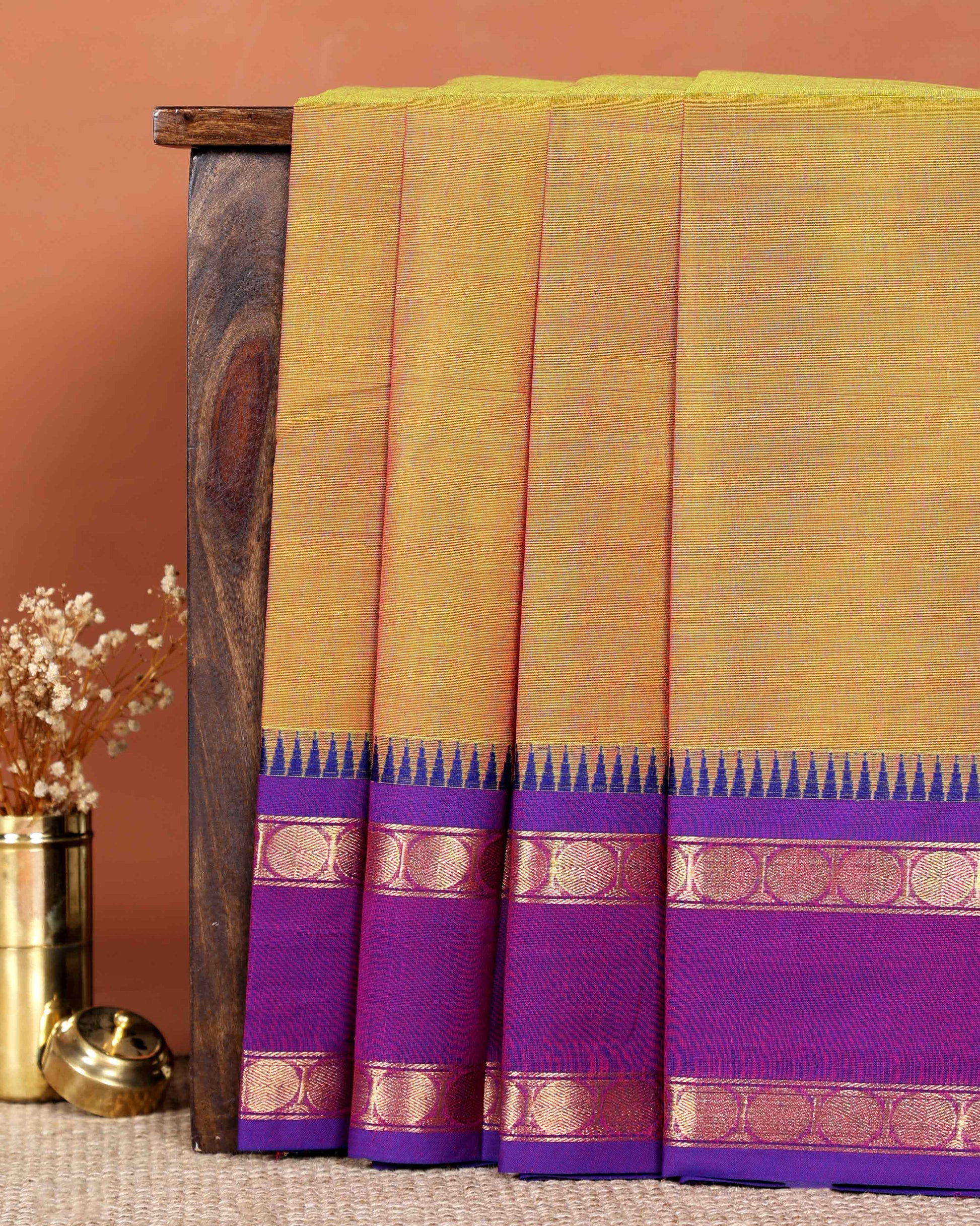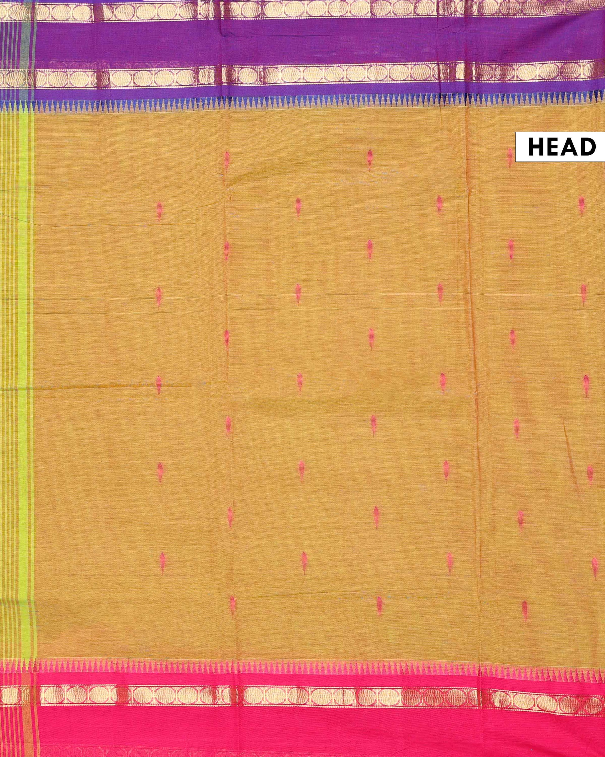 - This handloom Chettinad cotton saree a vibrant Brown body and a rich contrasting purple korvai border