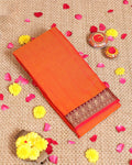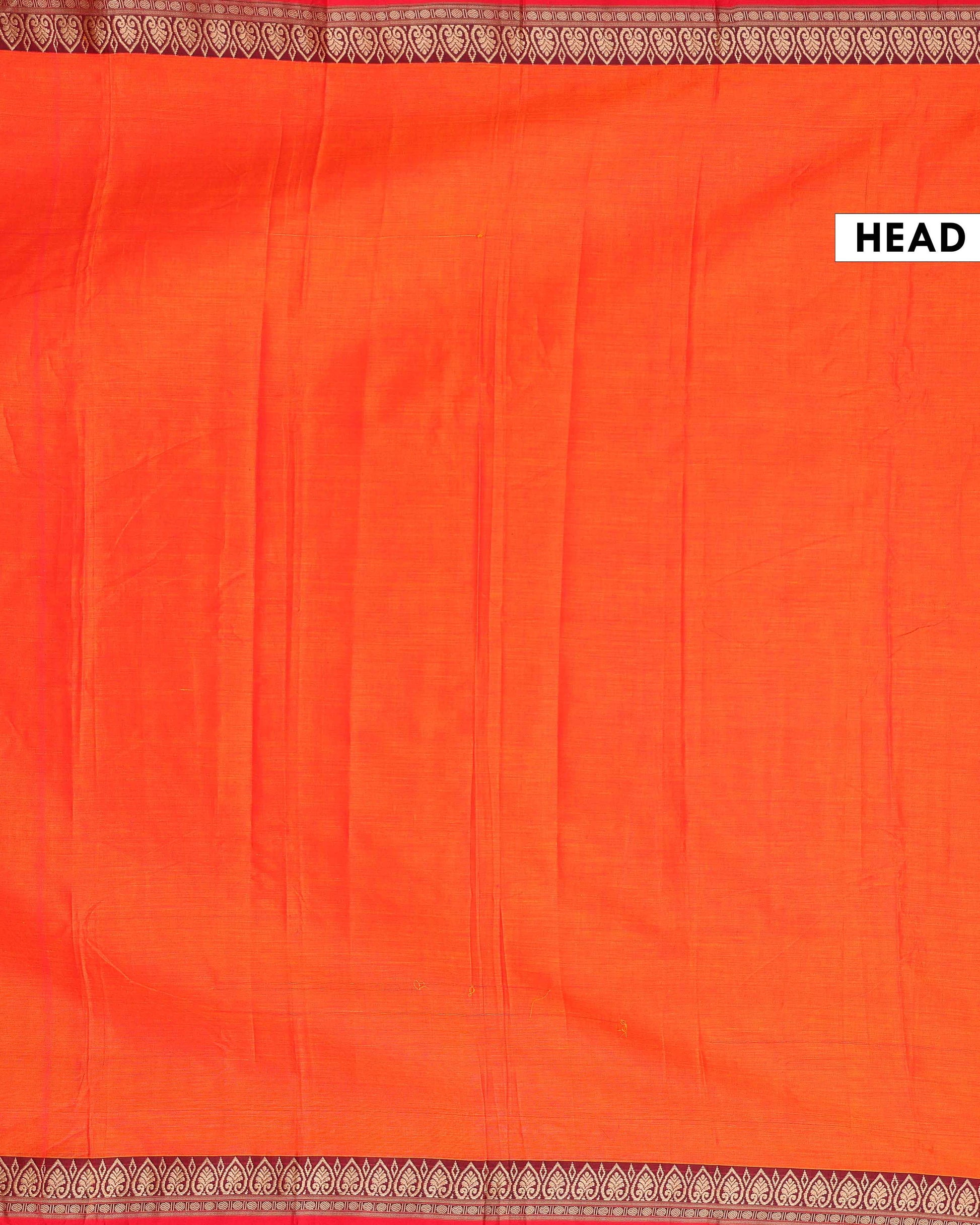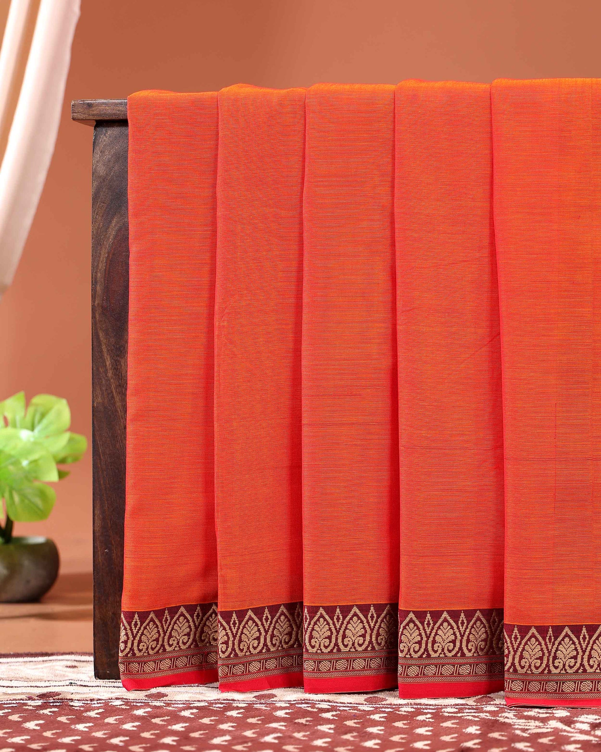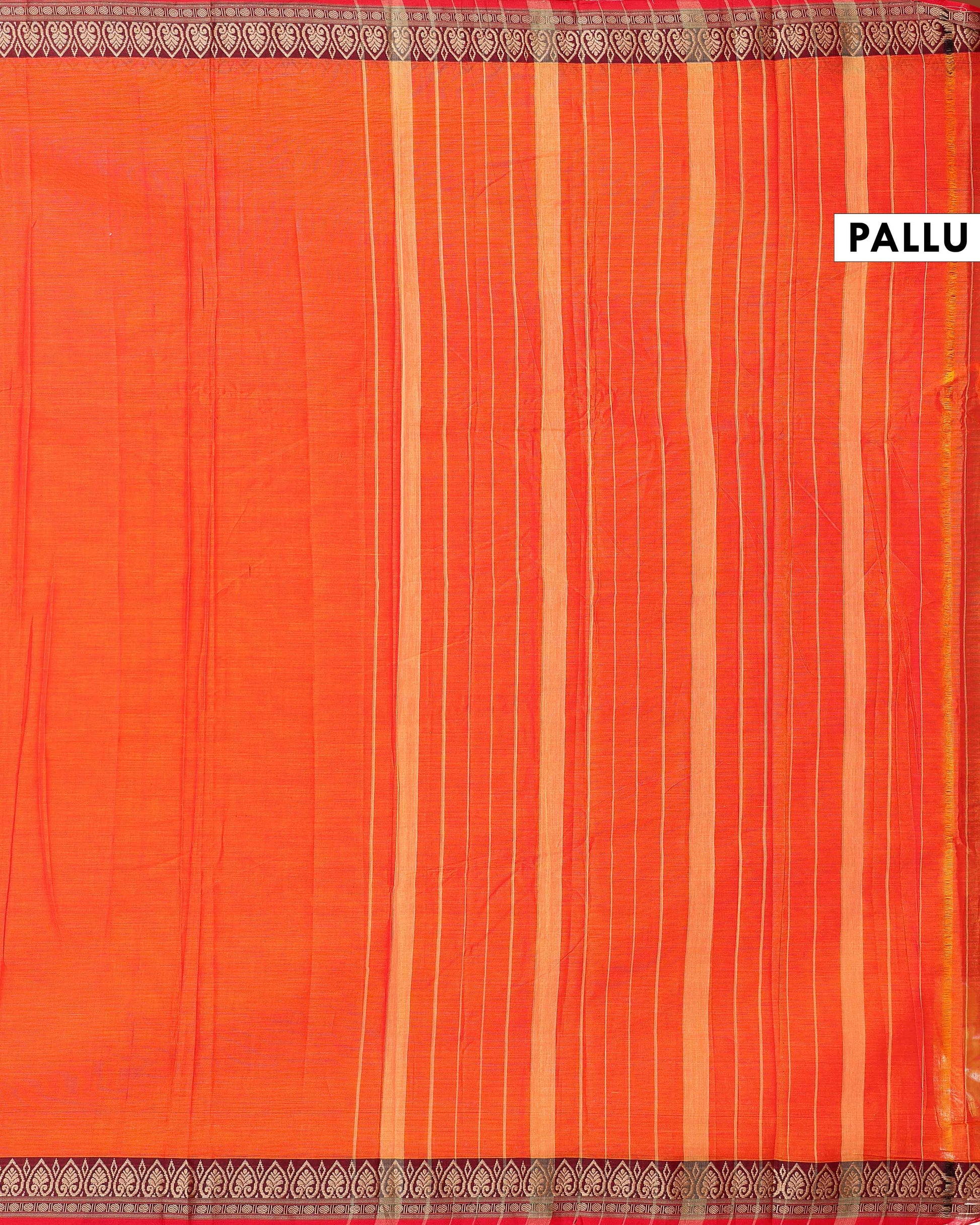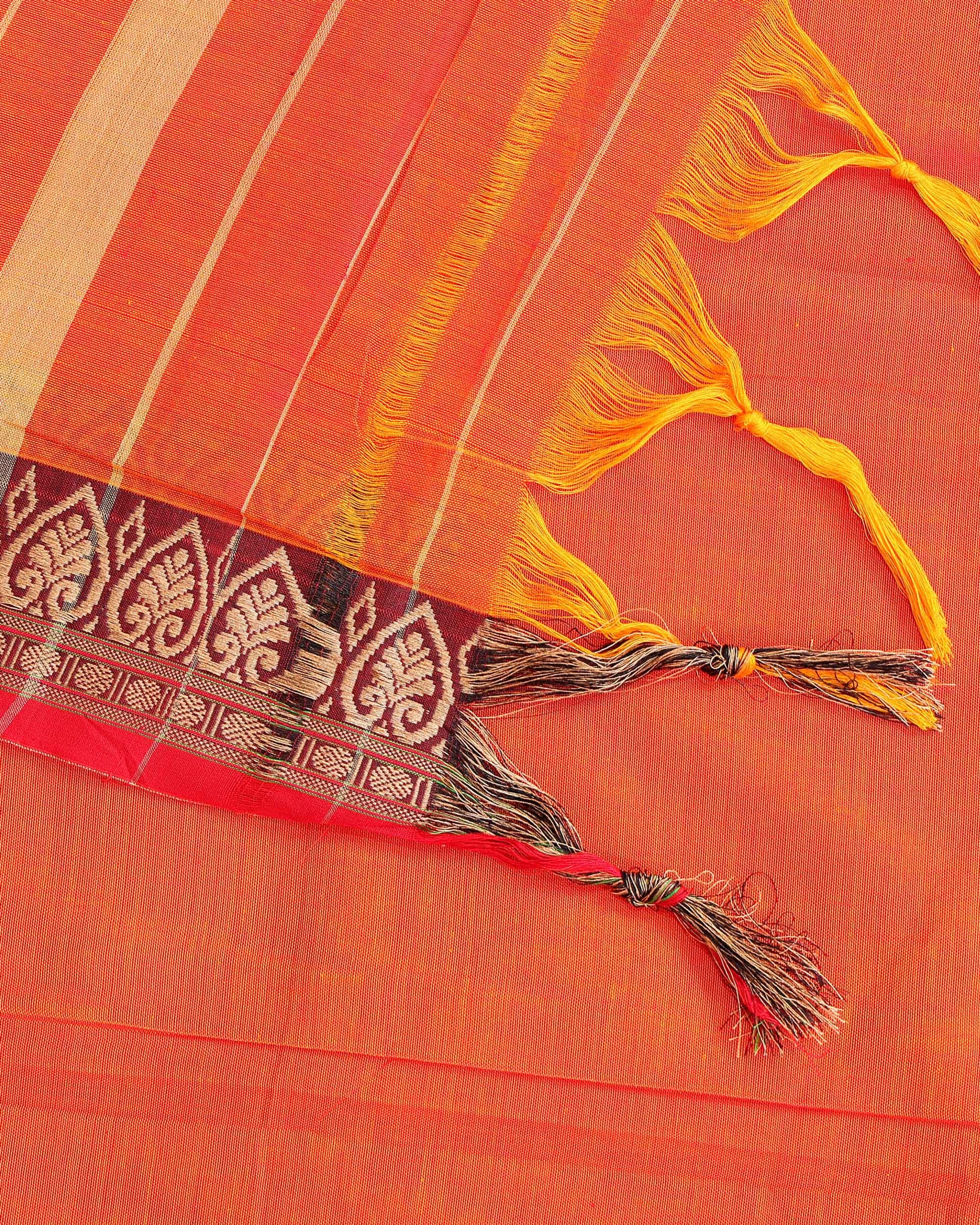 - This vibrant orange Narayanpet cotton saree from a rich traditional maroon and gold border.