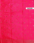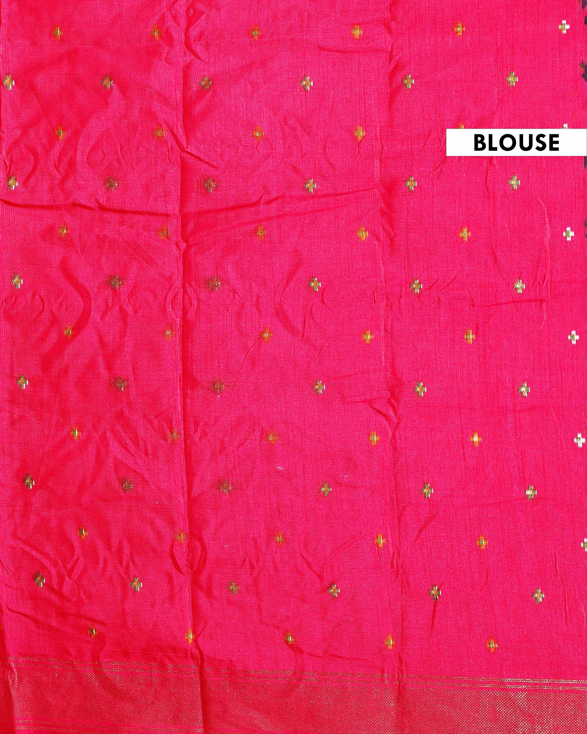 - This handloom Ikkat silk Cotton saree a vibrant magenta body with intricate ikat motifs and a contrasting dark green border and pallu