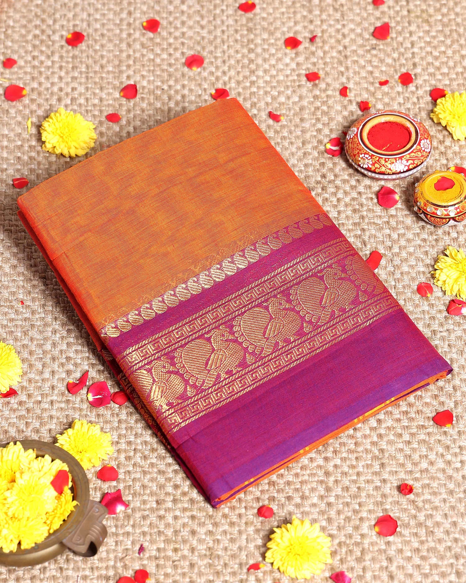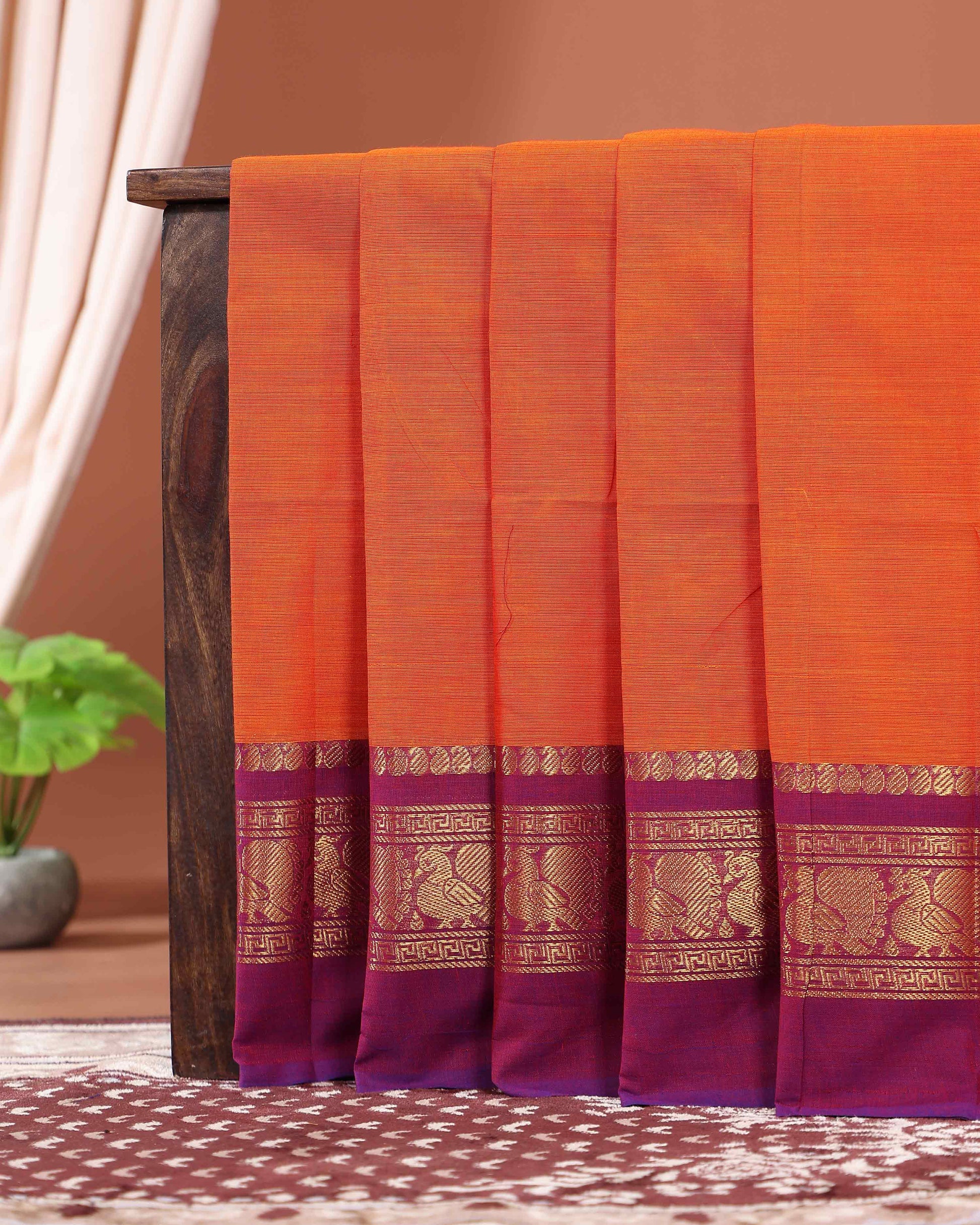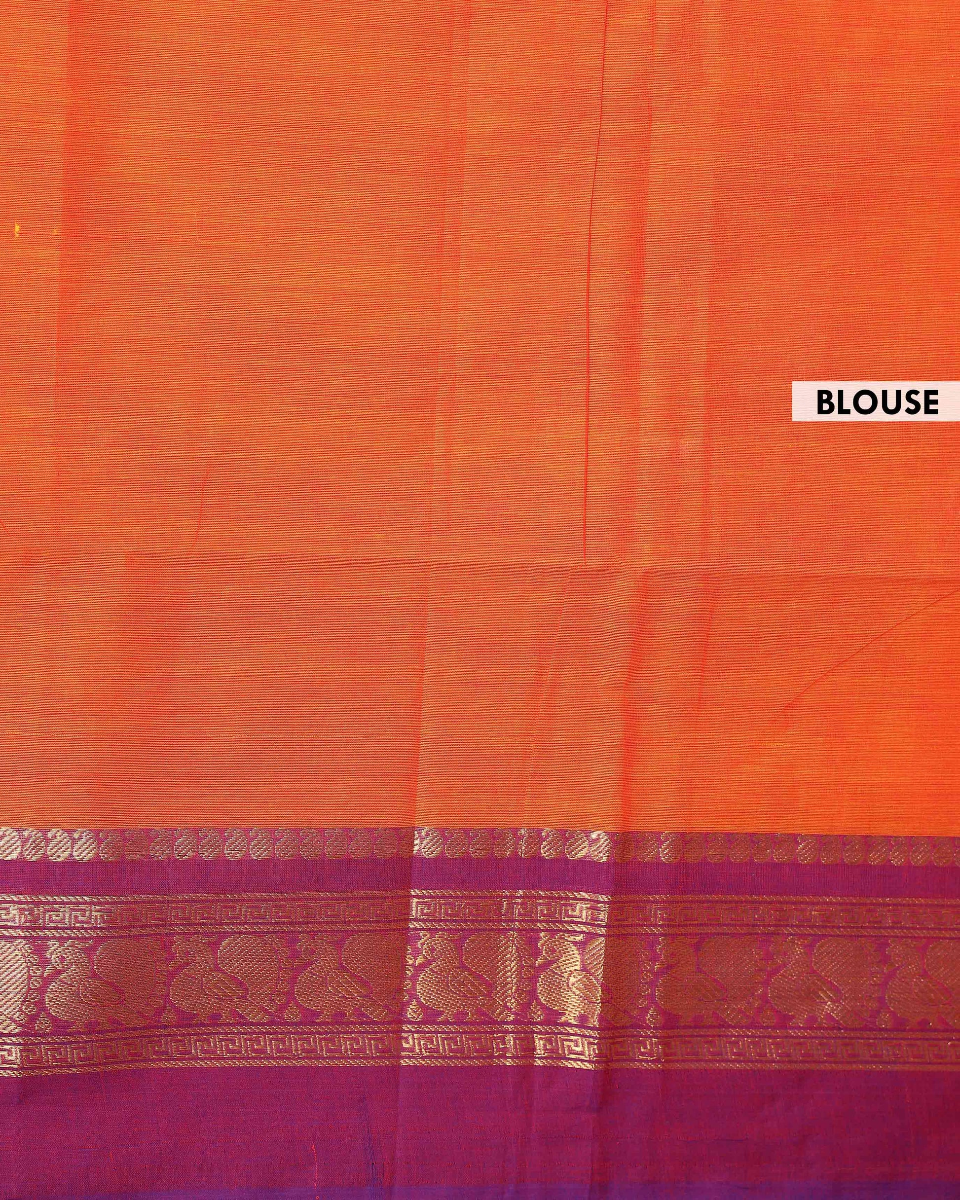 - This pure handwoven Kanchi cotton saree in vibrant orange a striking purple and gold zari border with traditional motifs, perfect for everyday elegance or festive