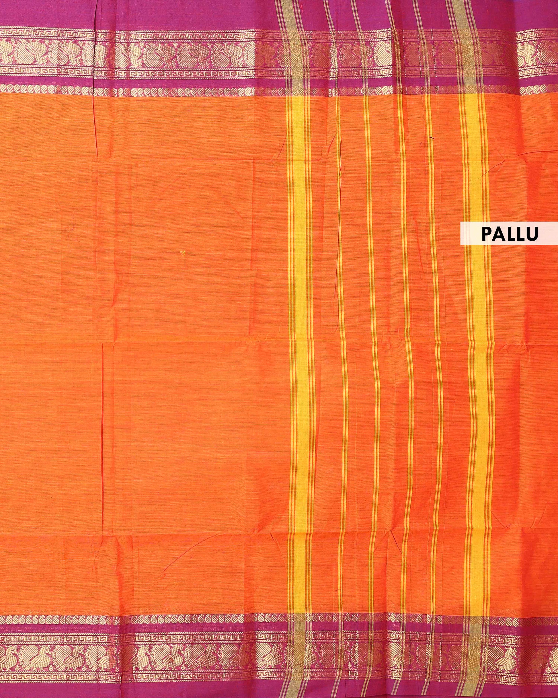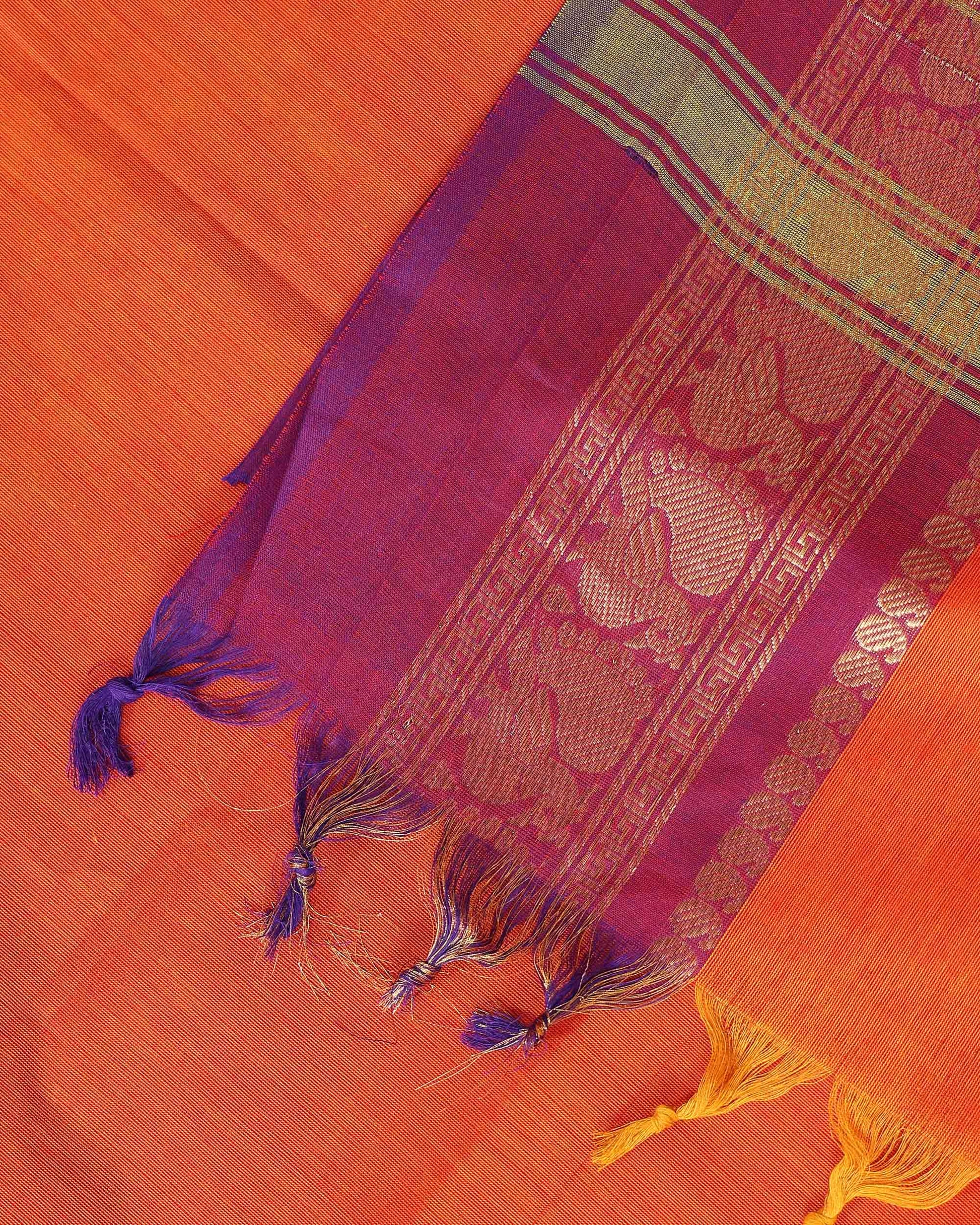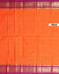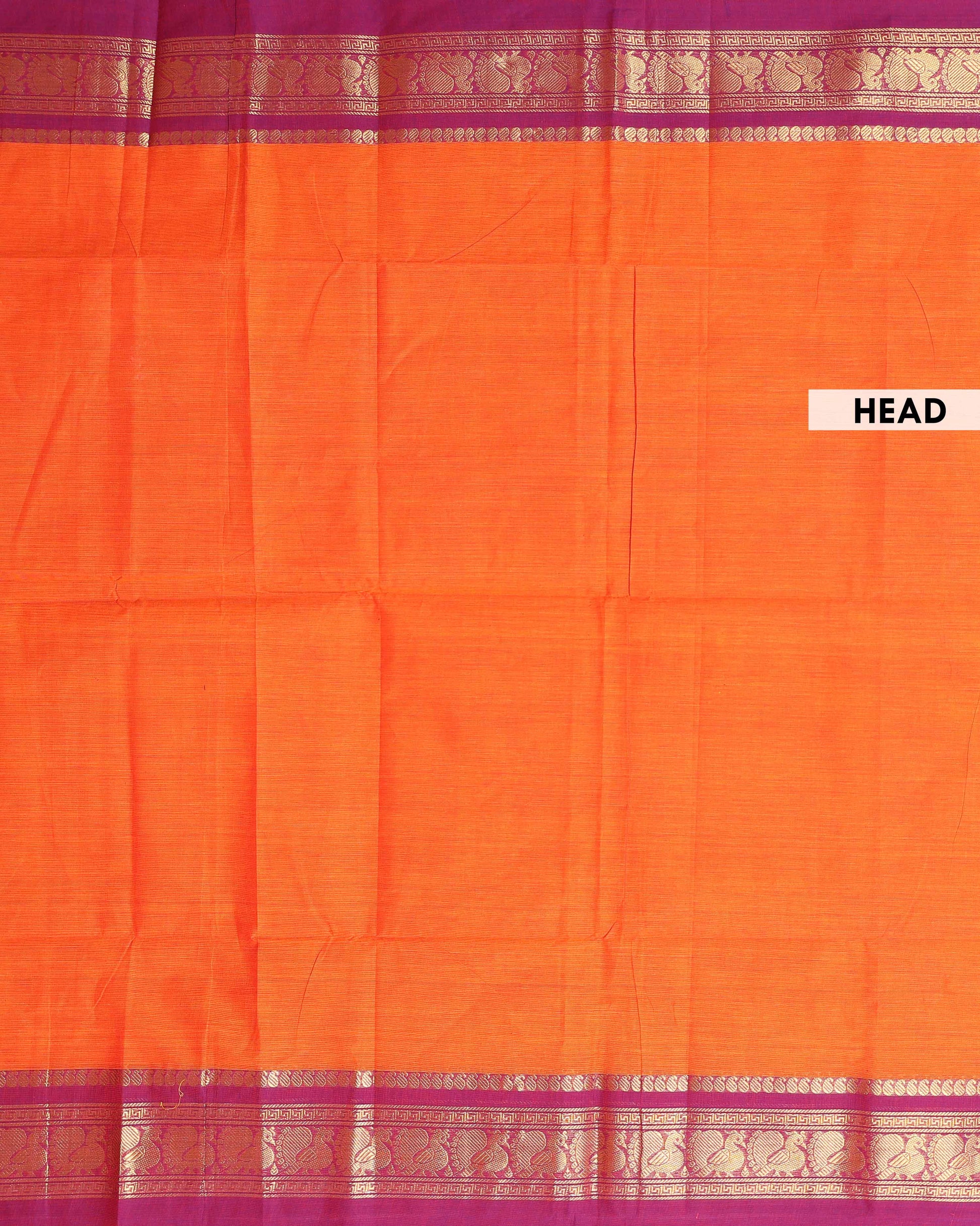 - This pure handwoven Kanchi cotton saree in vibrant orange a striking purple and gold zari border with traditional motifs, perfect for everyday elegance or festive