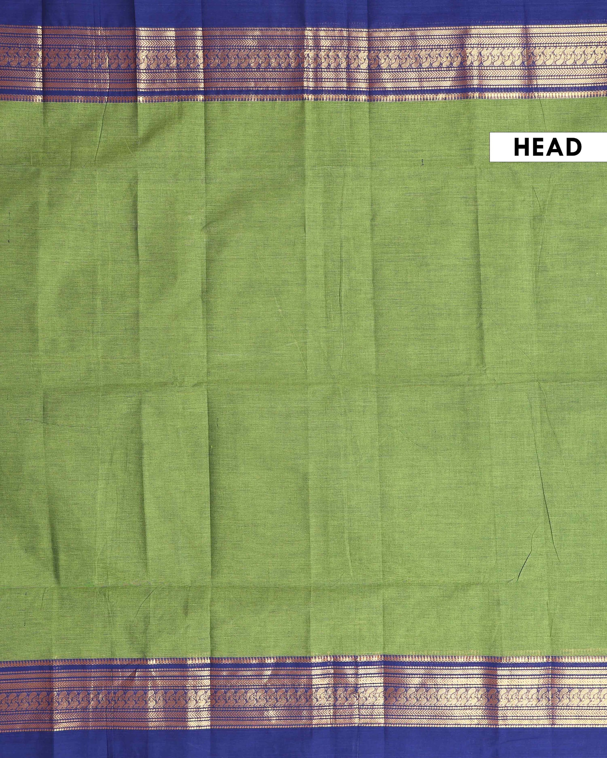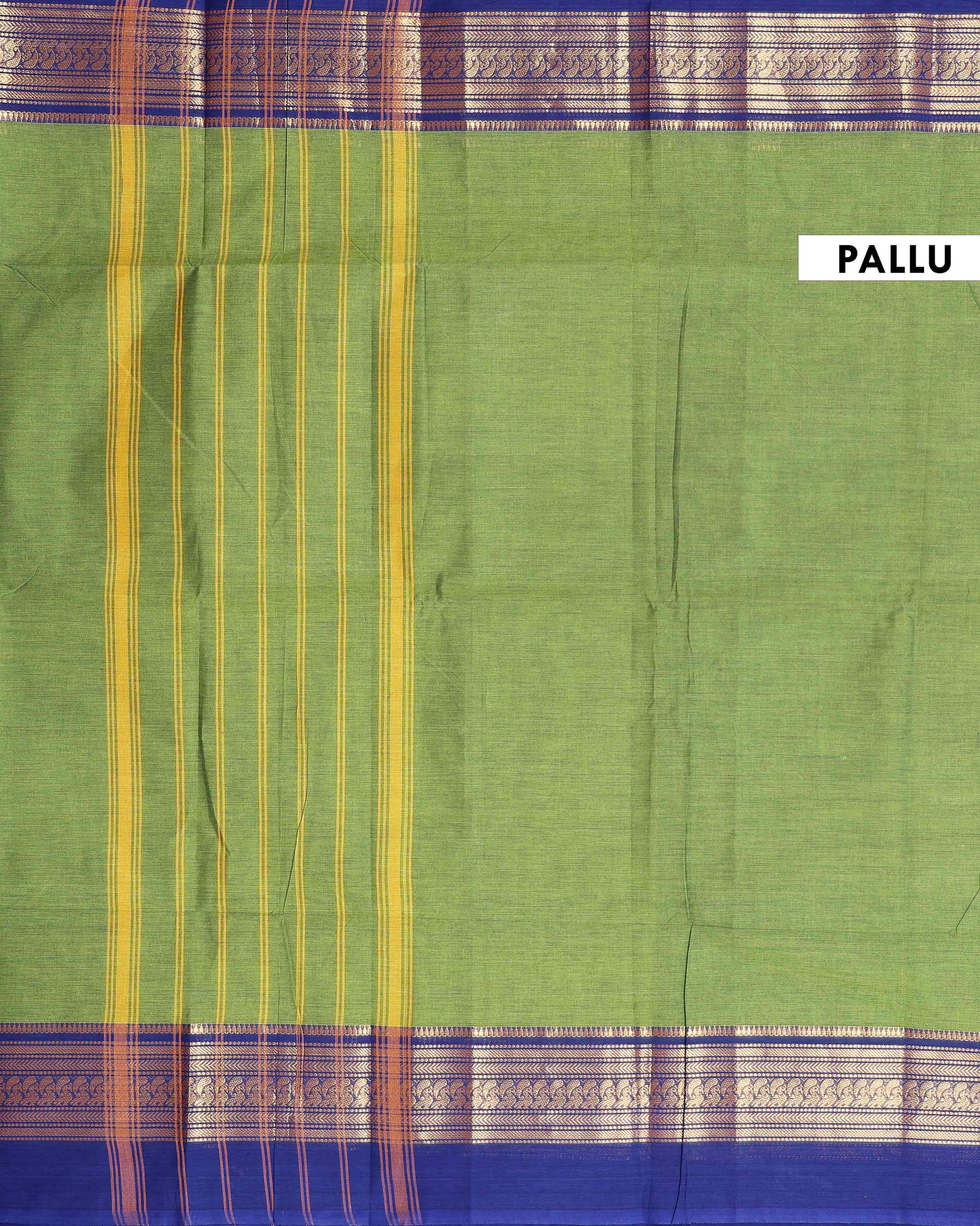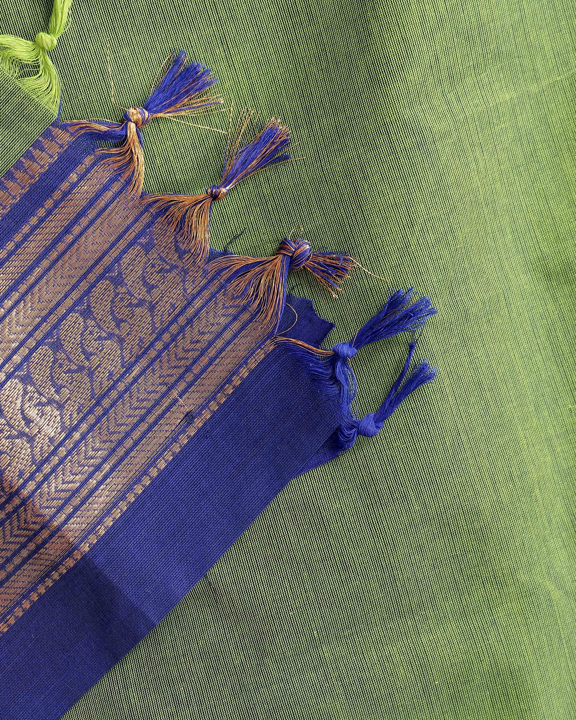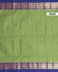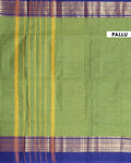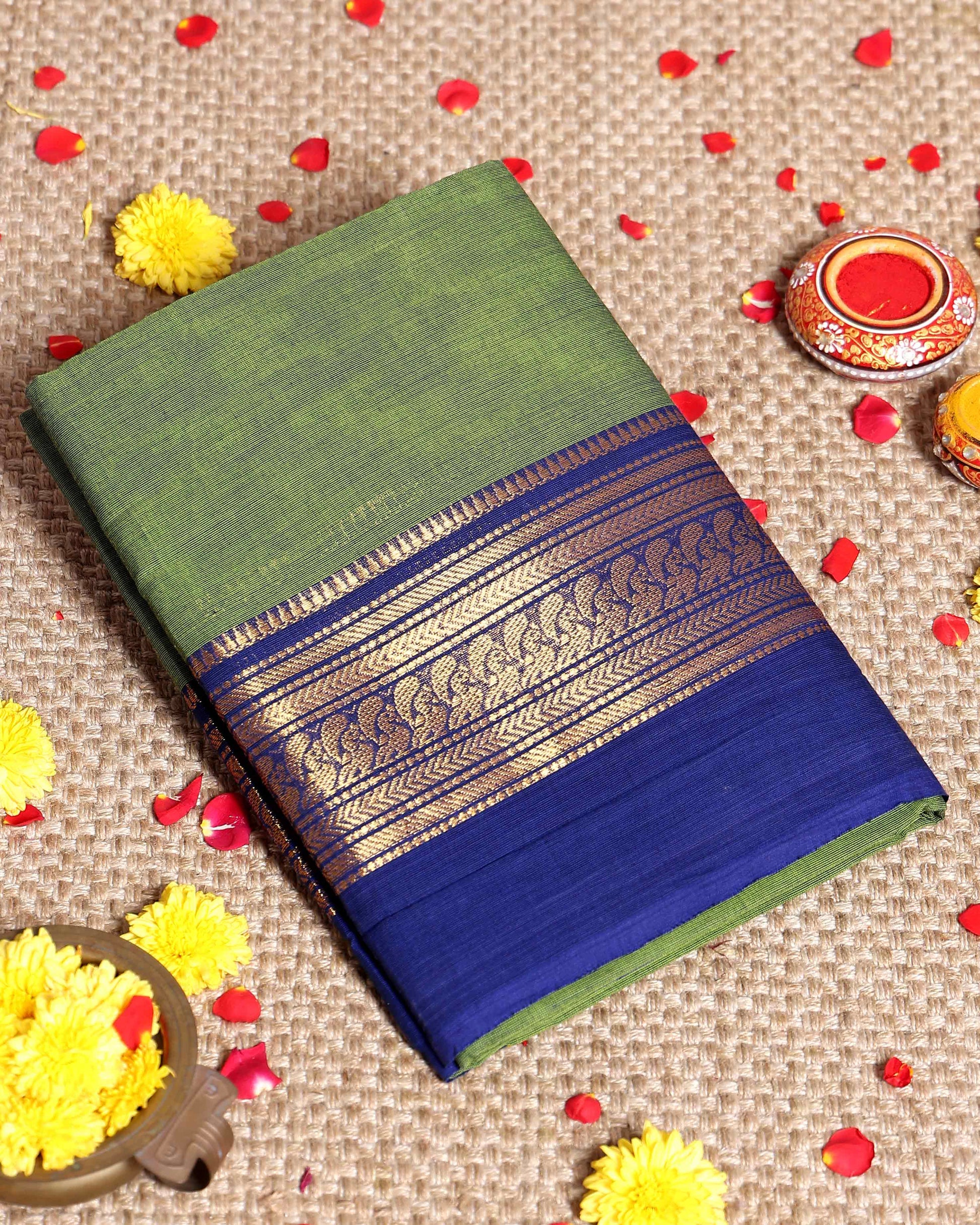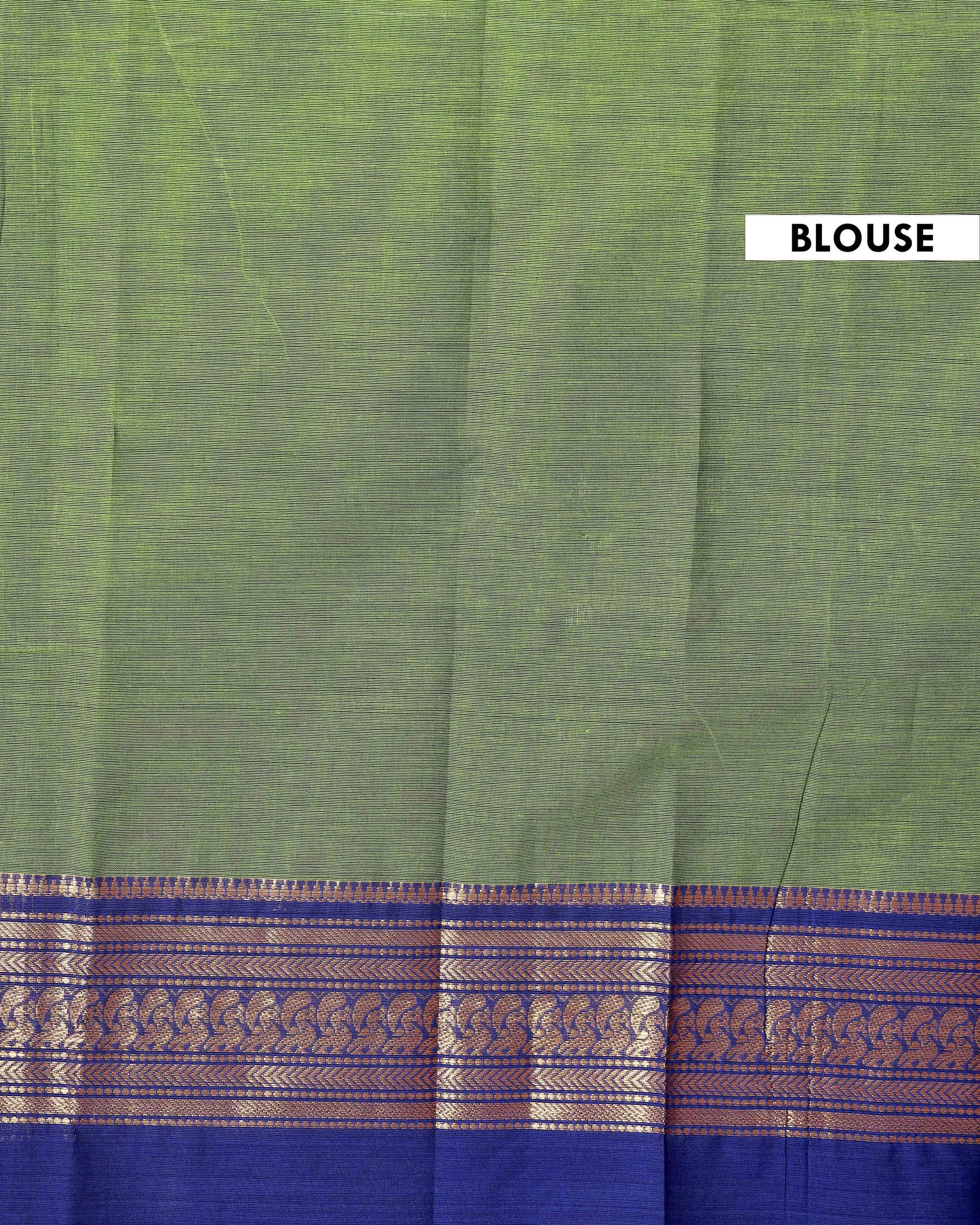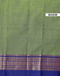 - Elegant handloom Kanchi cotton saree a light green body and a rich ink blue border with intricate golden zari work.