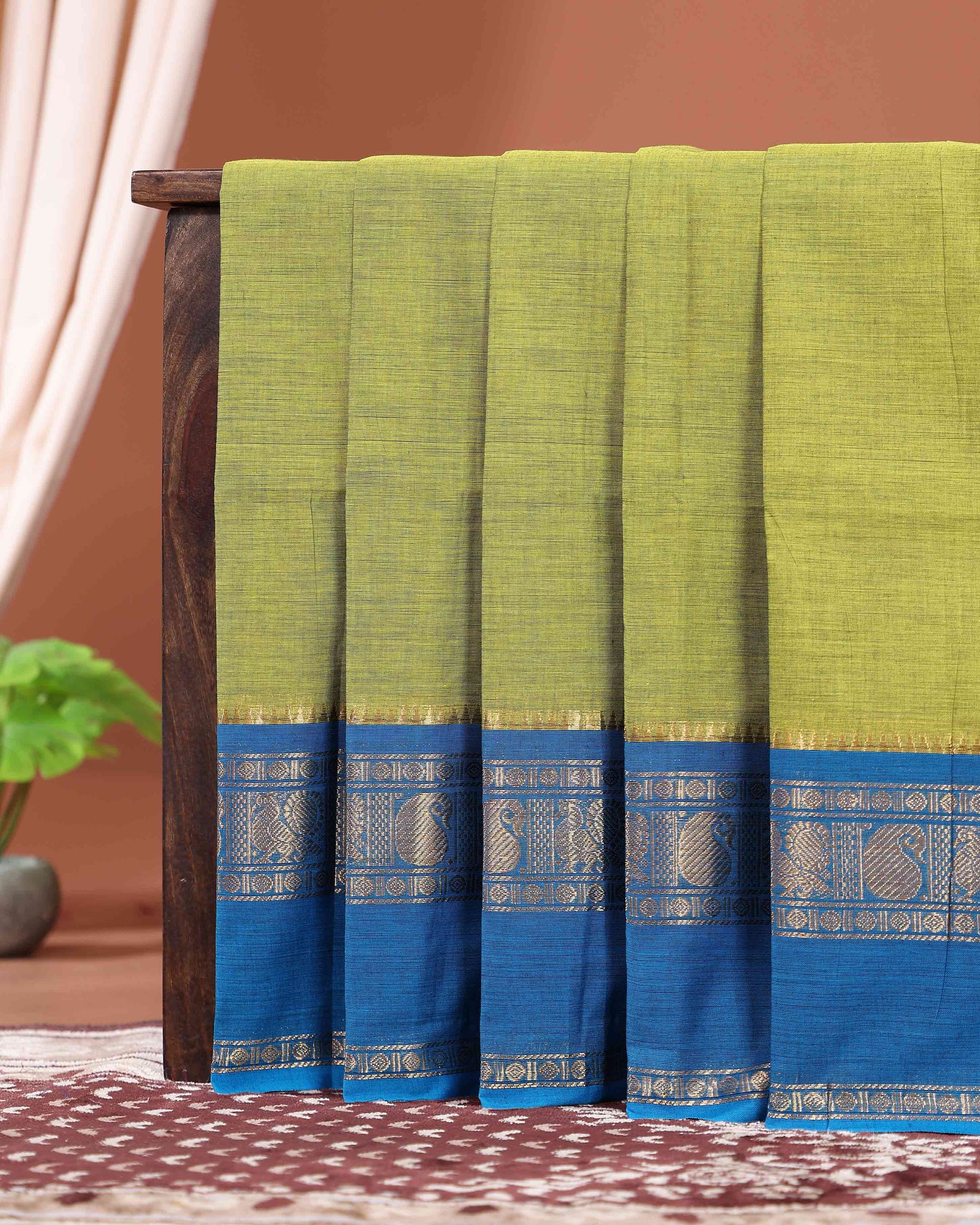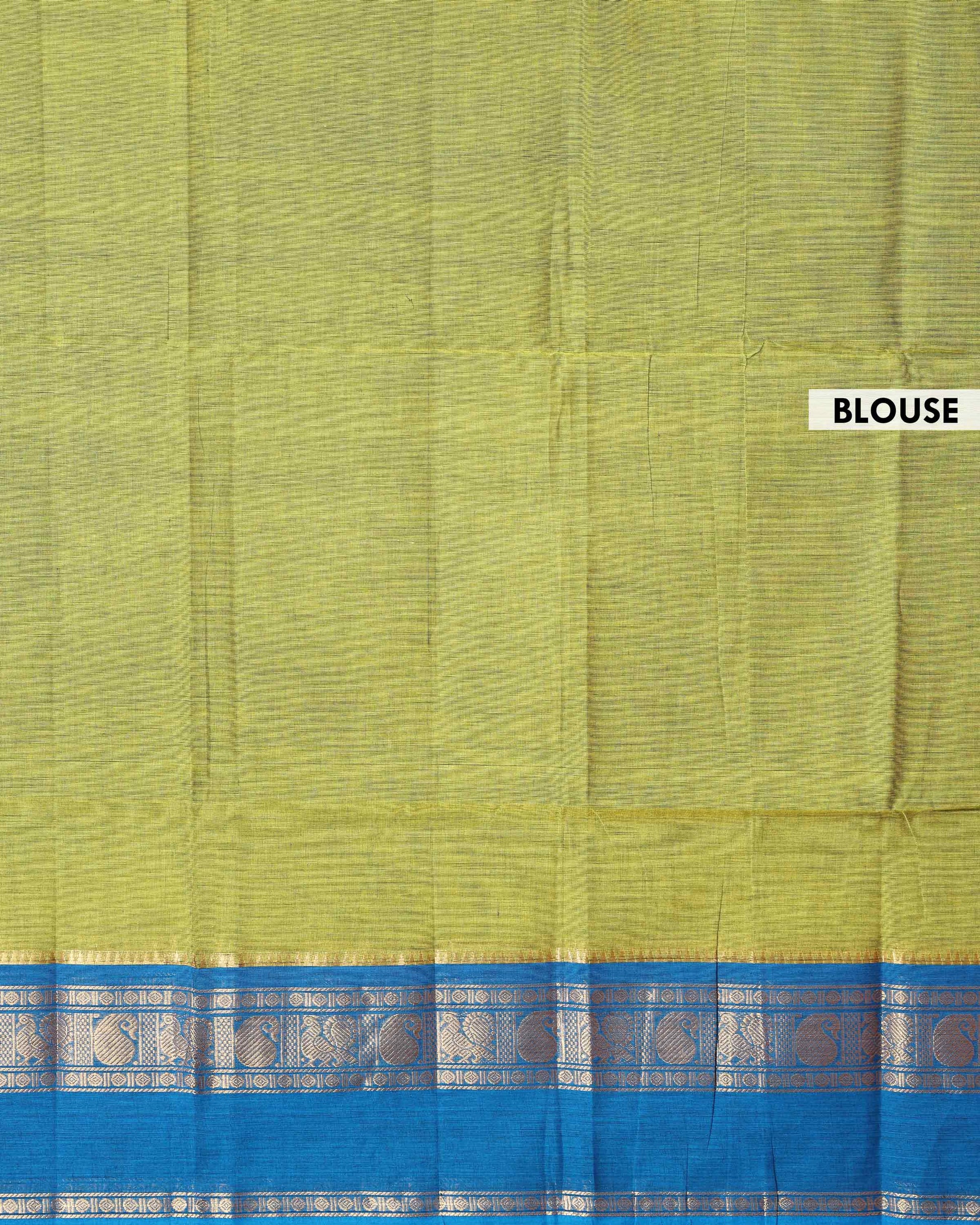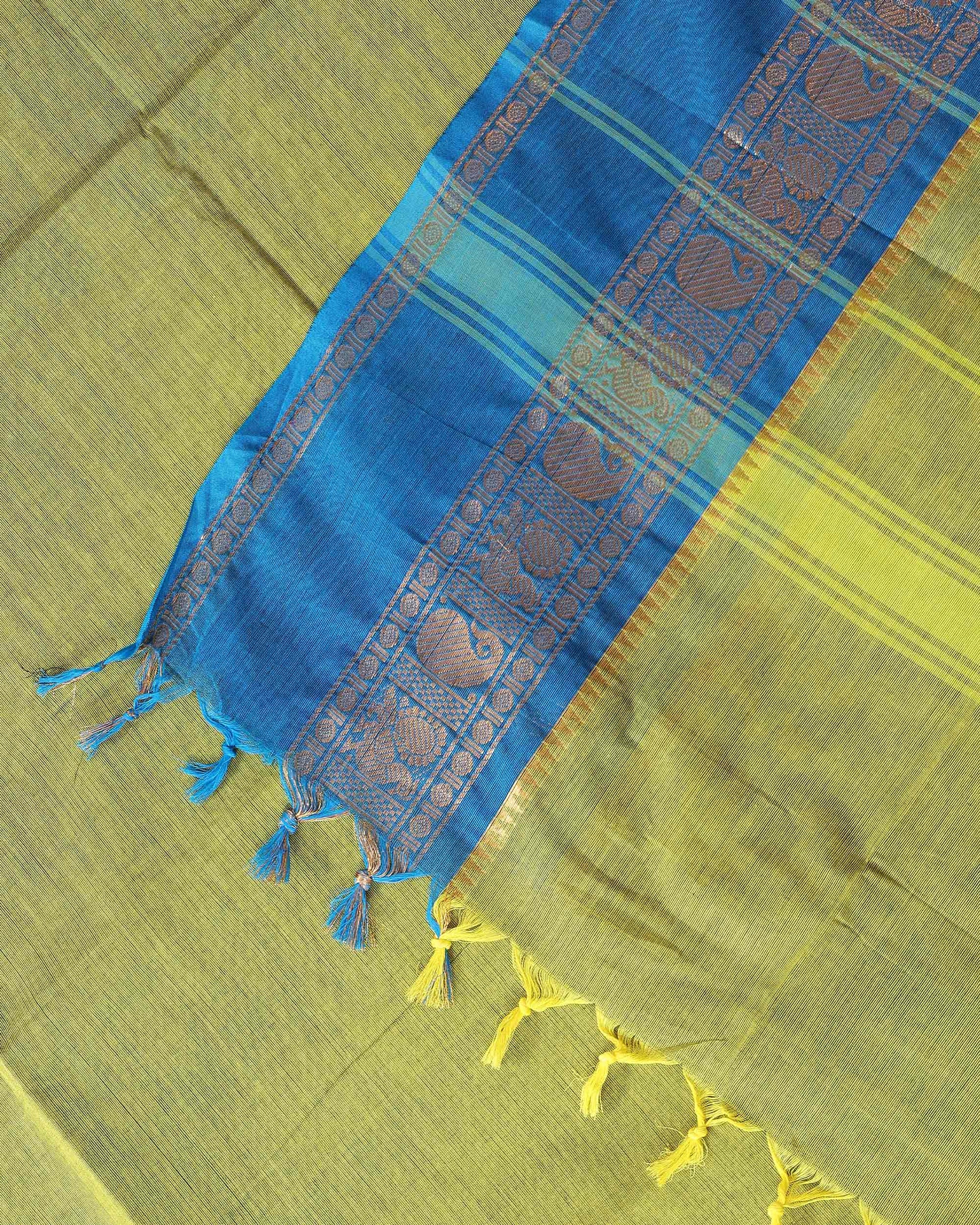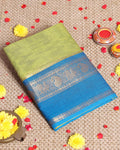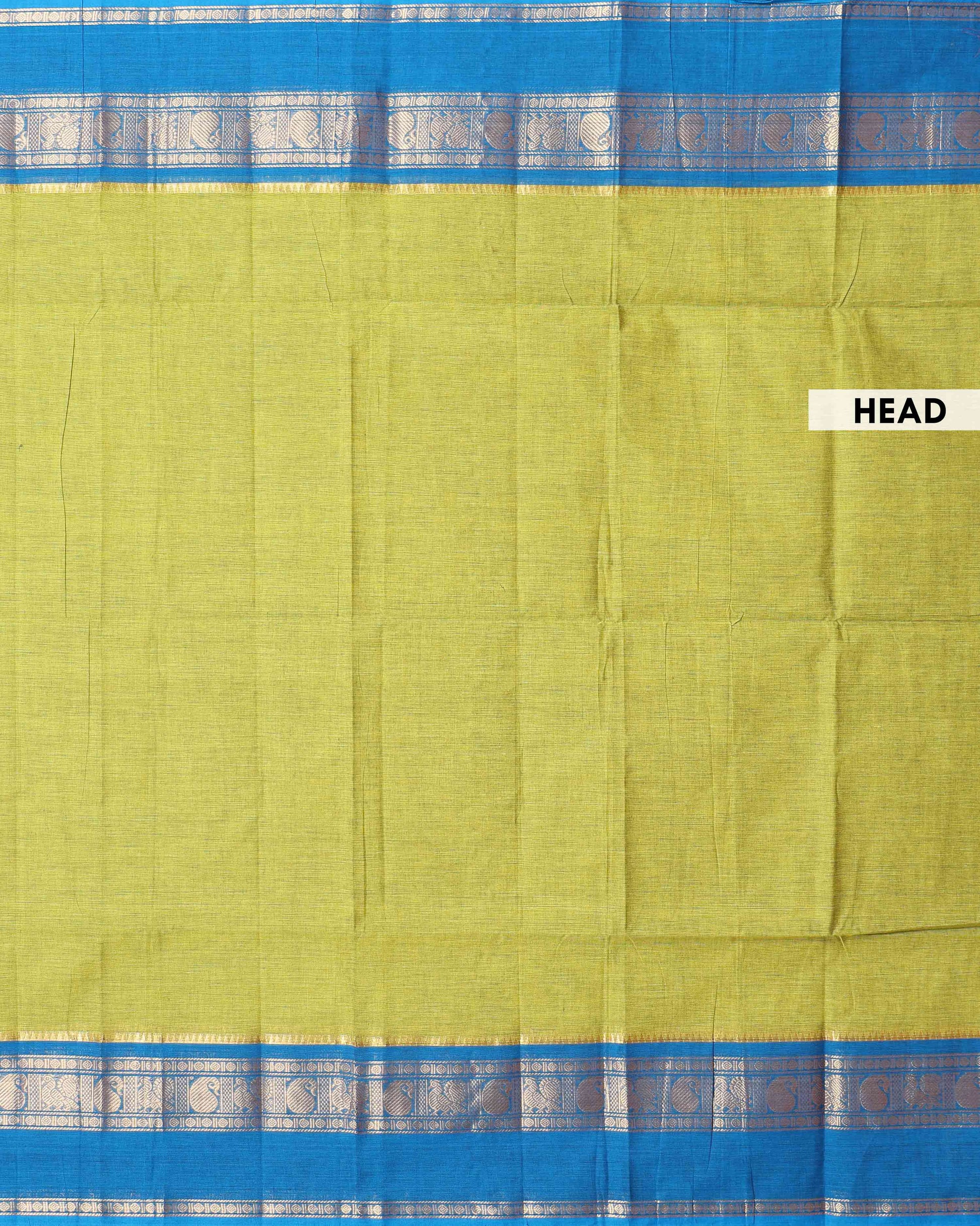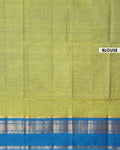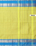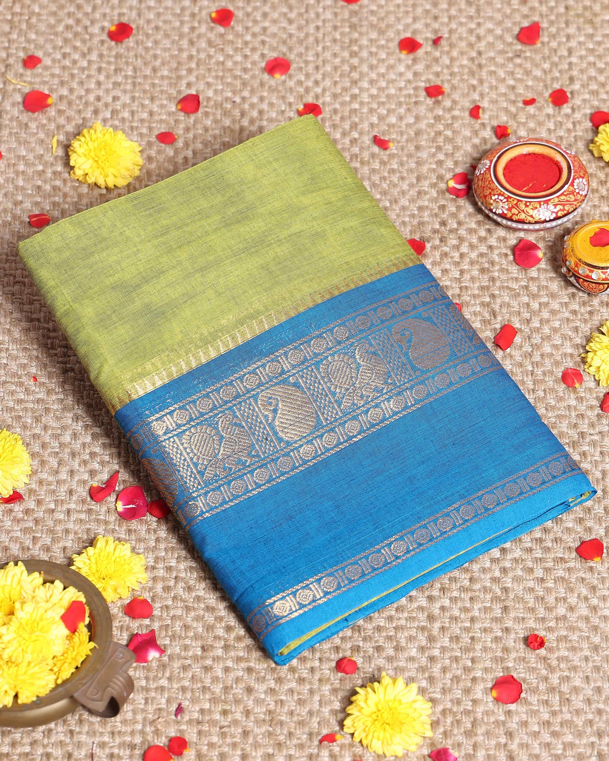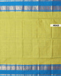 - Drape yourself in the comfort and elegance of this handwoven Kanchi cotton saree with a vibrant lime green body.