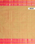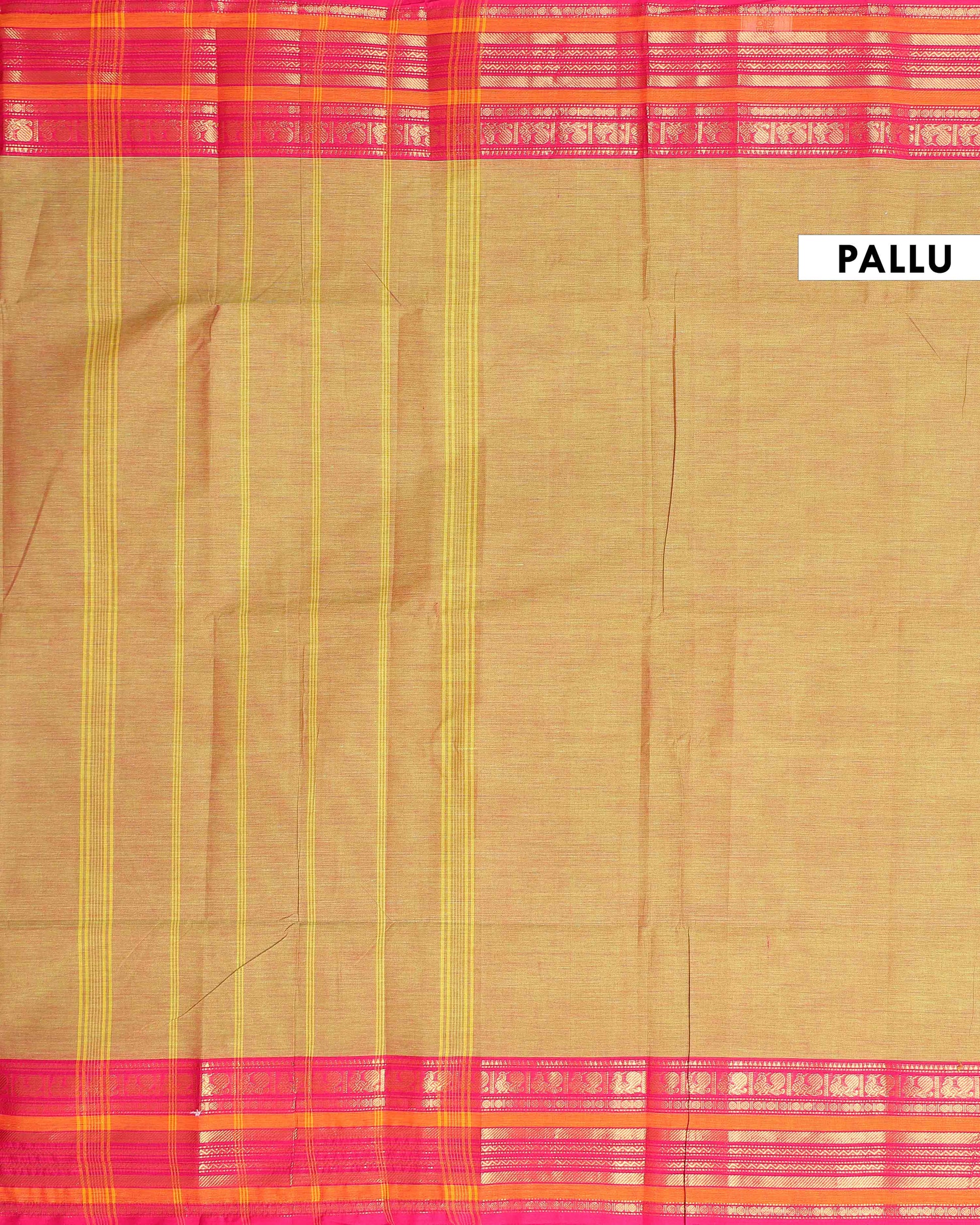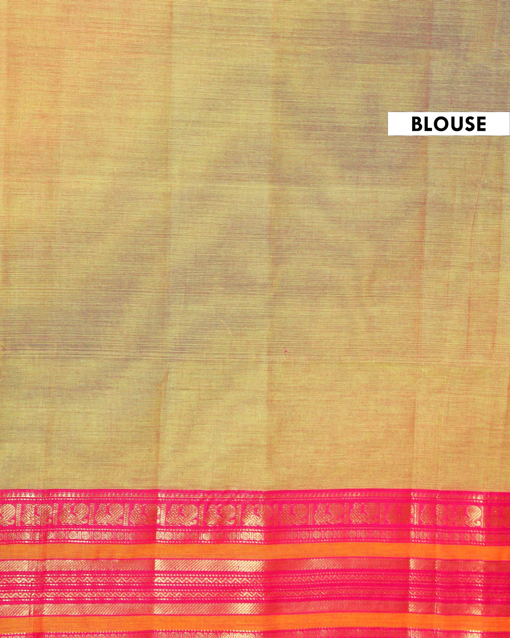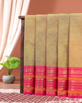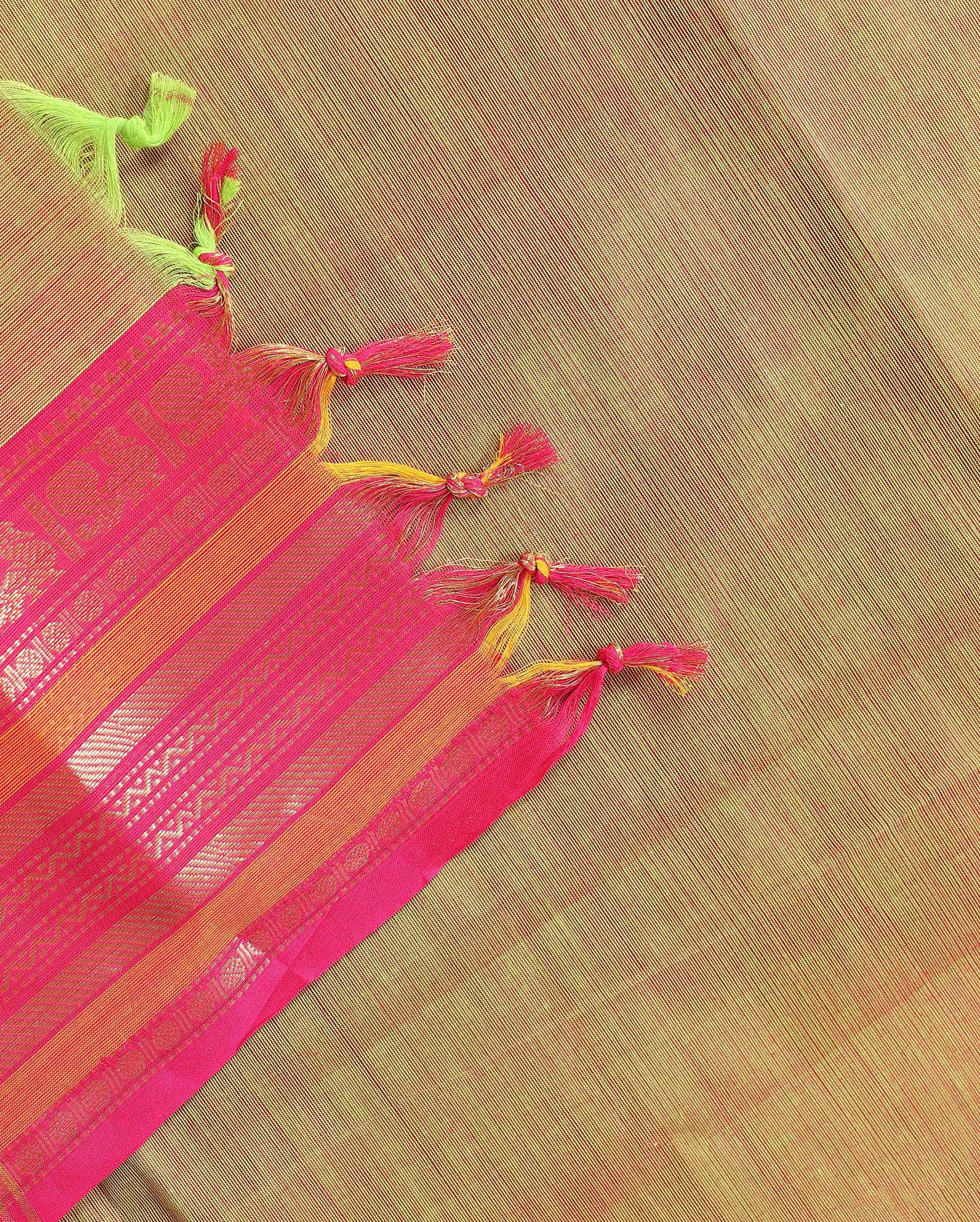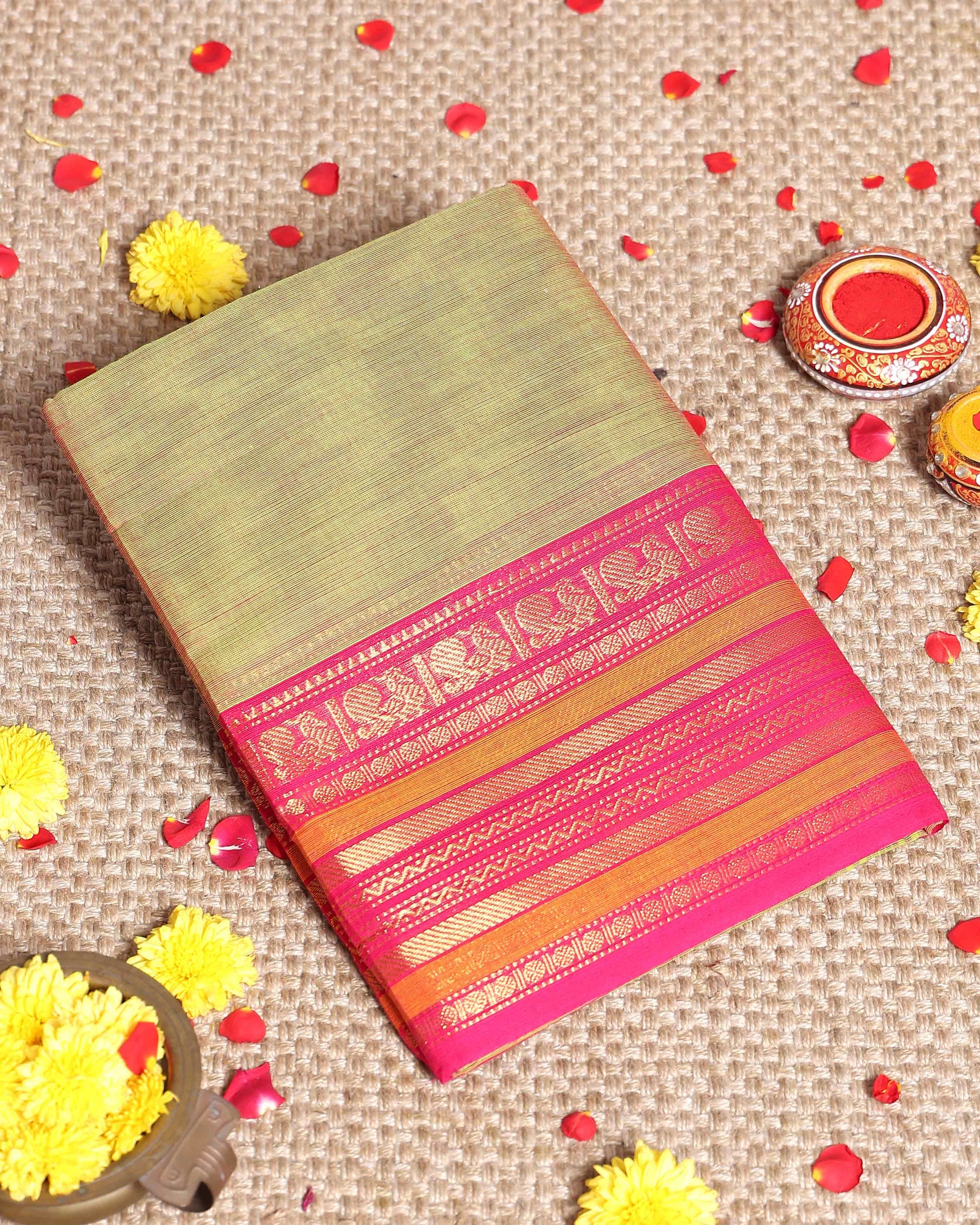 - This elegant handloom Kanchi cotton saree in a subtle olive green a striking magenta pink and gold zari border