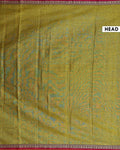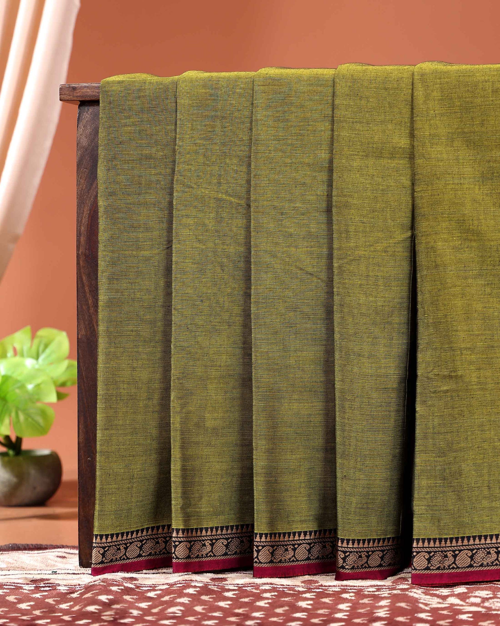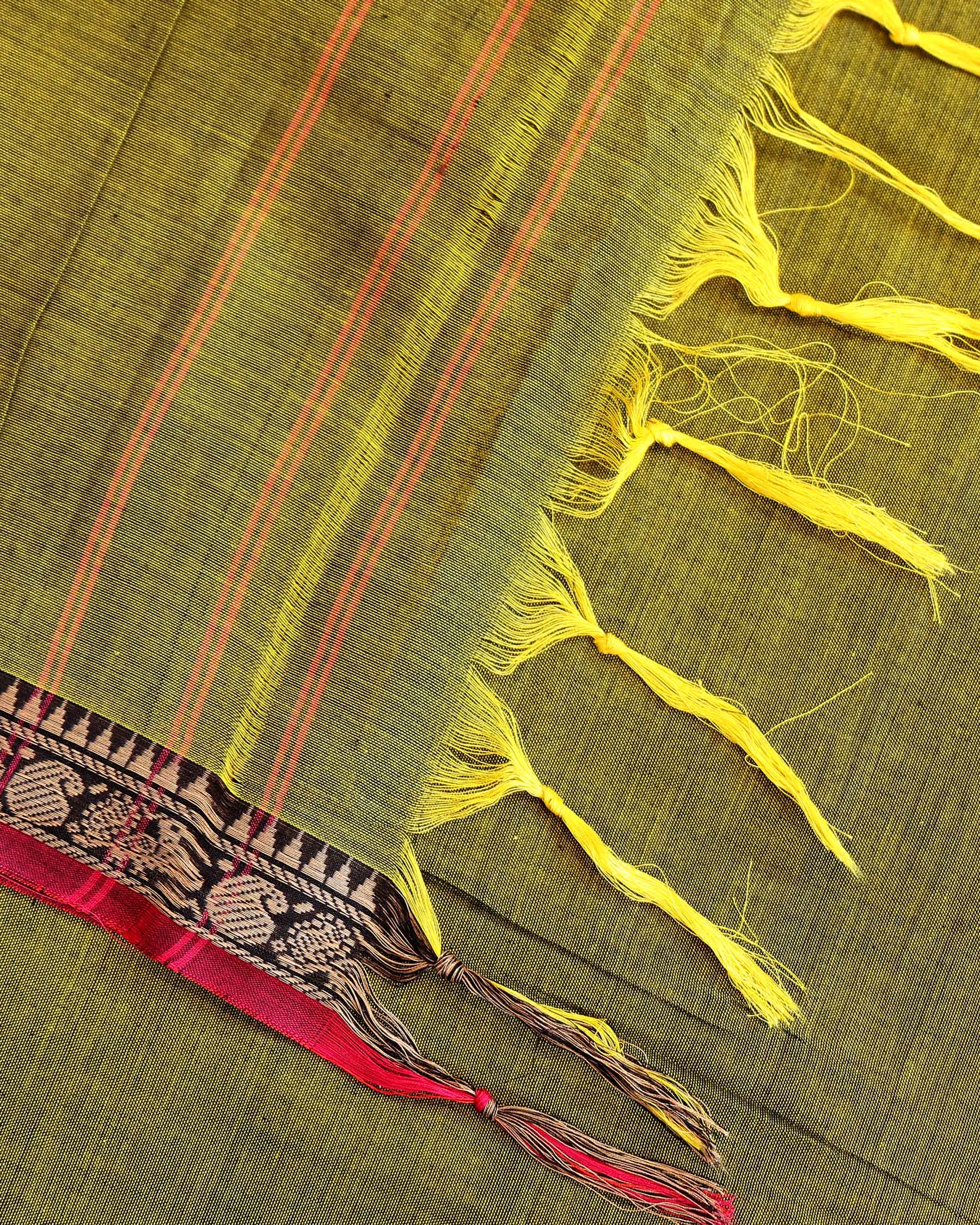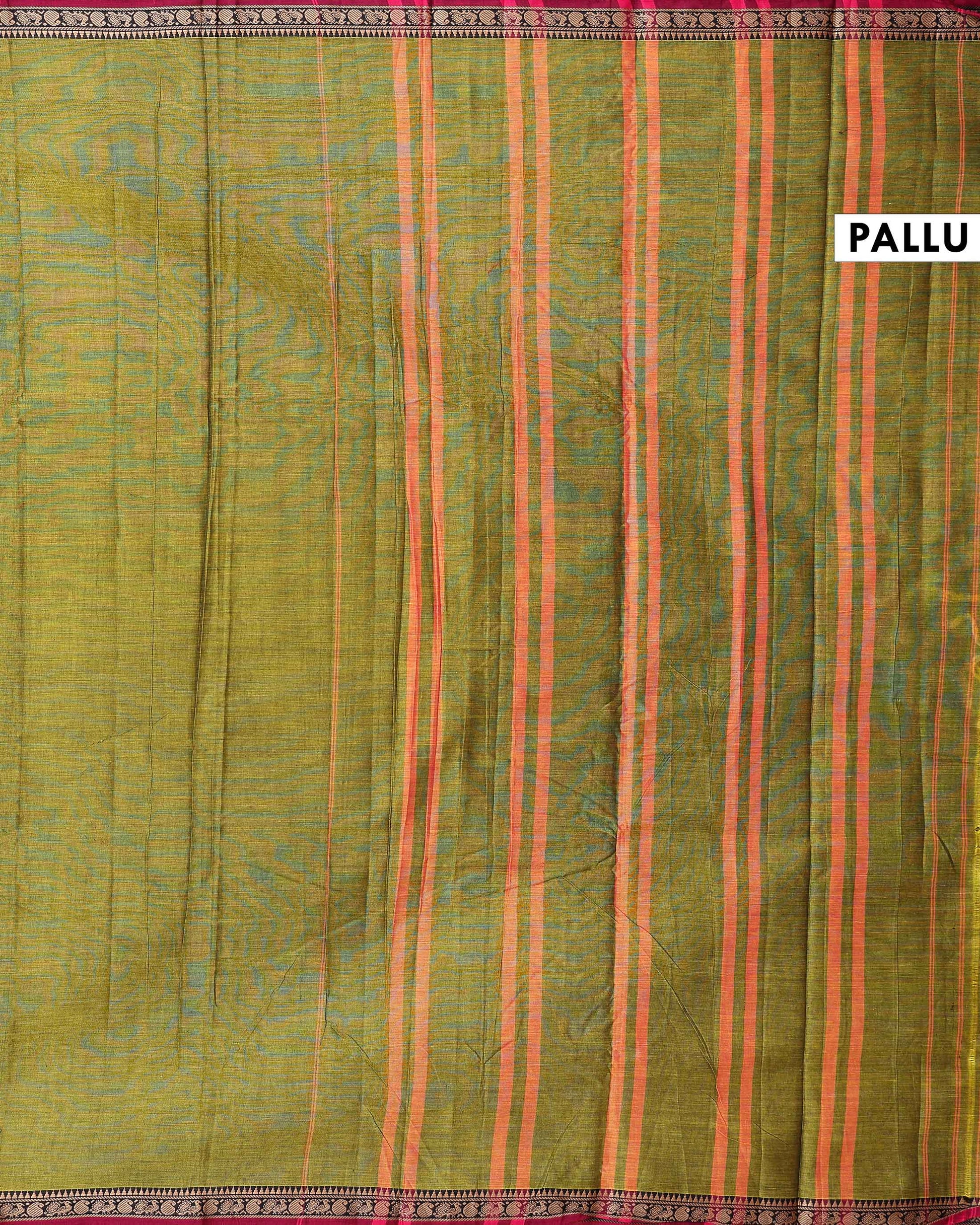 - This handloom olive green Narayanpet cotton saree a contrasting red border with intricate temple motifs.