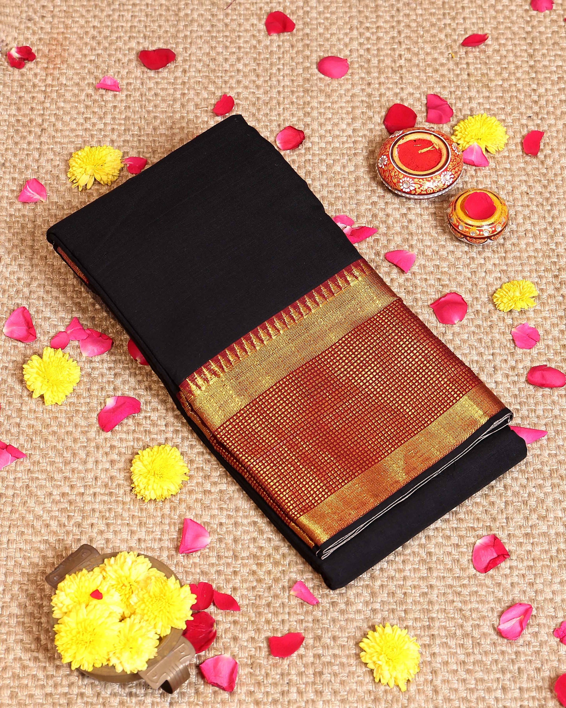 - Features a classic black body with a rich, dual-tone reddish gold zari temple border blending tradition with elegant charm