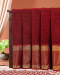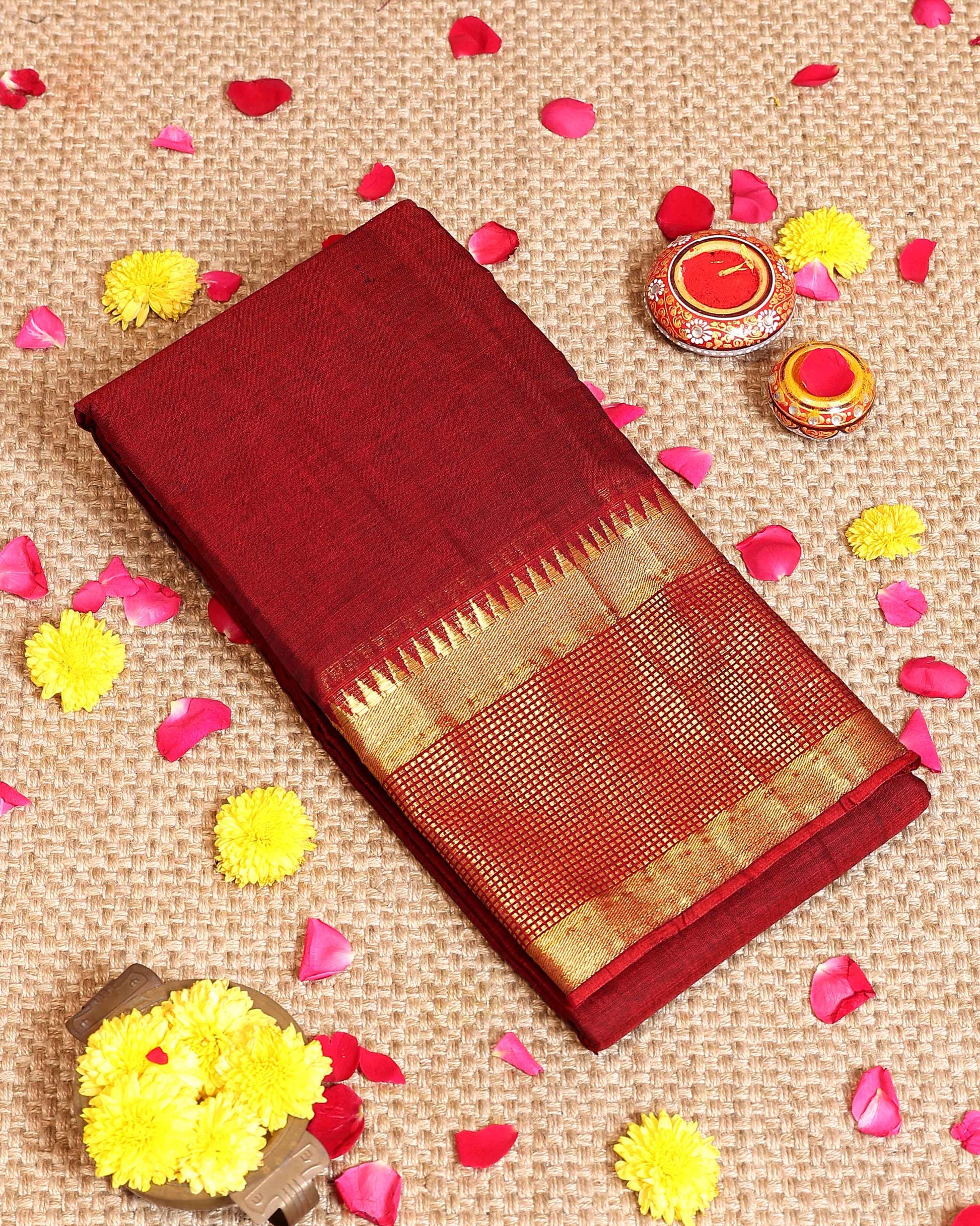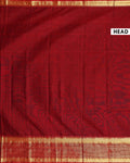 Draped in deep Red this handwoven saree a rich traditional design with a striking gold zari border and temple motifs.
