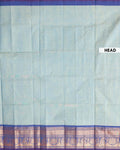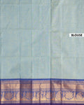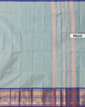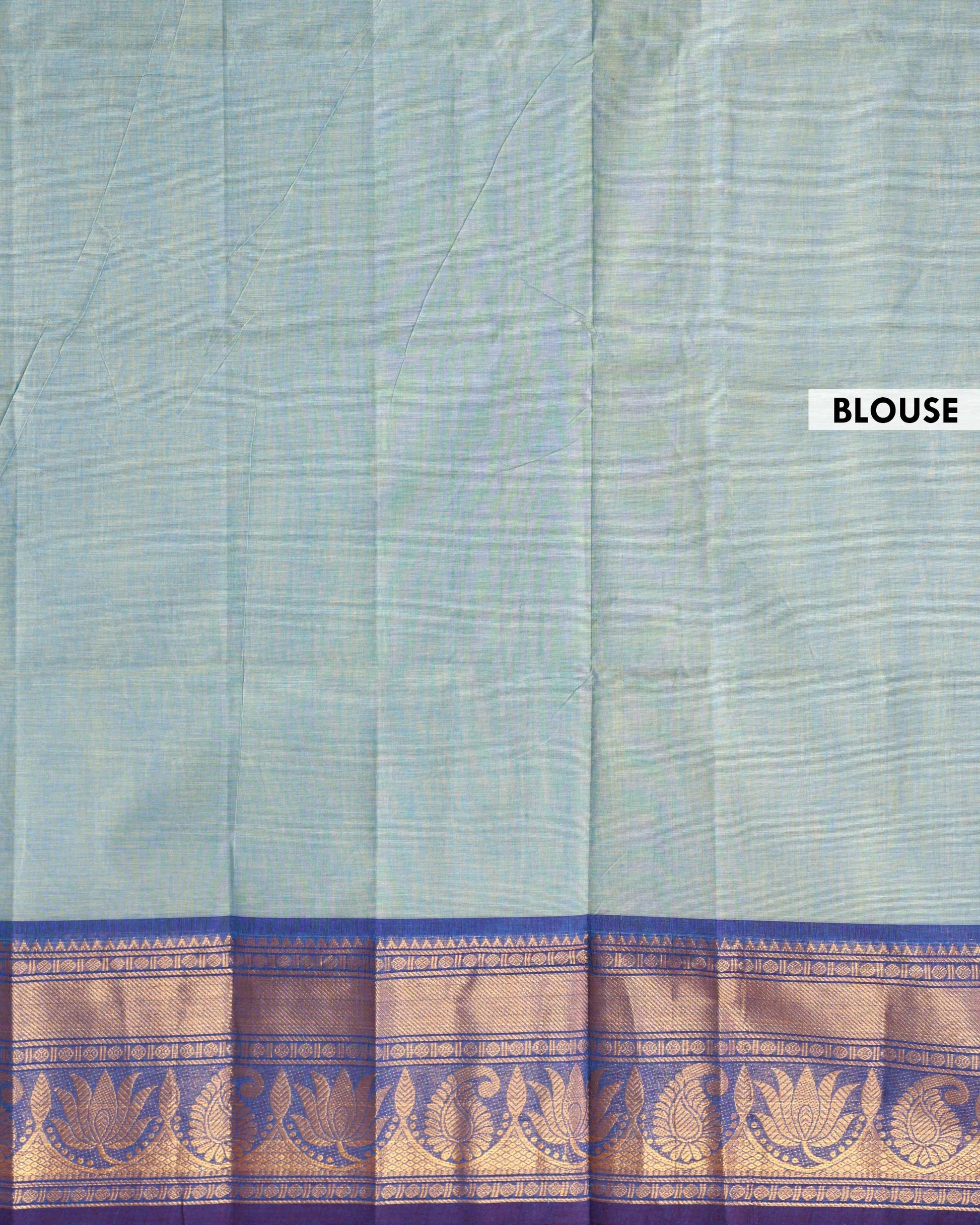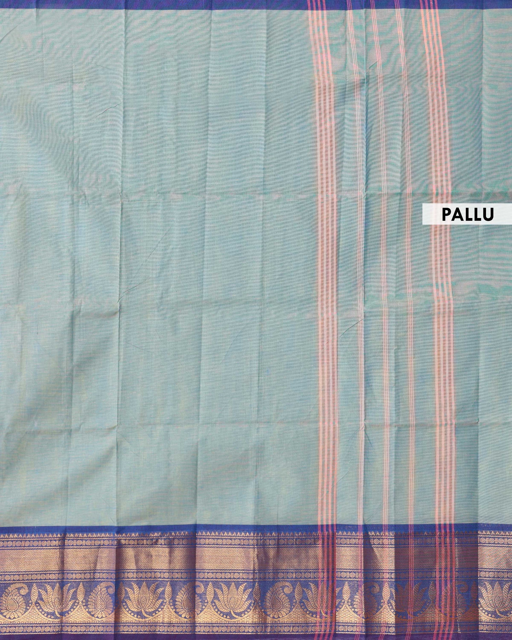 - This elegant handwoven Venkatagiri cotton saree in a subtle Light Green a striking royal blue and gold zari border with traditional motifs