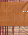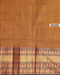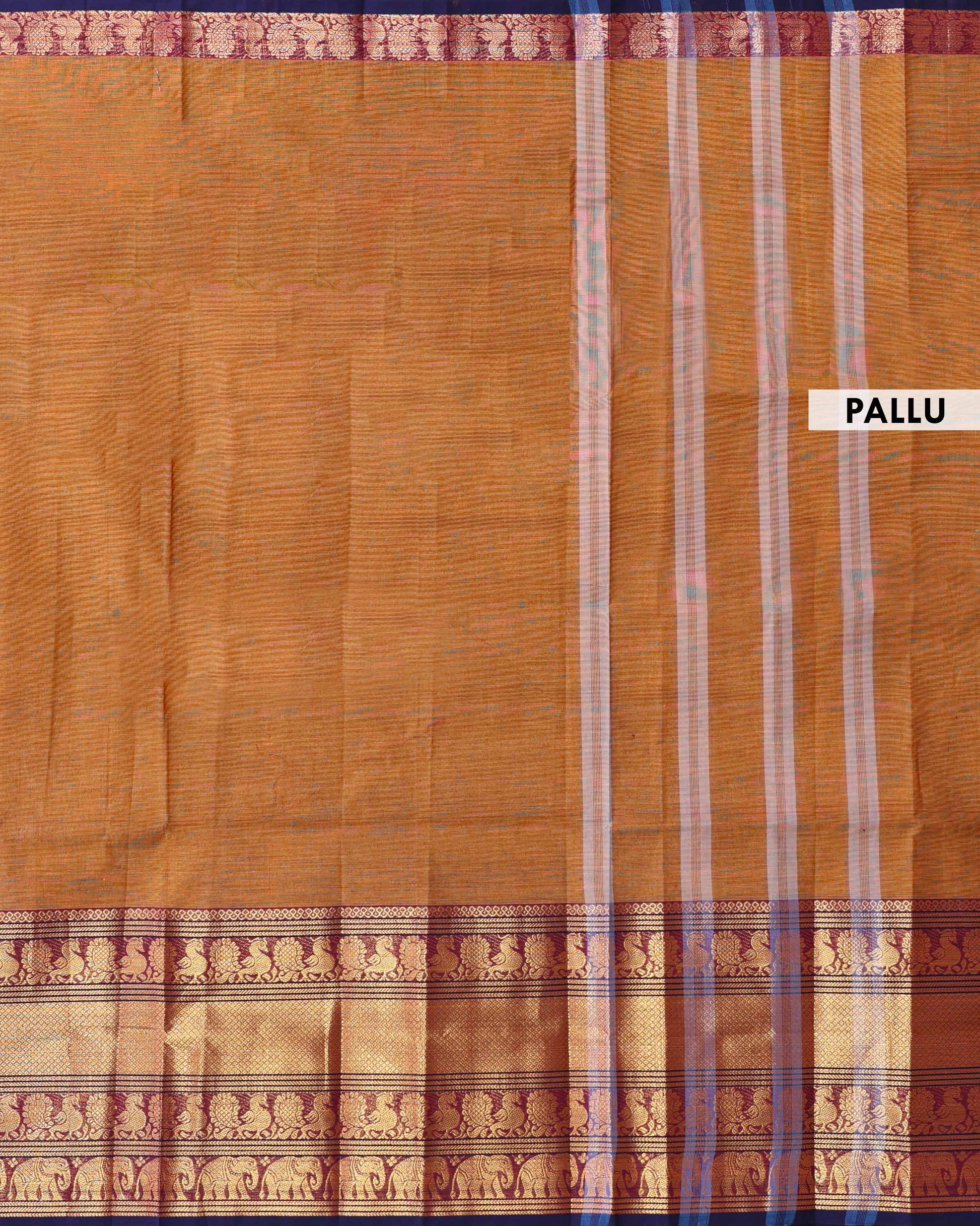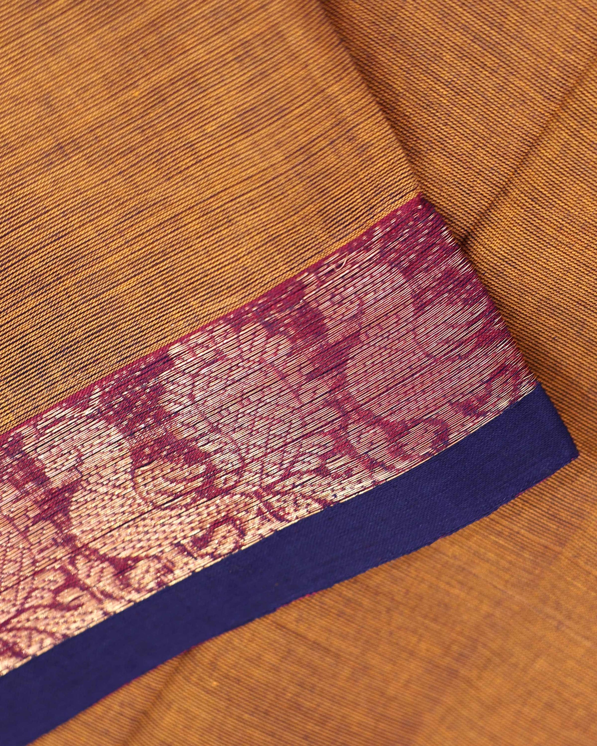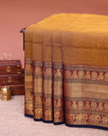 - Step into timeless tradition with this exquisite mustard yellow Venkatagiri cotton saree, featuring a rich maroon and gold zari border adorned with intricate elephant and bird motifs.