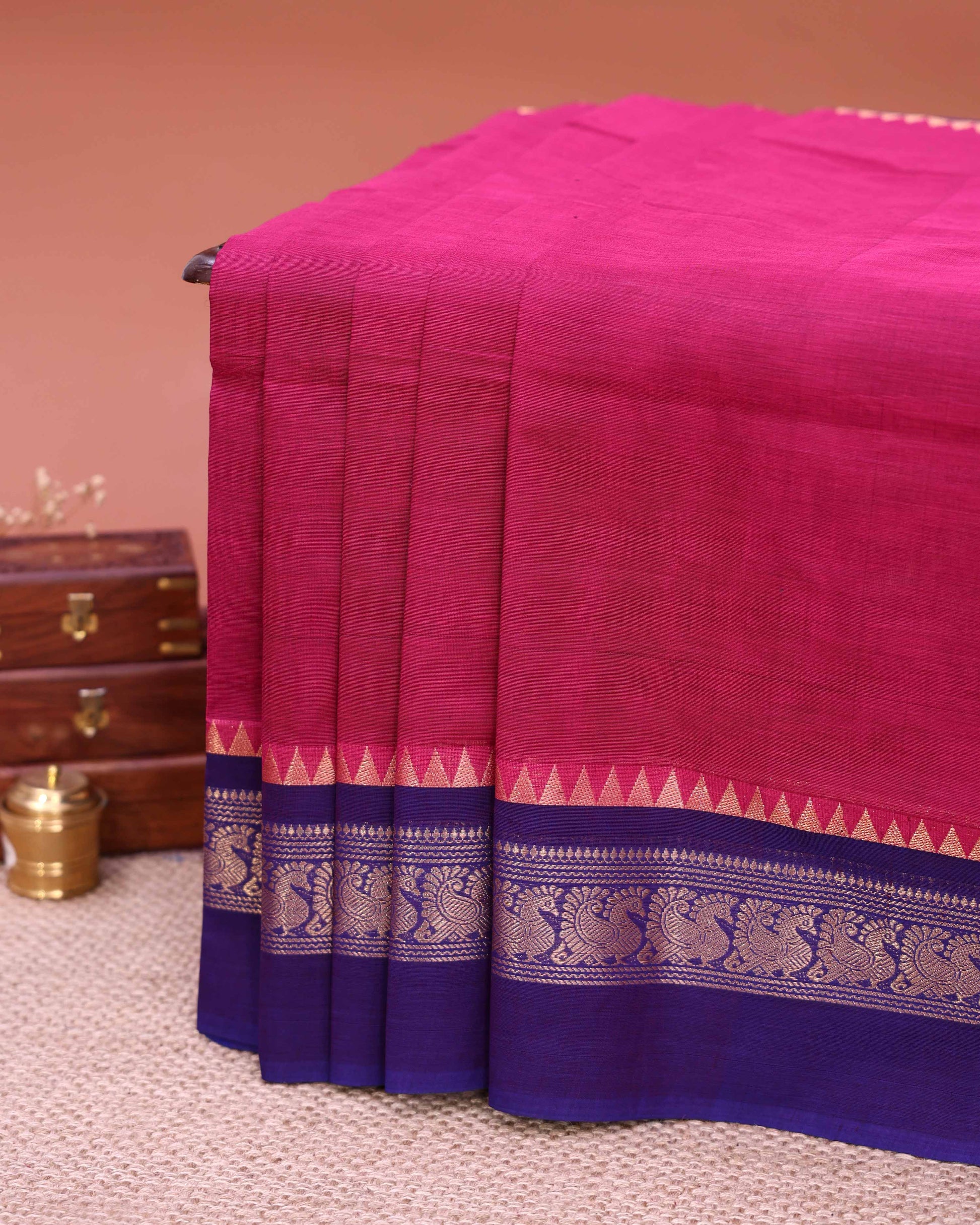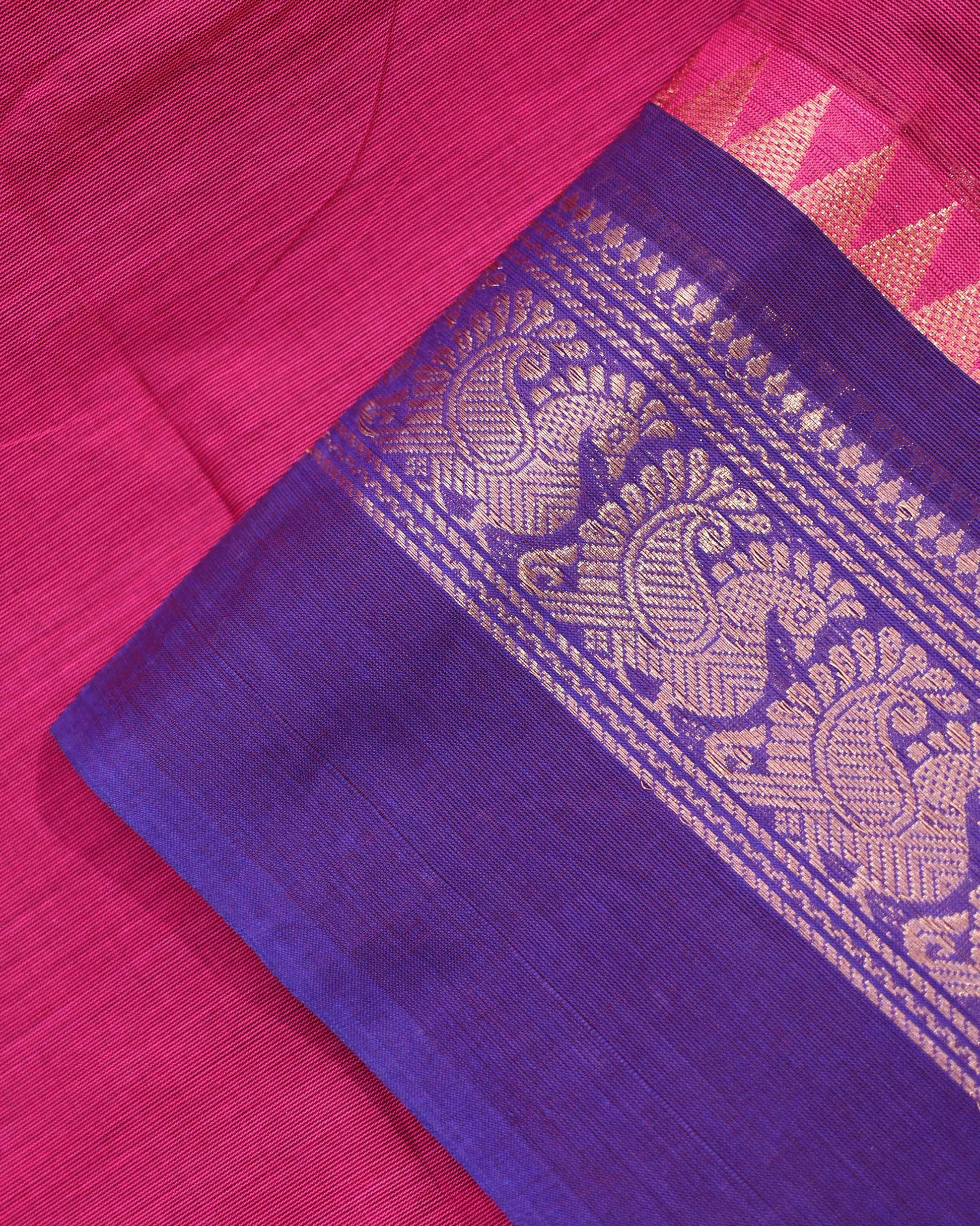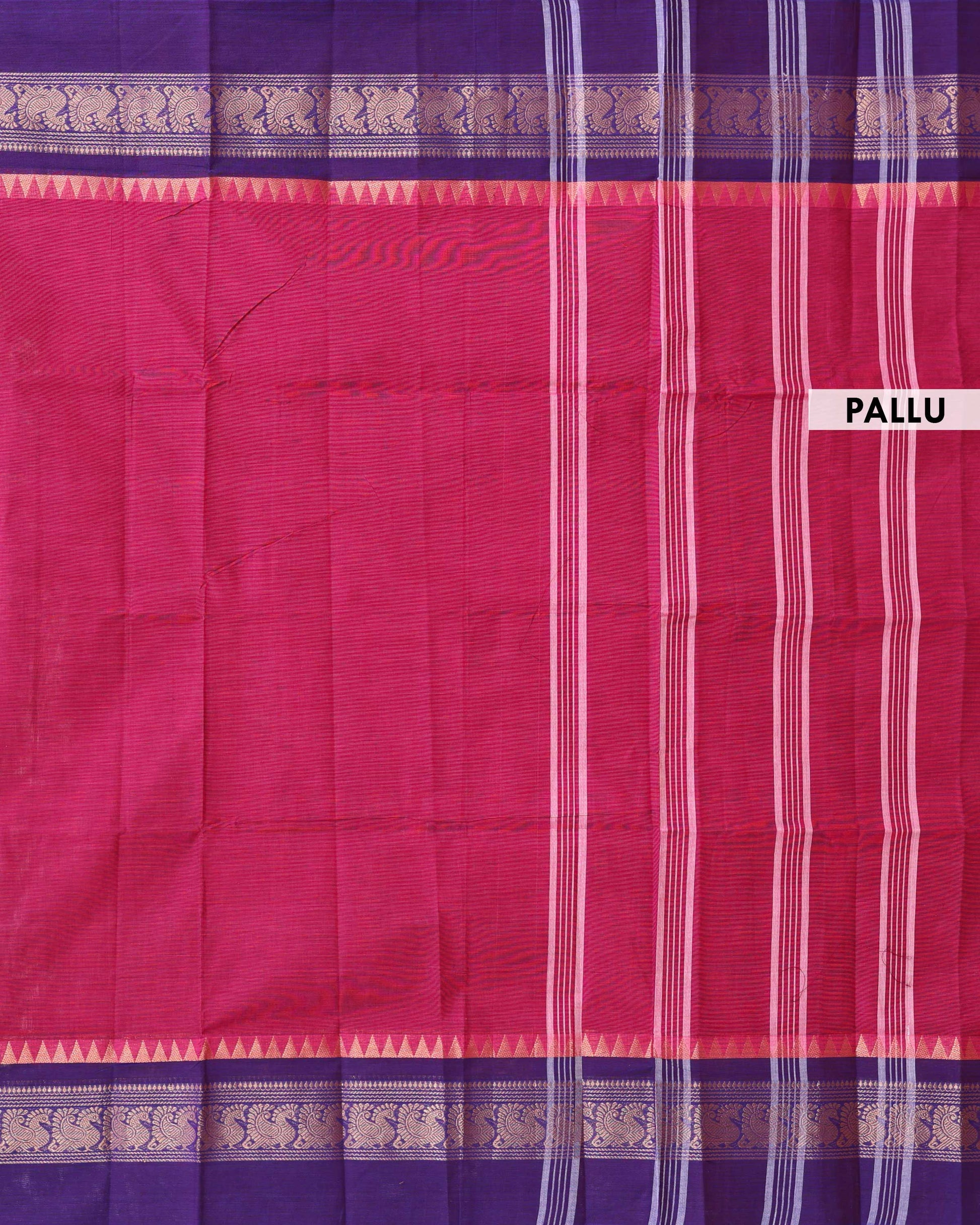 - This stunning magenta venkatagiri cotton saree a contrasting purple border with intricate gold zari work