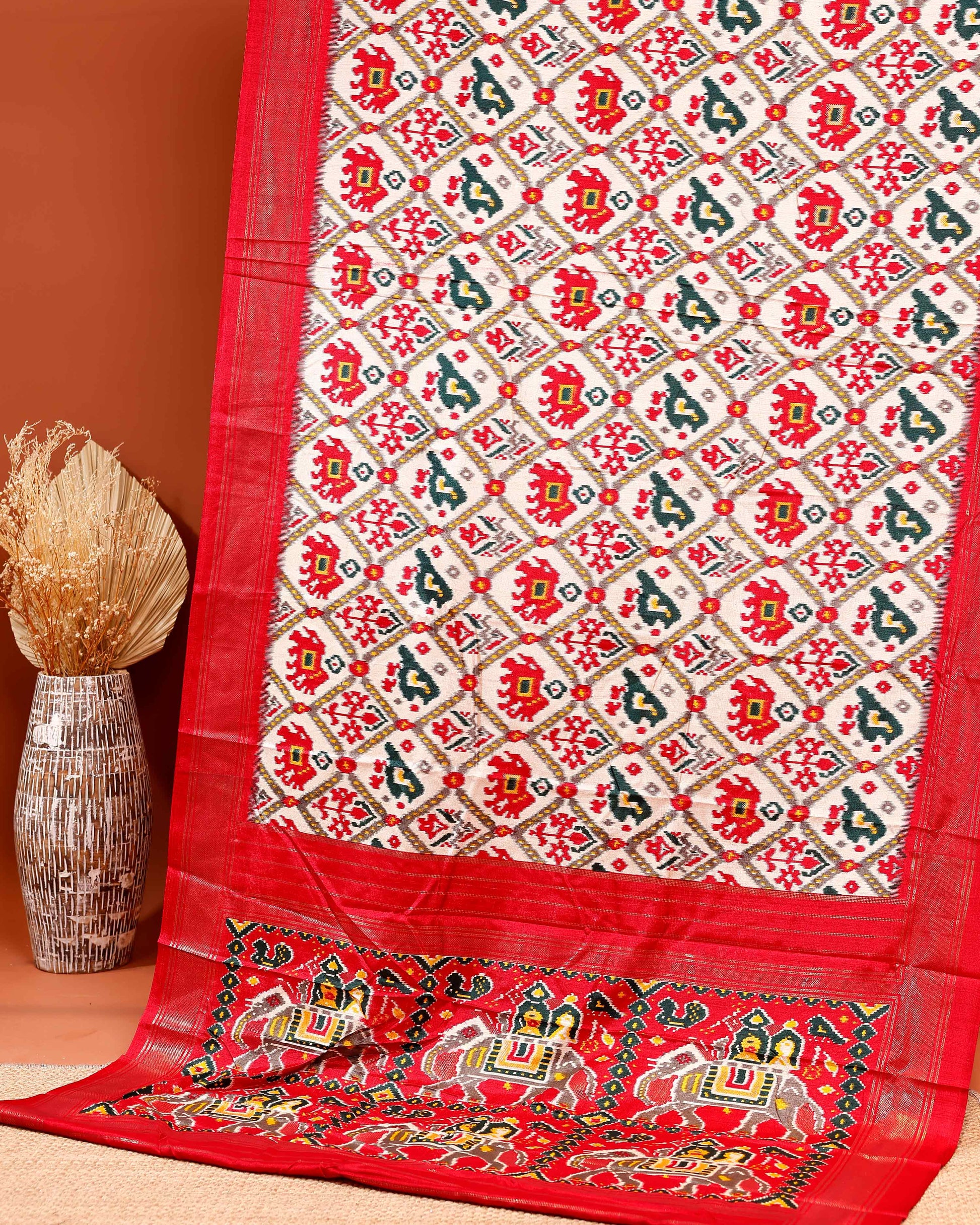 Traditional Handwoven Ikkat Saree with Geometric Patterns and Elephant Motif Pallu - Red