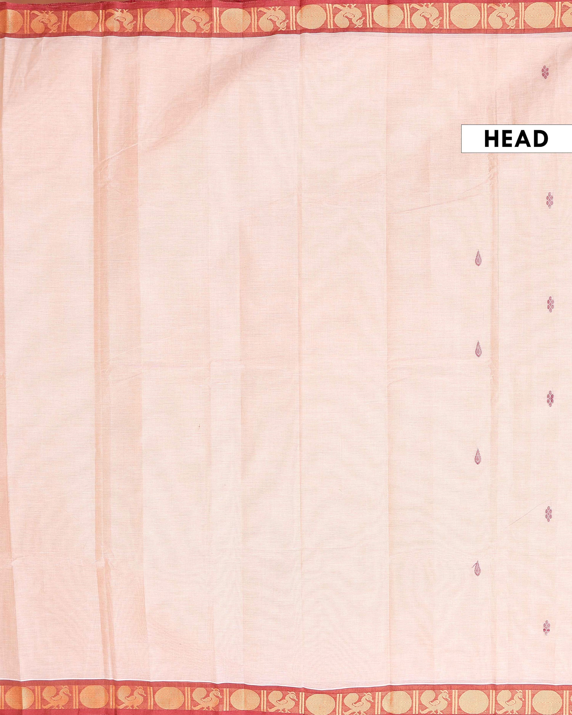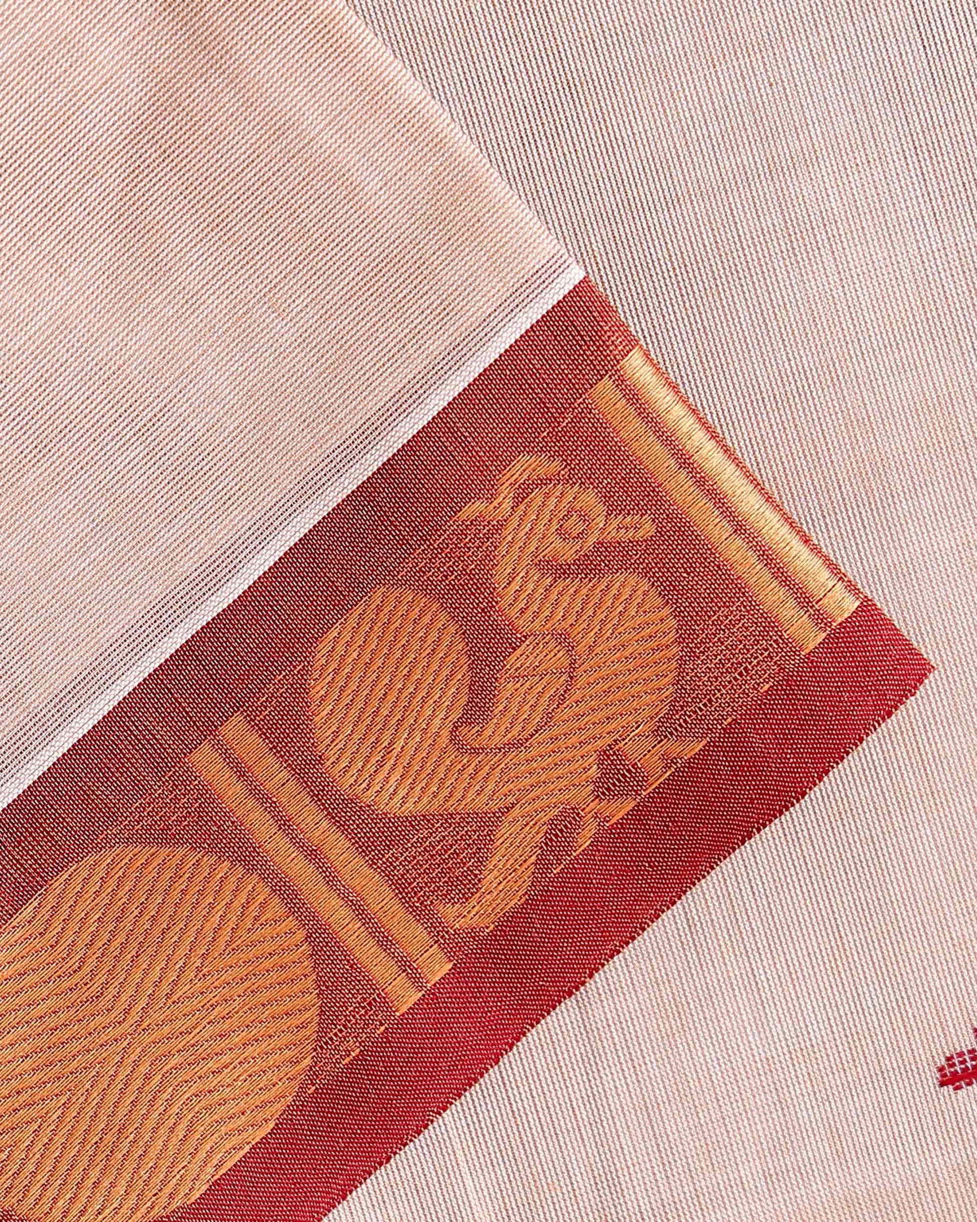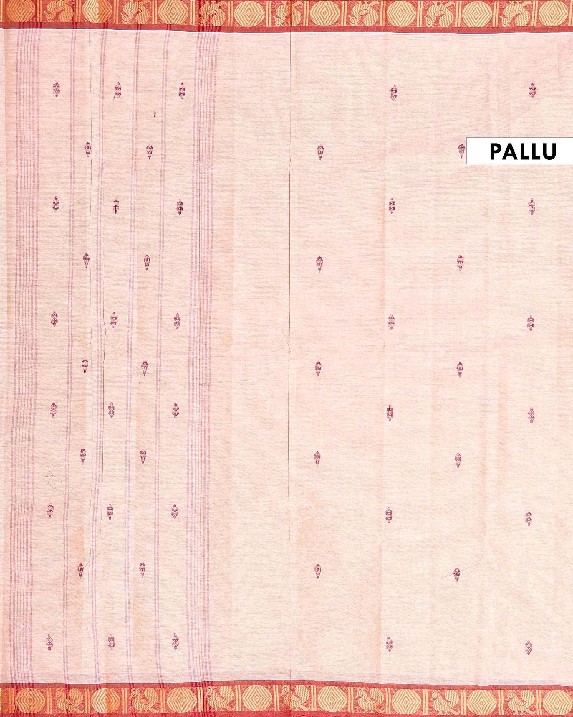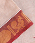 - Experience the charm of a traditional handloom Kanchi cotton saree in a beautiful Light Sandal shade a rich contrasting Maroon zari border with classic peacock motifs.