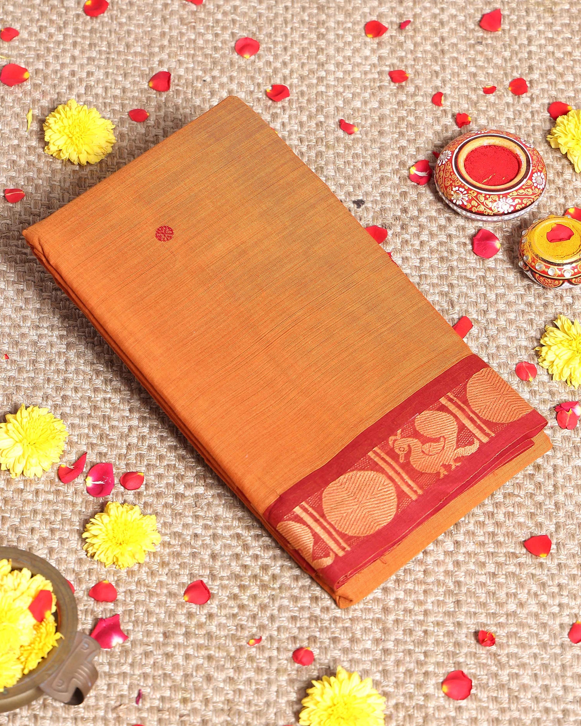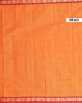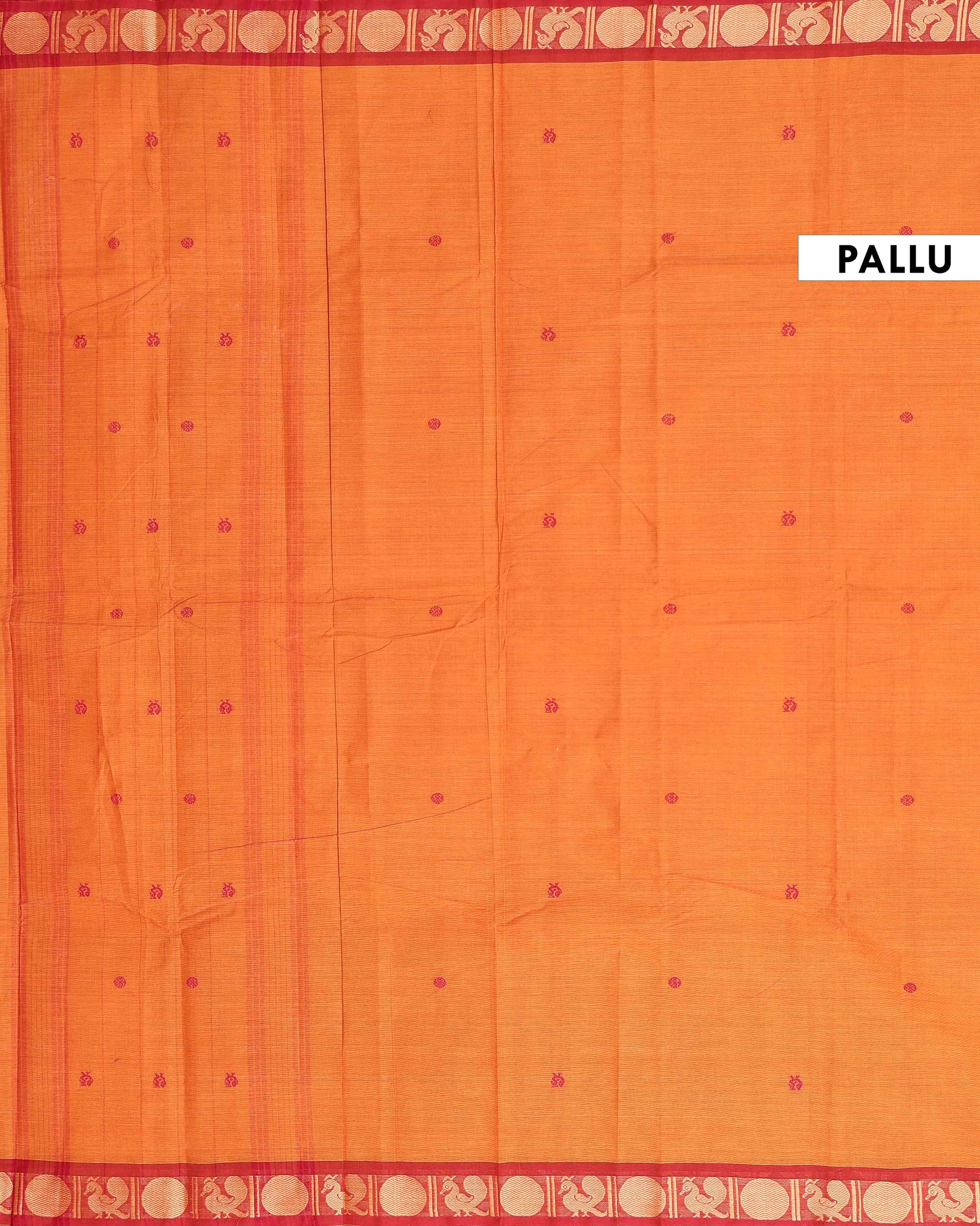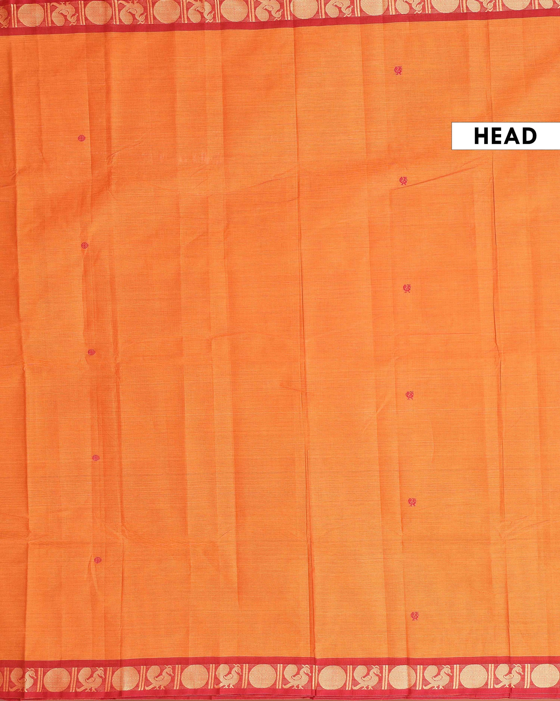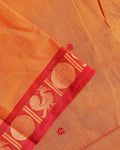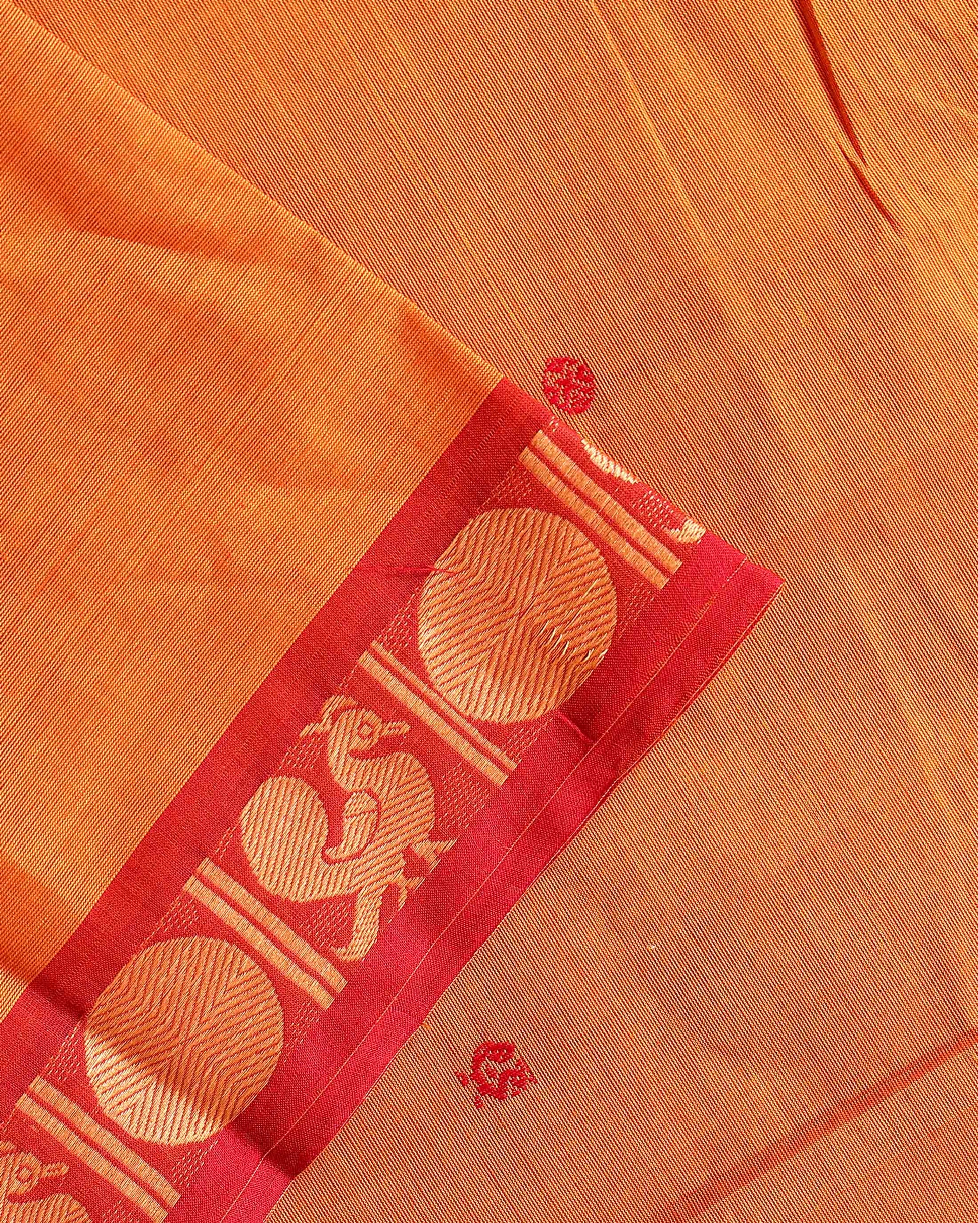 - Experience the charm of a traditional handloom Kanchi cotton saree in a beautiful Orange shade a rich contrasting red zari border with classic peacock motifs.