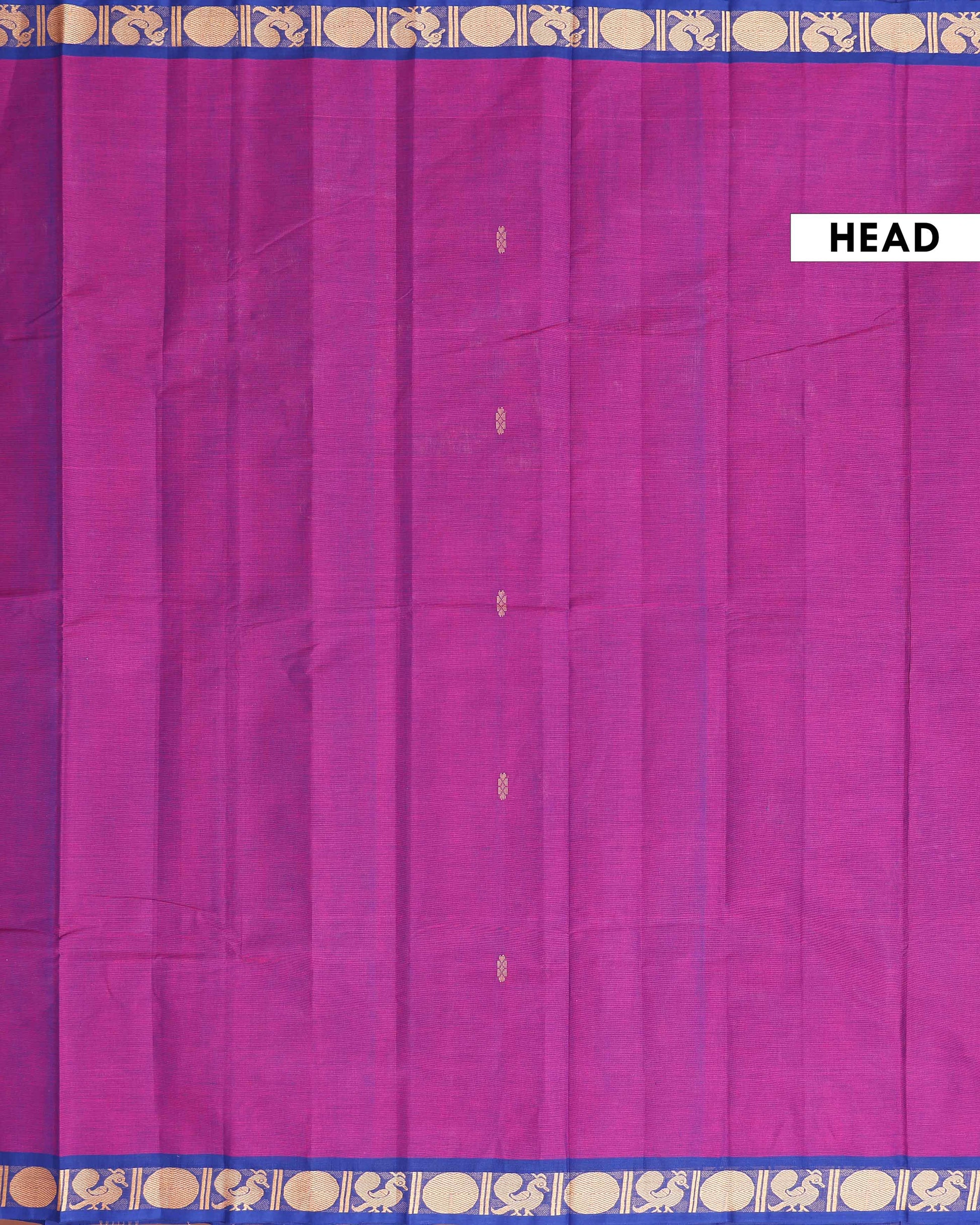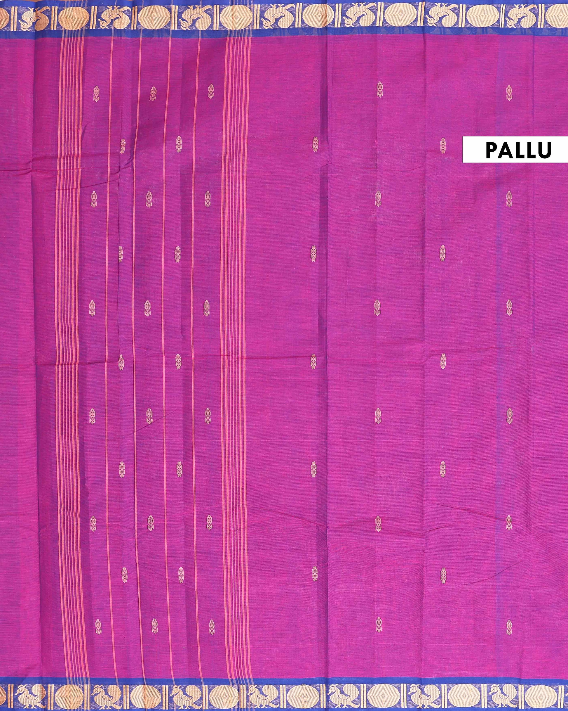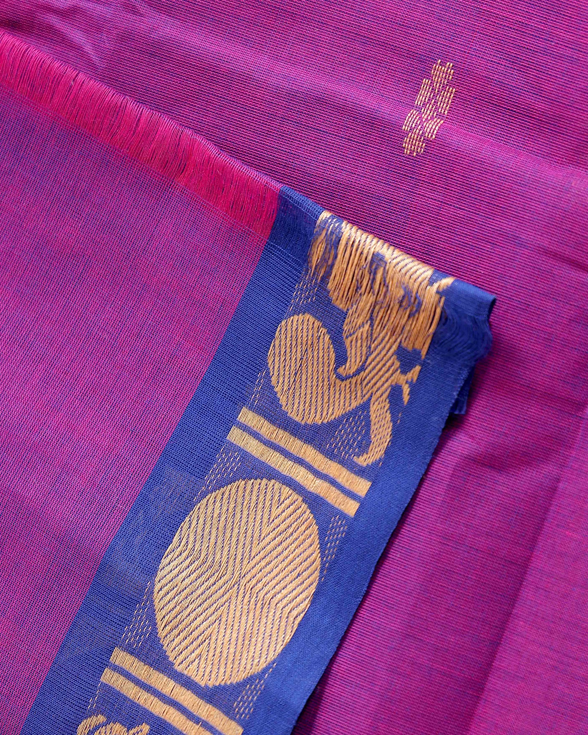 - Elevate your traditional wardrobe with this stunning purple Kanchi cotton saree a vibrant blue border adorned with intricate peacock motifs and golden zari work