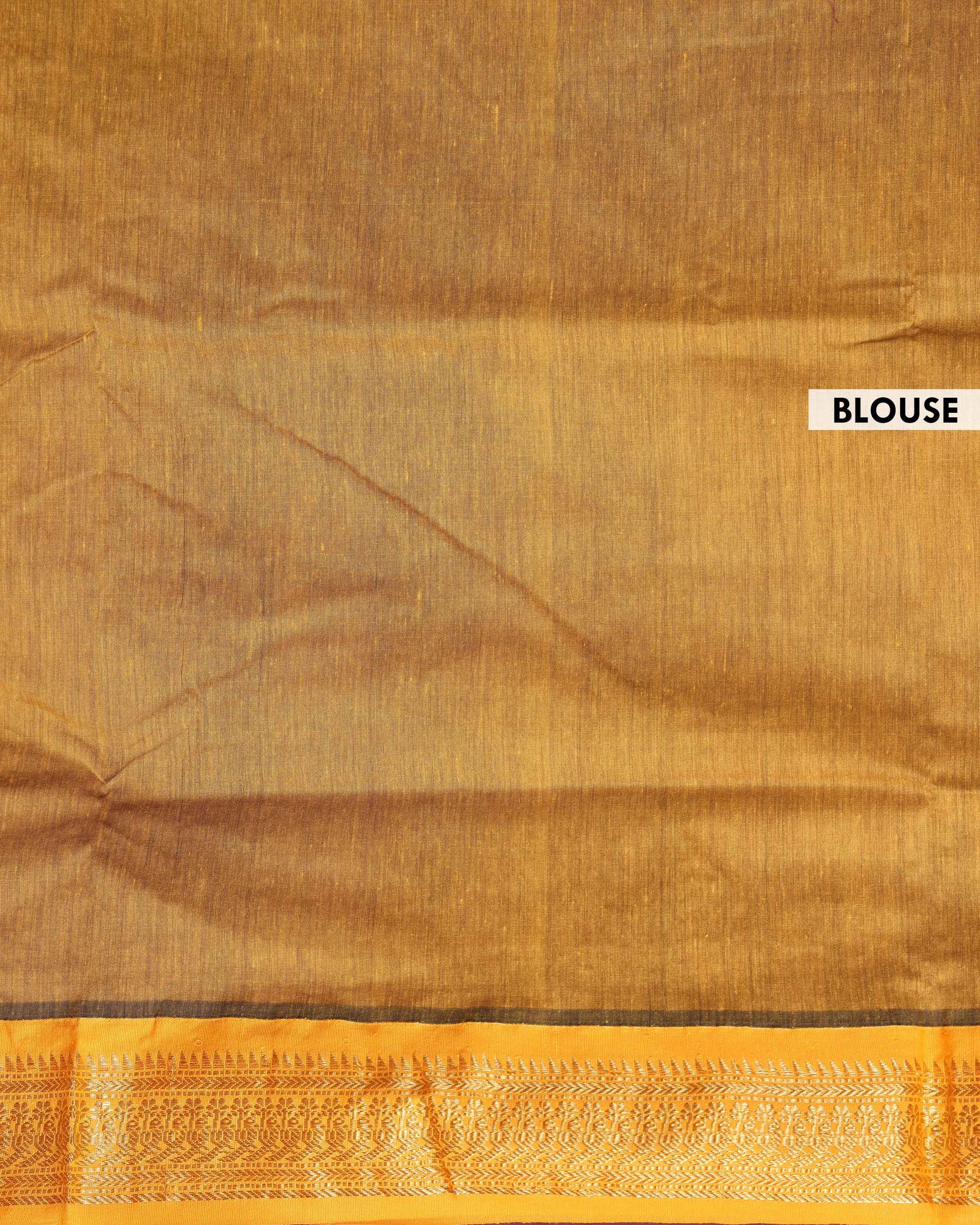 - Crafted from premium Kalyani cotton, this saree features an elegant gold zari border and subtle woven butta motifs, offering a perfect blend of tradition and everyday comfort