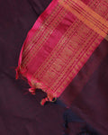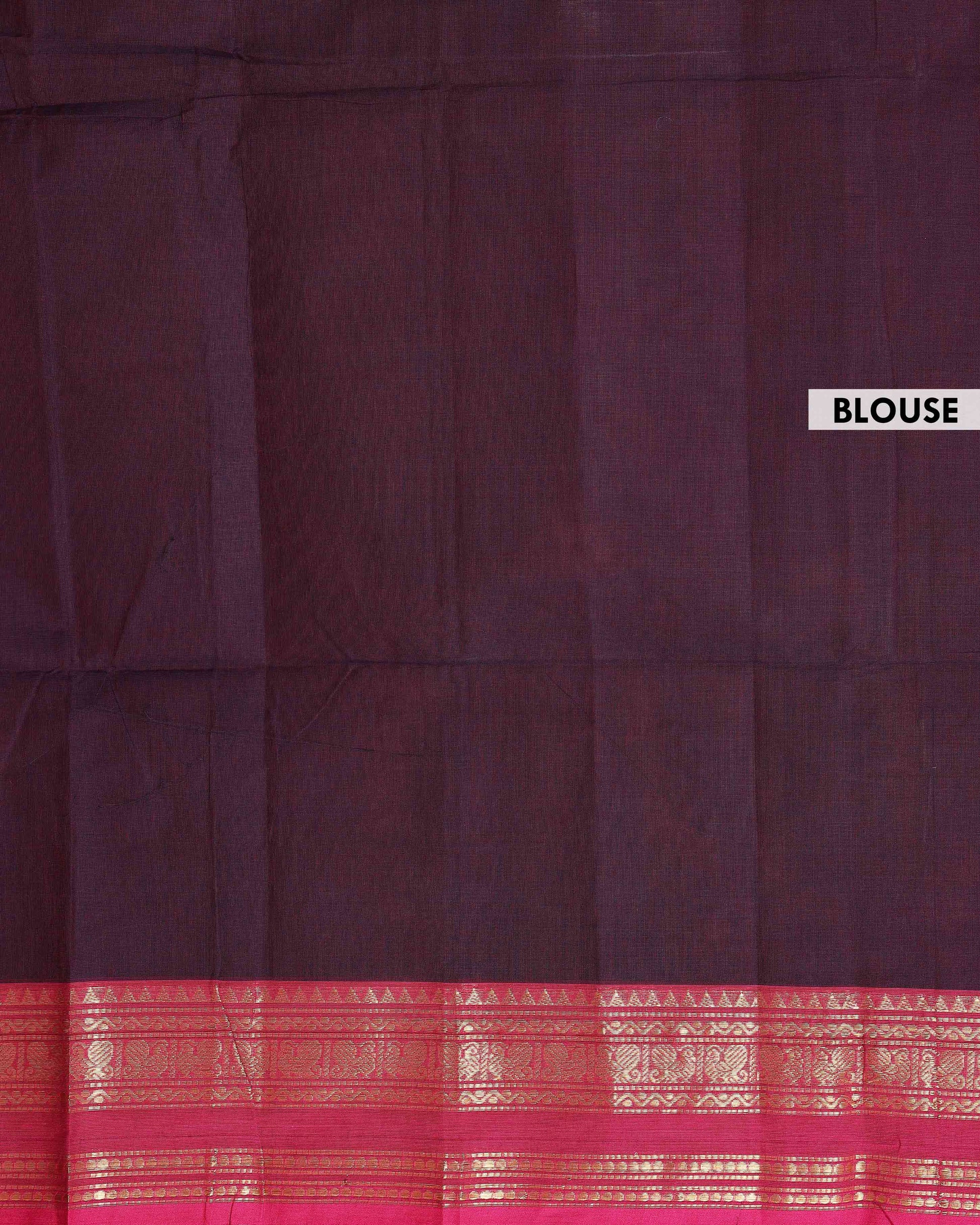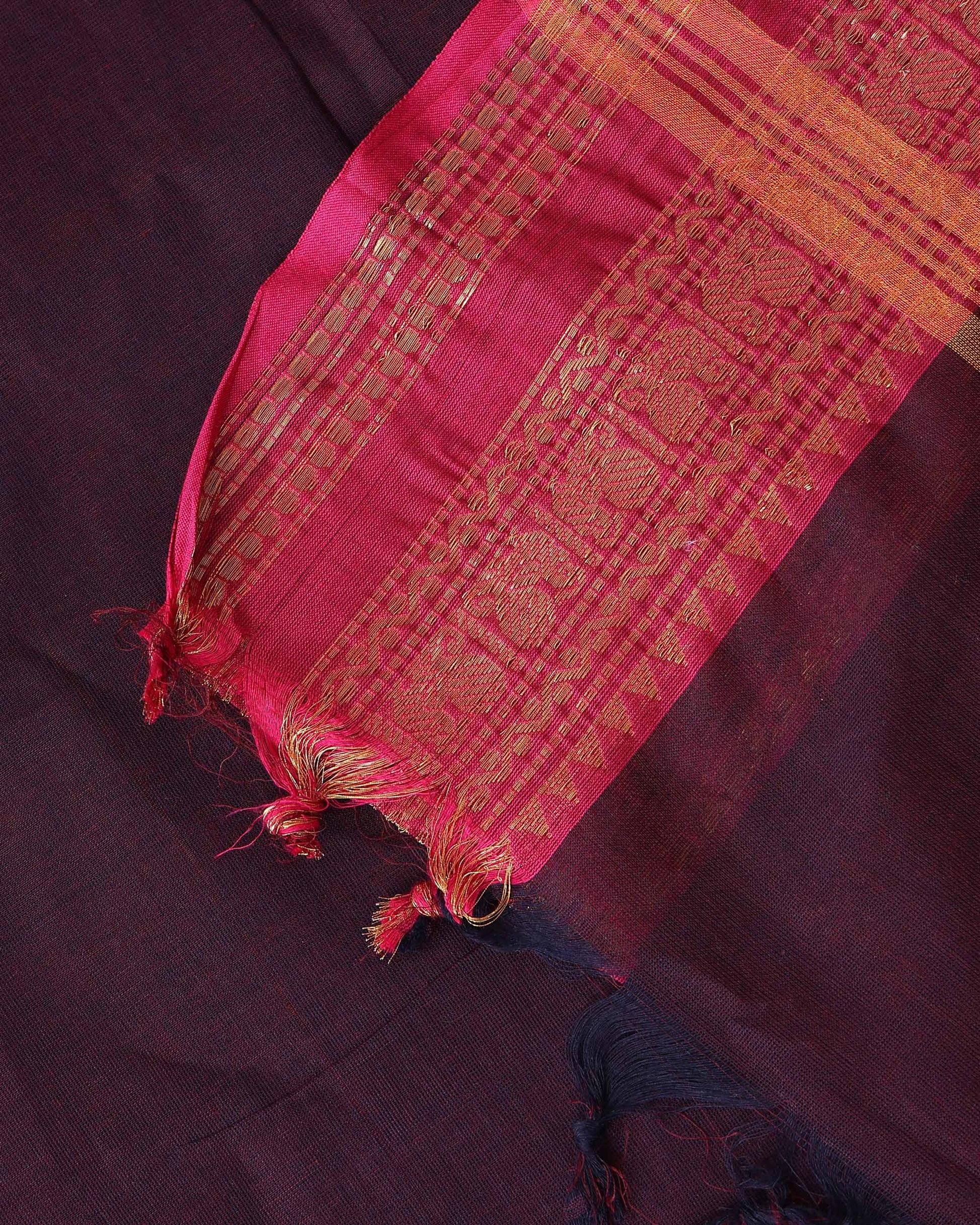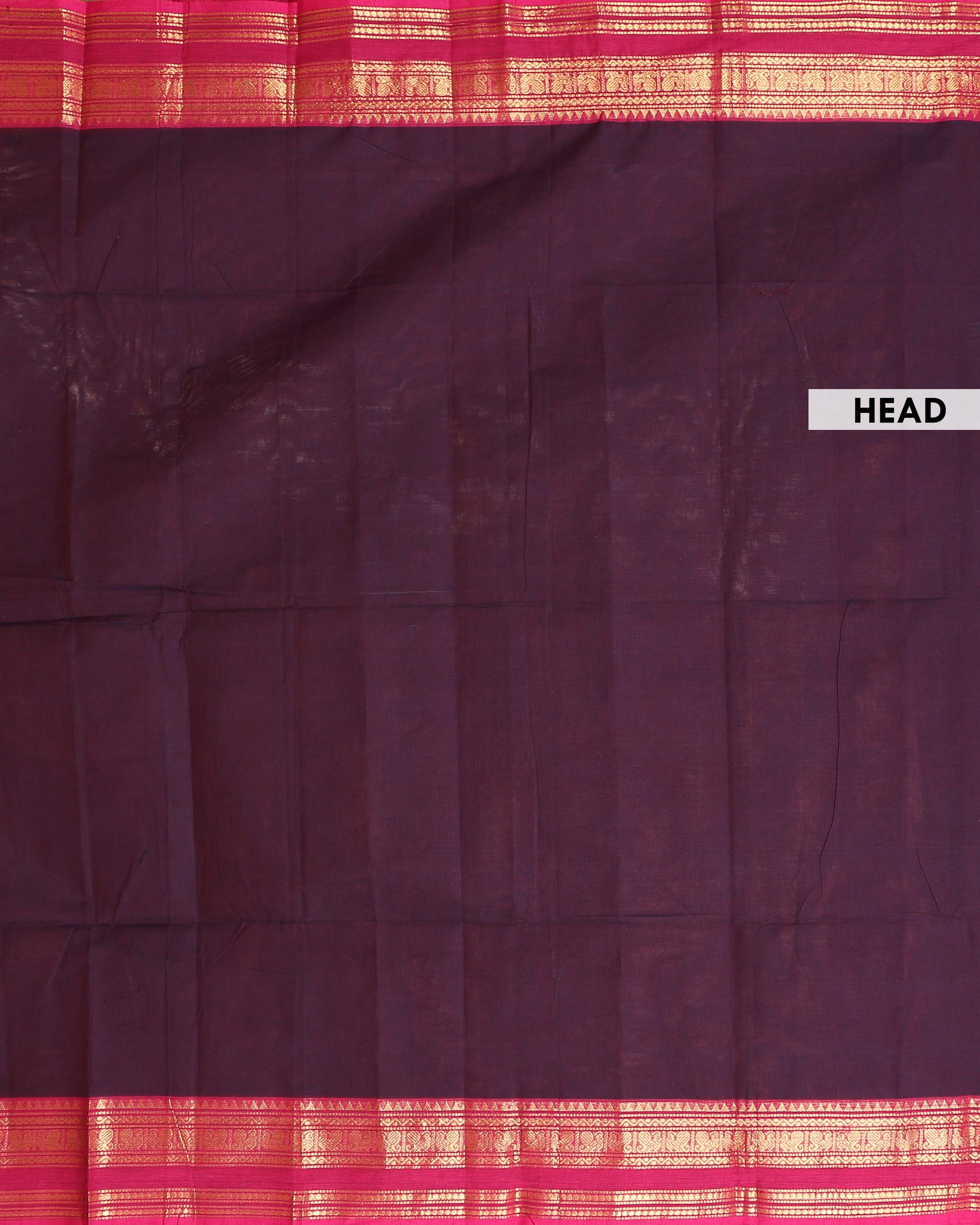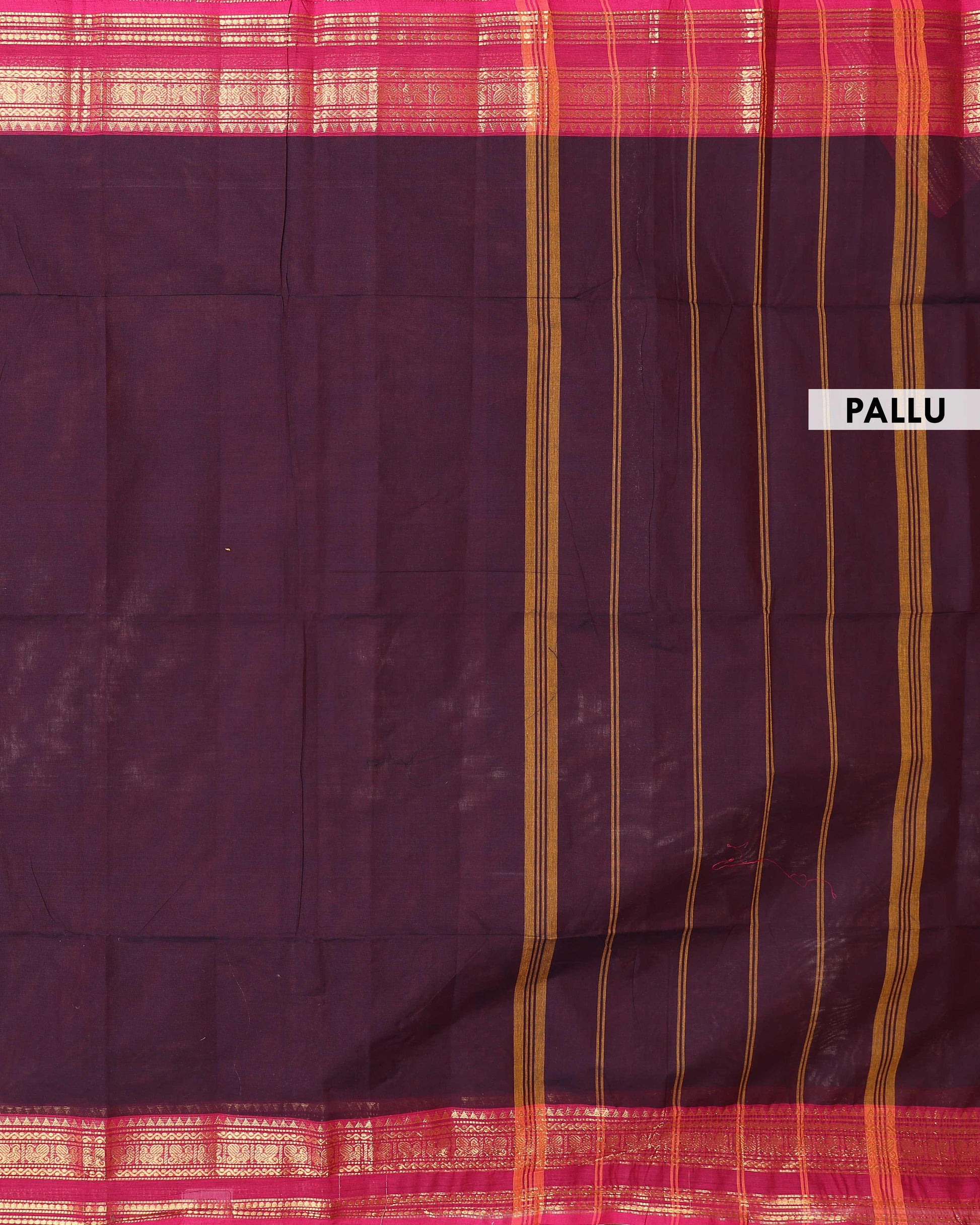 - This stunning Kanchi cotton saree in a rich Dark Purple a vibrant contrasting deep pink border with intricate gold zari work