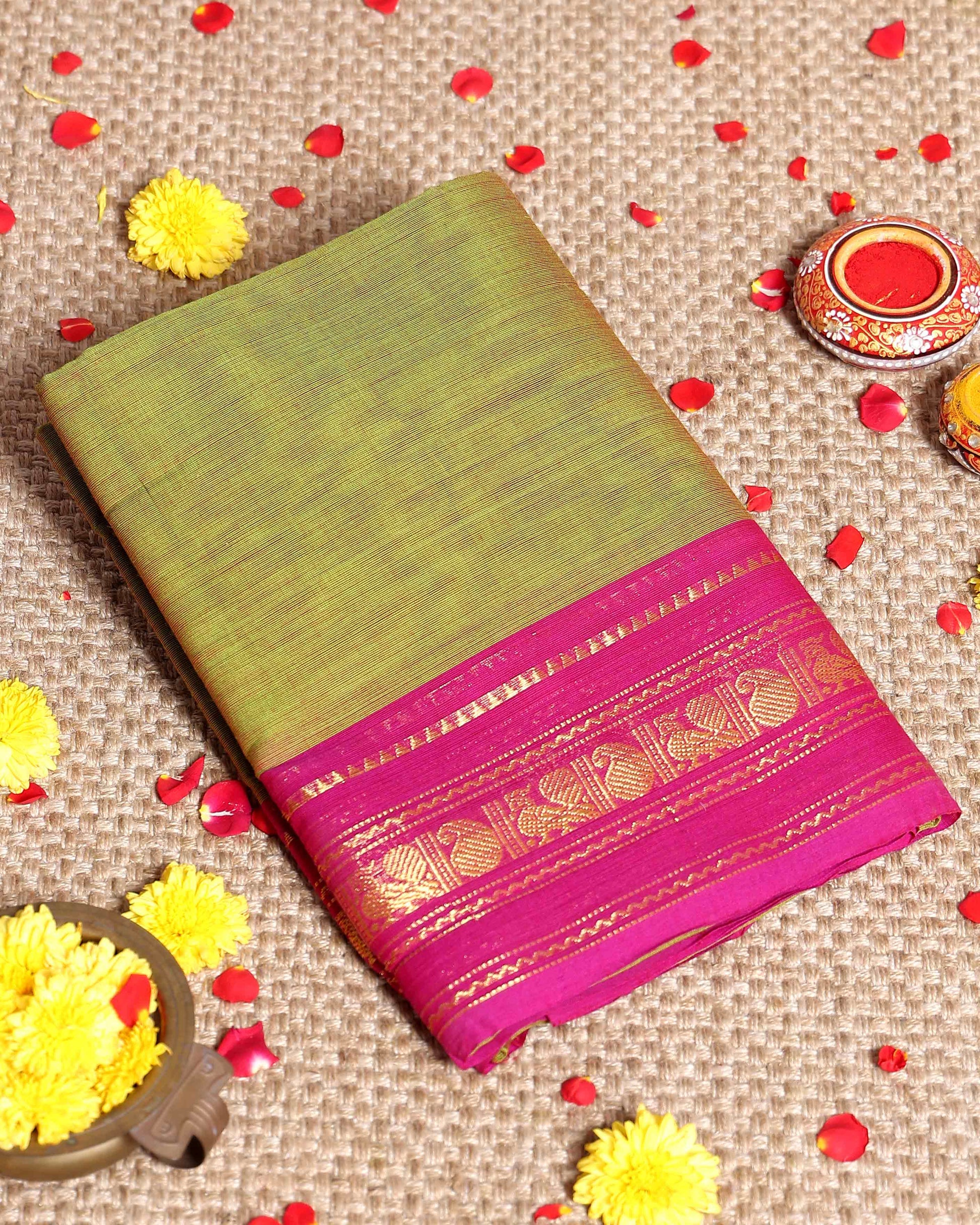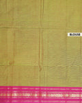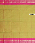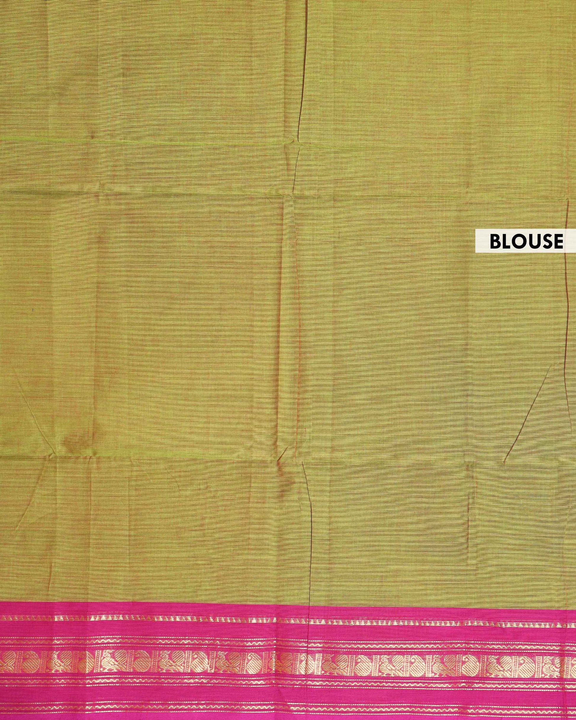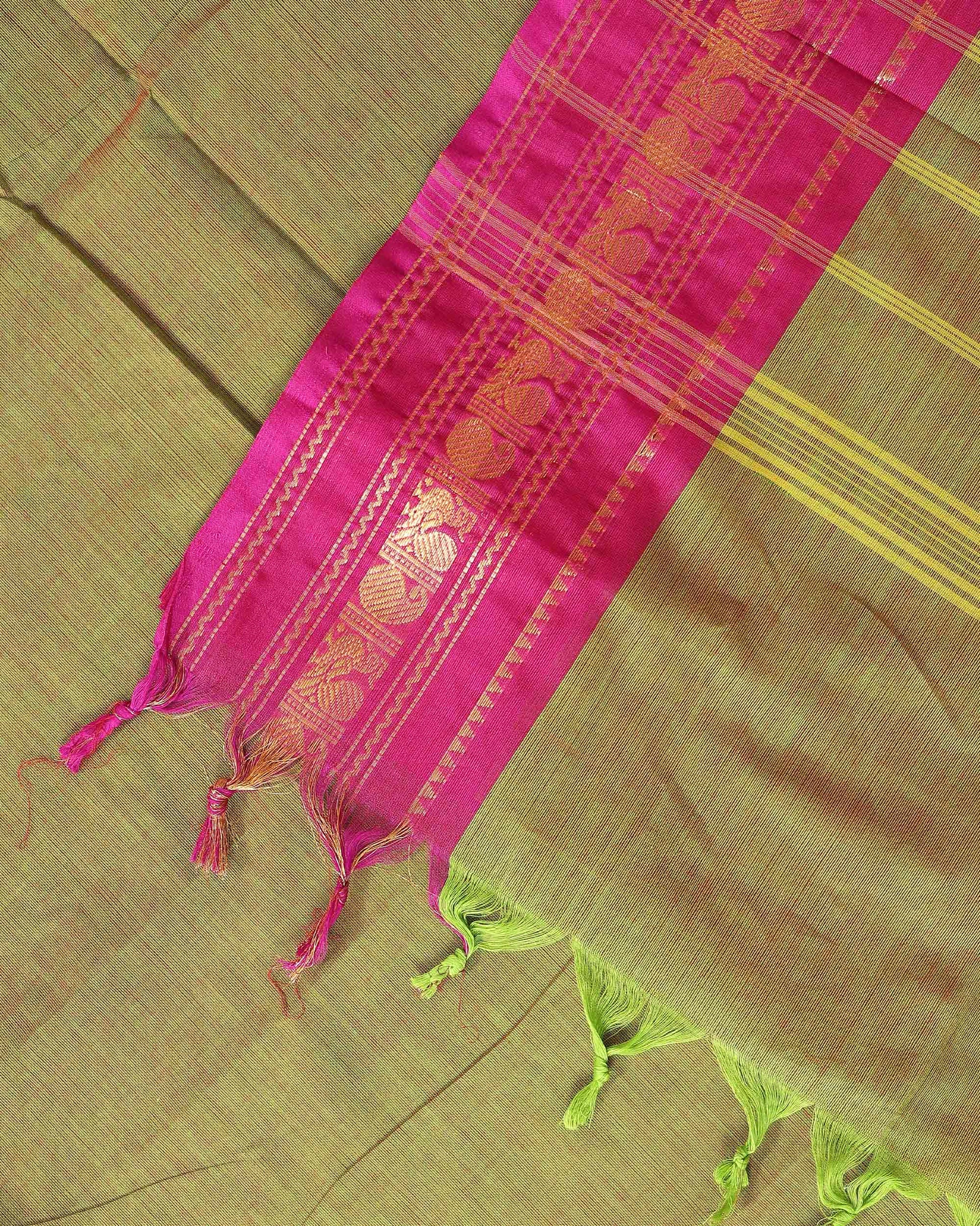 - Handwoven Kanchi cotton saree in a dual shade of green with a vibrant pink border featuring traditional gold zari motifs.