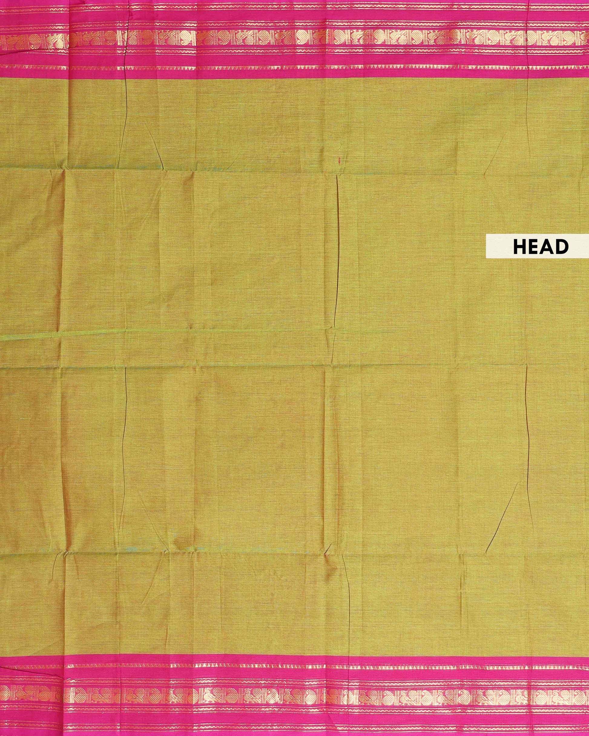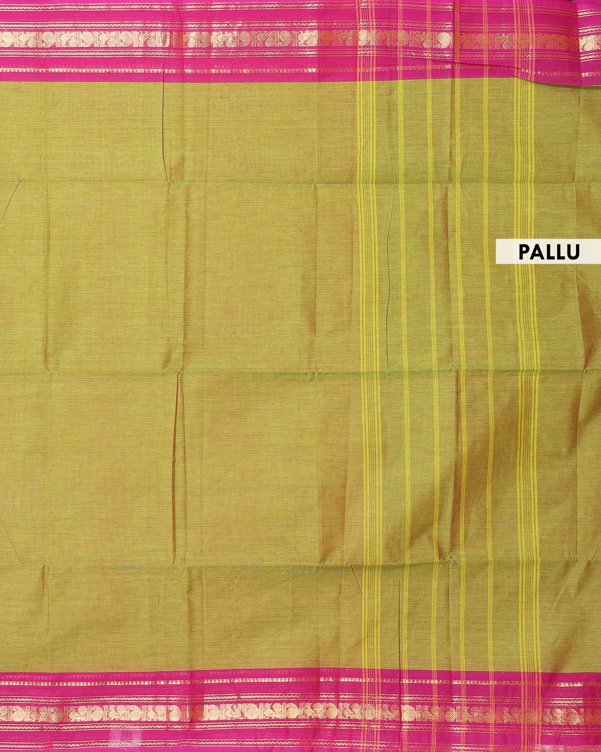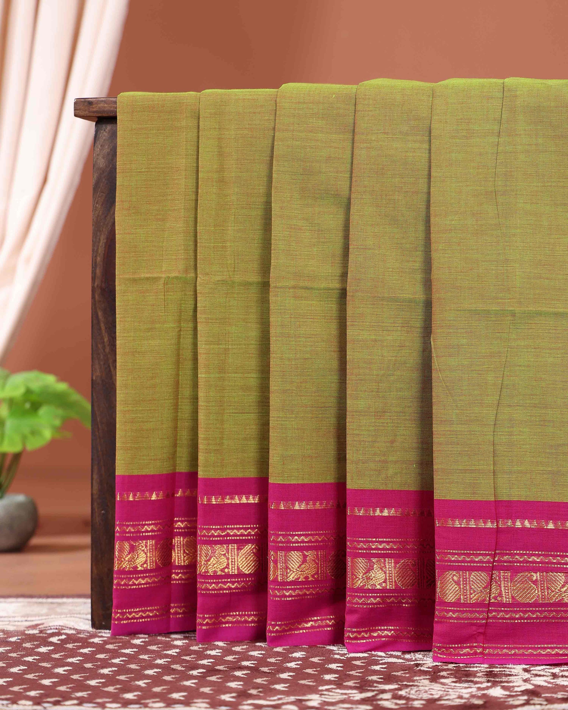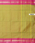 - Handwoven Kanchi cotton saree in a dual shade of green with a vibrant pink border featuring traditional gold zari motifs.