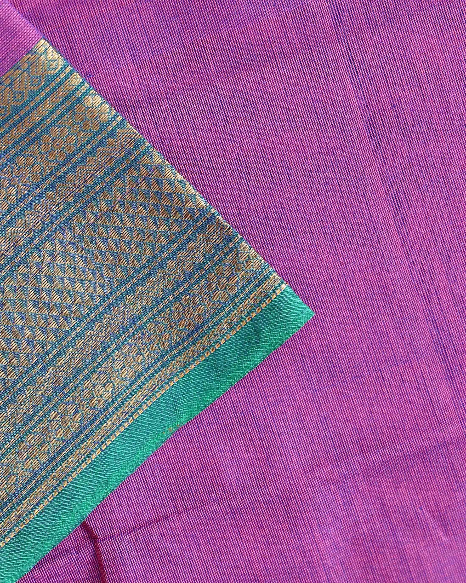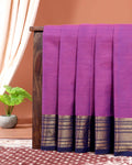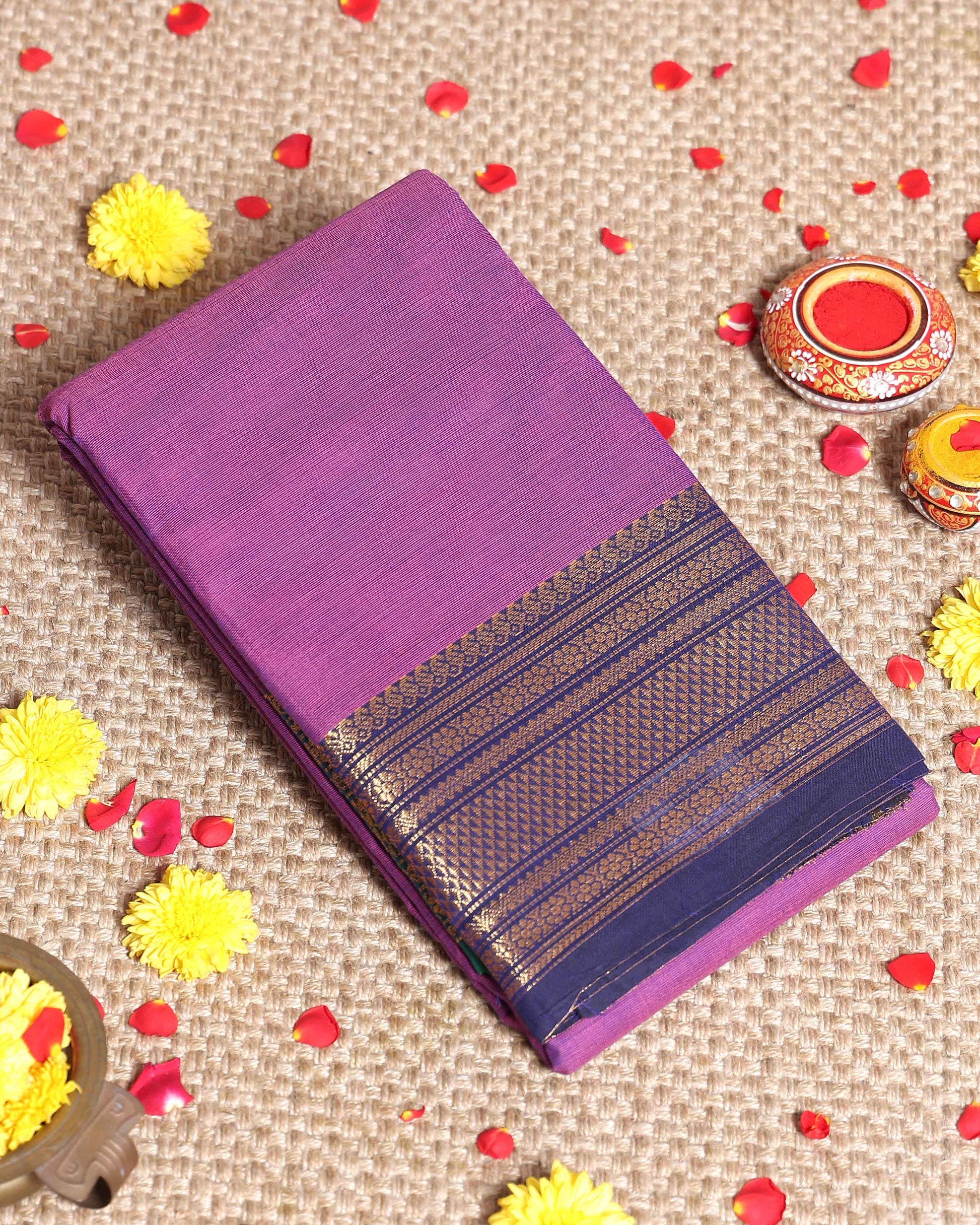 - This stunning handwoven Kanchi cotton saree in a rich purple a contrasting dark blue border with intricate gold zari work blending traditional elegance with comfort.